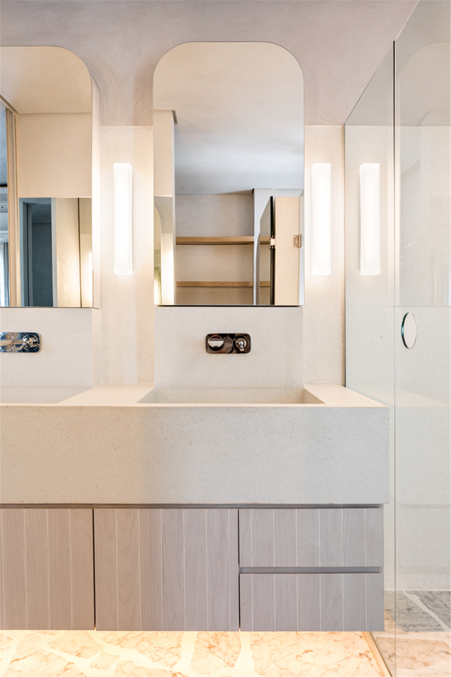 卫生间双镜子和洗漱台的设计满足了双人同时使用的需求,暖色系的灯光给予了小空间不一样的温暖氛围。