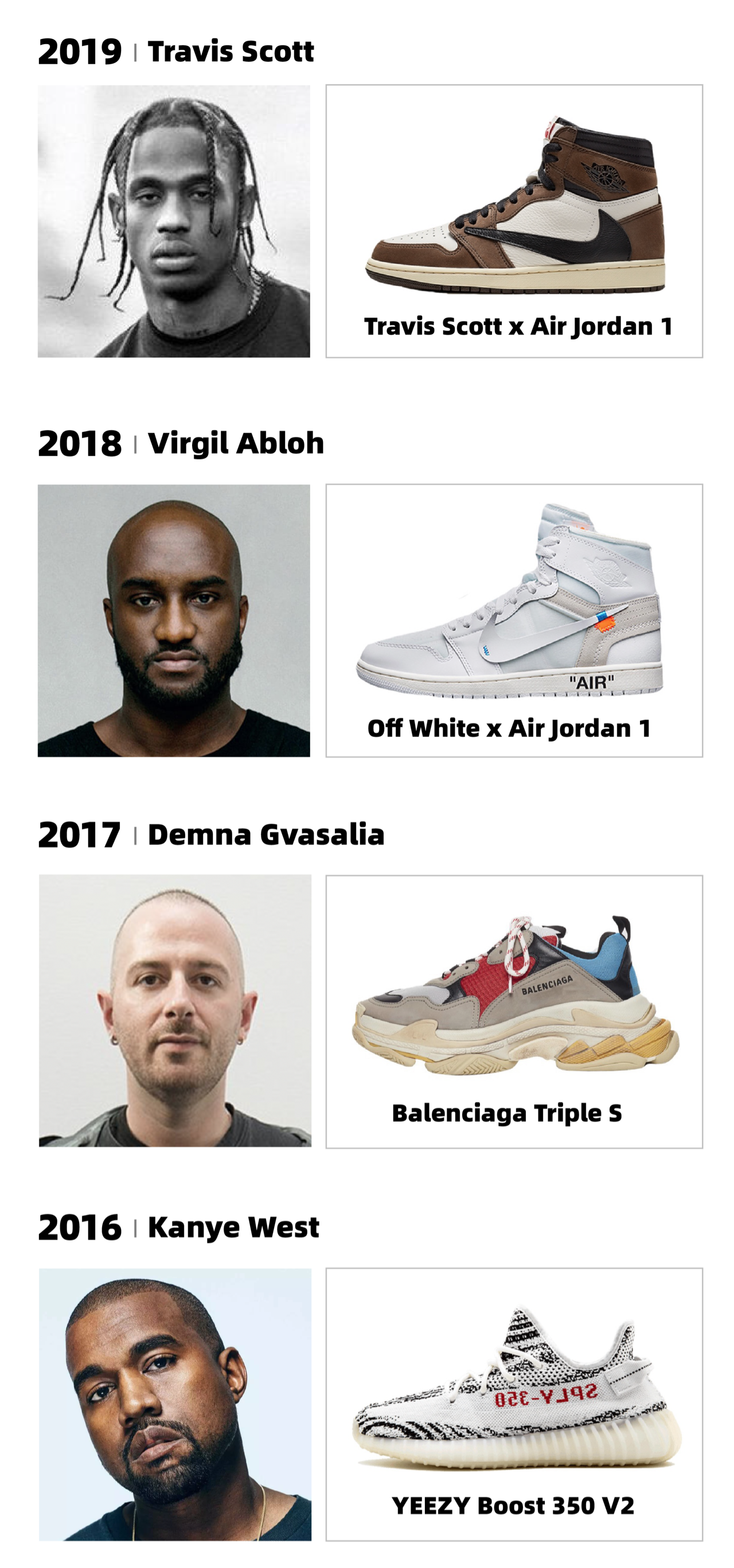 19年 Travis Scott「倒钩」设计,创意+话题+销量,全球起飞;18年,第二波 Virgil Abloh「The Ten」鞋圈重磅炸弹,助推解构趋势;17年,Demna Gvasalia 设计的巴黎世家「老爹鞋」,带动全球流行;16年,Kanye West 的 Yeezy 350v2 风头一时无两,帮 adidas 拿到年度鞋王。