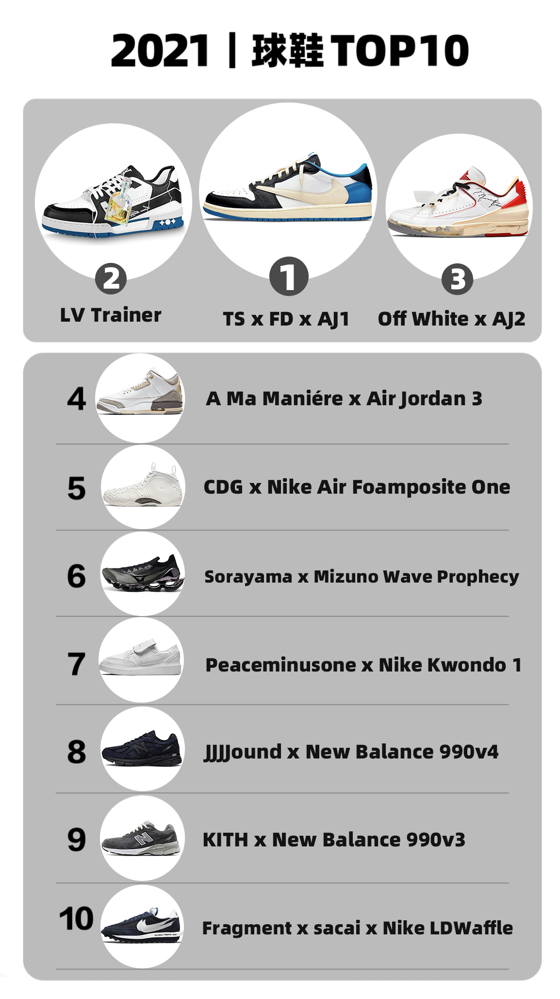 到了 2021 年,这种疲态更是愈演愈烈,除了 Travis Scott x fragment x Air Jordan 1 三方联名,真正激起水花,成为年度鞋王,以及 LV Trainer 继续 Keep 热度,其它球鞋并未成为后生力量,“助推”整个球鞋圈。