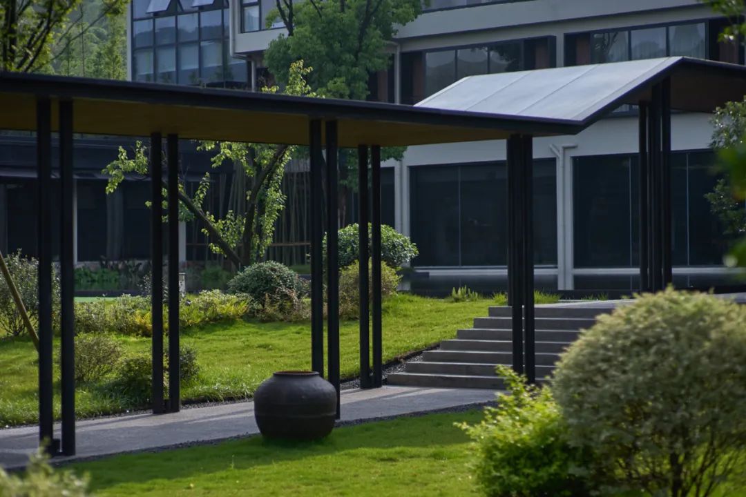 庭院中间,一条笔直的风雨走廊把整个庭院的草色、倒映着宋制式建筑的水景直接送到你的面前。你不用着急地去哪儿,慢慢走,再四下回望、停留,这里的一小片天地,此刻便只属于你了。