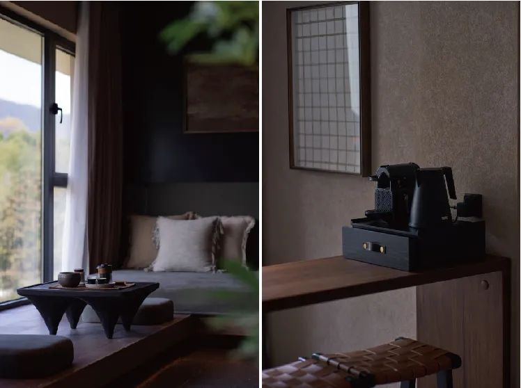 带着一种“似曾相识”的亲切感继续往里走,独占一面山景的侘寂风小木屋立于眼前,透着隐秘气息,让人产生一种立刻办理完入住,再去一探究竟的冲动。