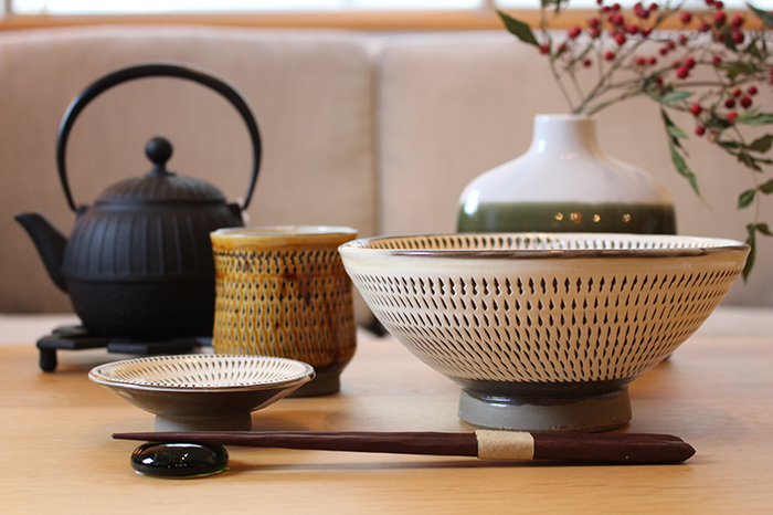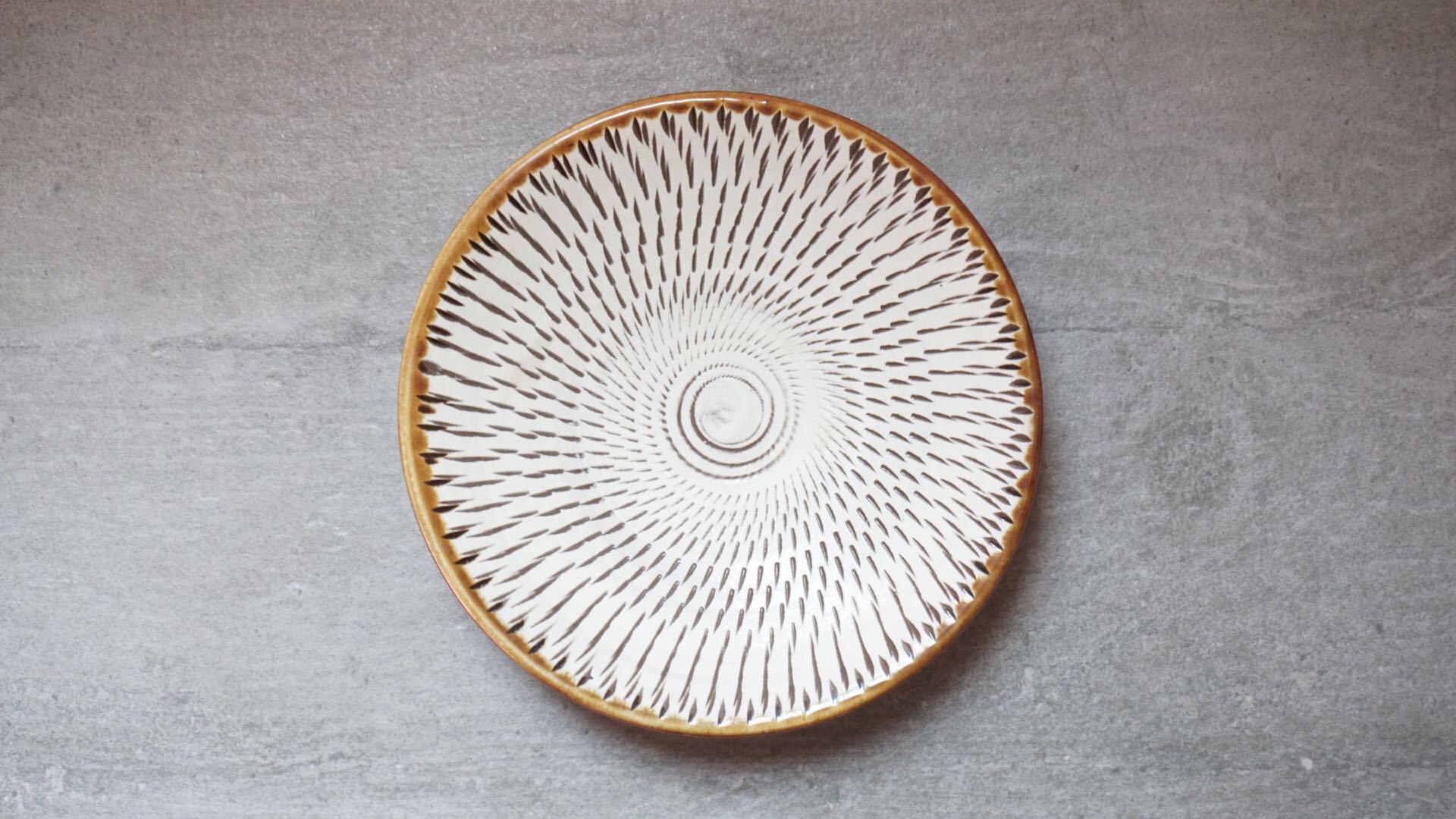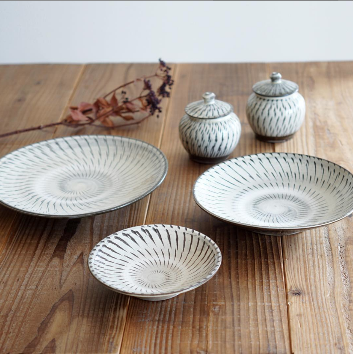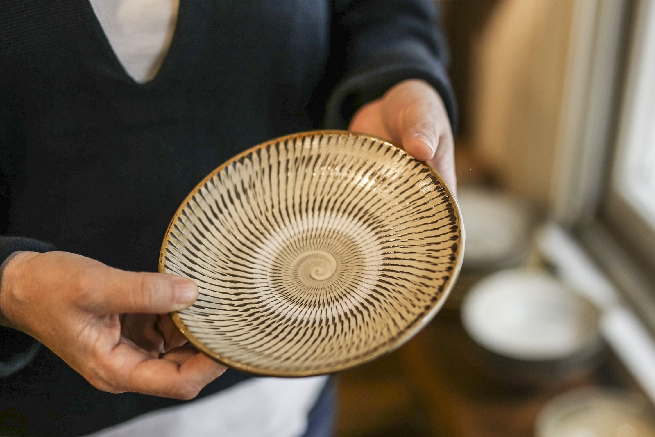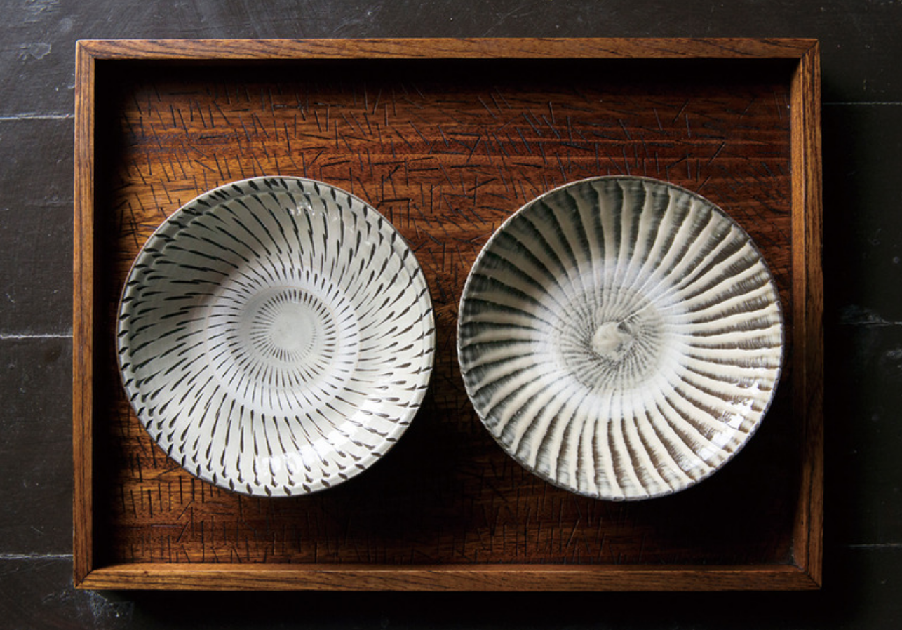 小鹿田烧采用朝鲜系的“登窑”来烧制,其器皿的主要外型特征是使用工具所刻划出的几何纹路,如“飞铇”、“刷毛目”、“栉描”等。而非常有名的「飞铇」则是使用具有弹性的金属工具在陶器上制作的连续花纹。