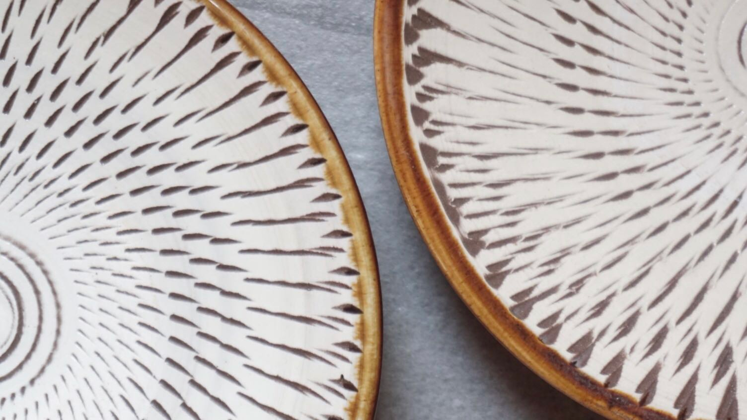 △ 小鹿田烧的代表之作飞铇(左)和刷毛目(右)
