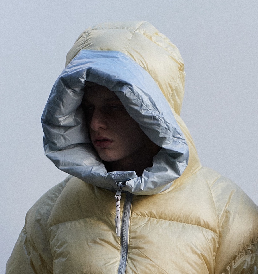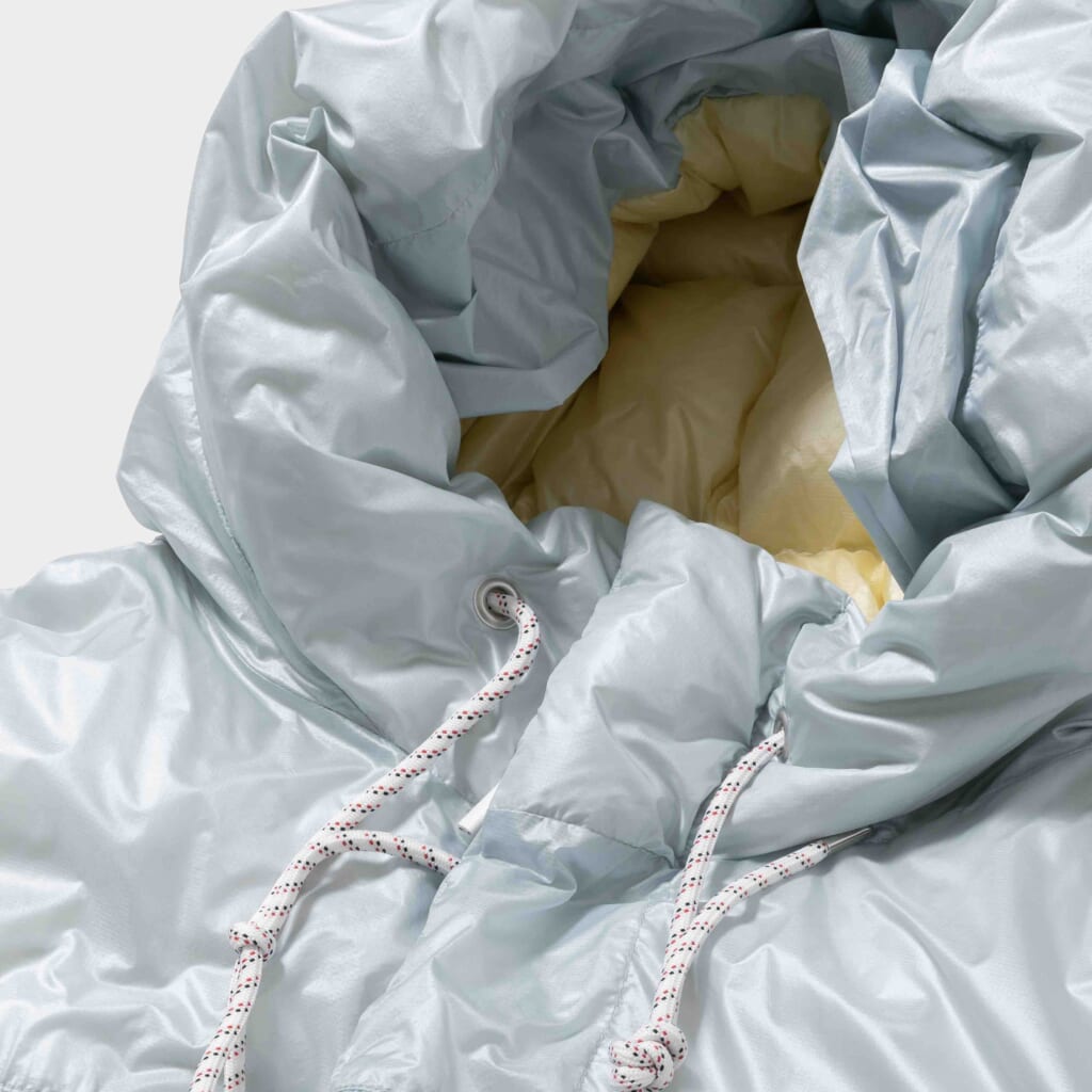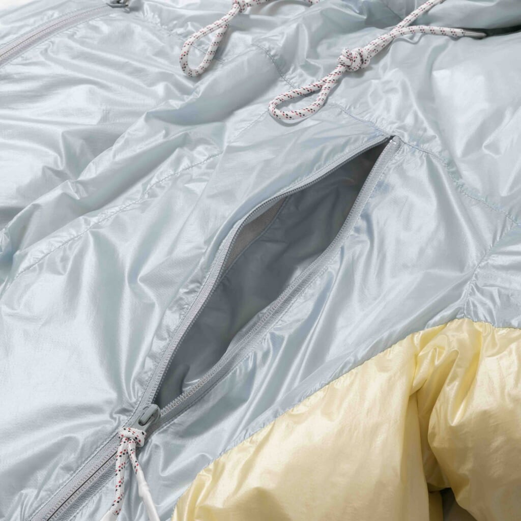 sleeping bag down coat 提供 black x navy 与 saxe x yellow 两种配色选项,分别拥有截然不同的 2-way 设计。其中 A 面通过最大限度减少拼接,以呈现城市风格;B 面则采用绗缝式设定,让人联想起户外场景。此外,这款羽绒服还搭载可伸缩头罩,其结构与睡袋相同,旨在强调防寒,可全方位覆盖头部;同时,若将兜帽收纳在衣领处,还可作为立领使用。据悉,这款以睡袋为灵感的羽绒服现已通过 beautiful people 直营店及官网发售。