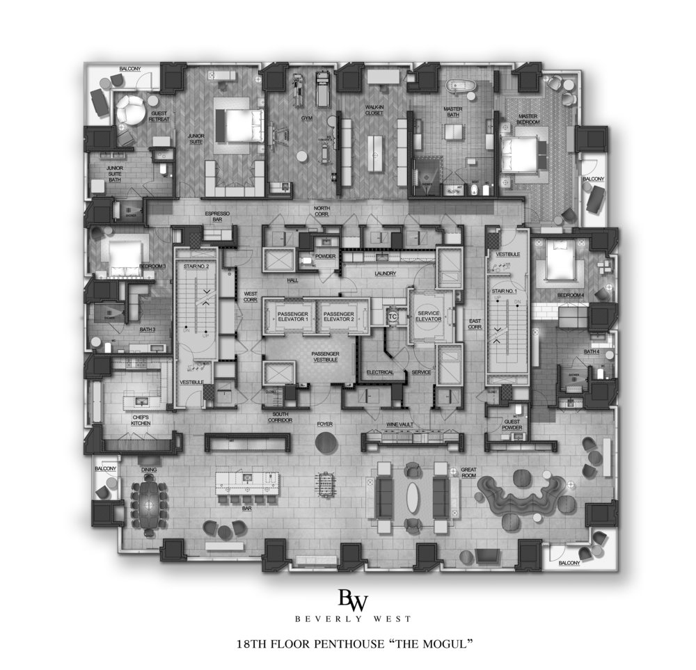 它的总面积达到 763㎡,却仅有 4 间卧室、 4 间浴室,主卧室位于公寓右上角、面向超东,高级套房位于左上角、面朝西边;其他两间卧室分别朝向南北面;客厅、餐厅、起居室则位于公寓下方。