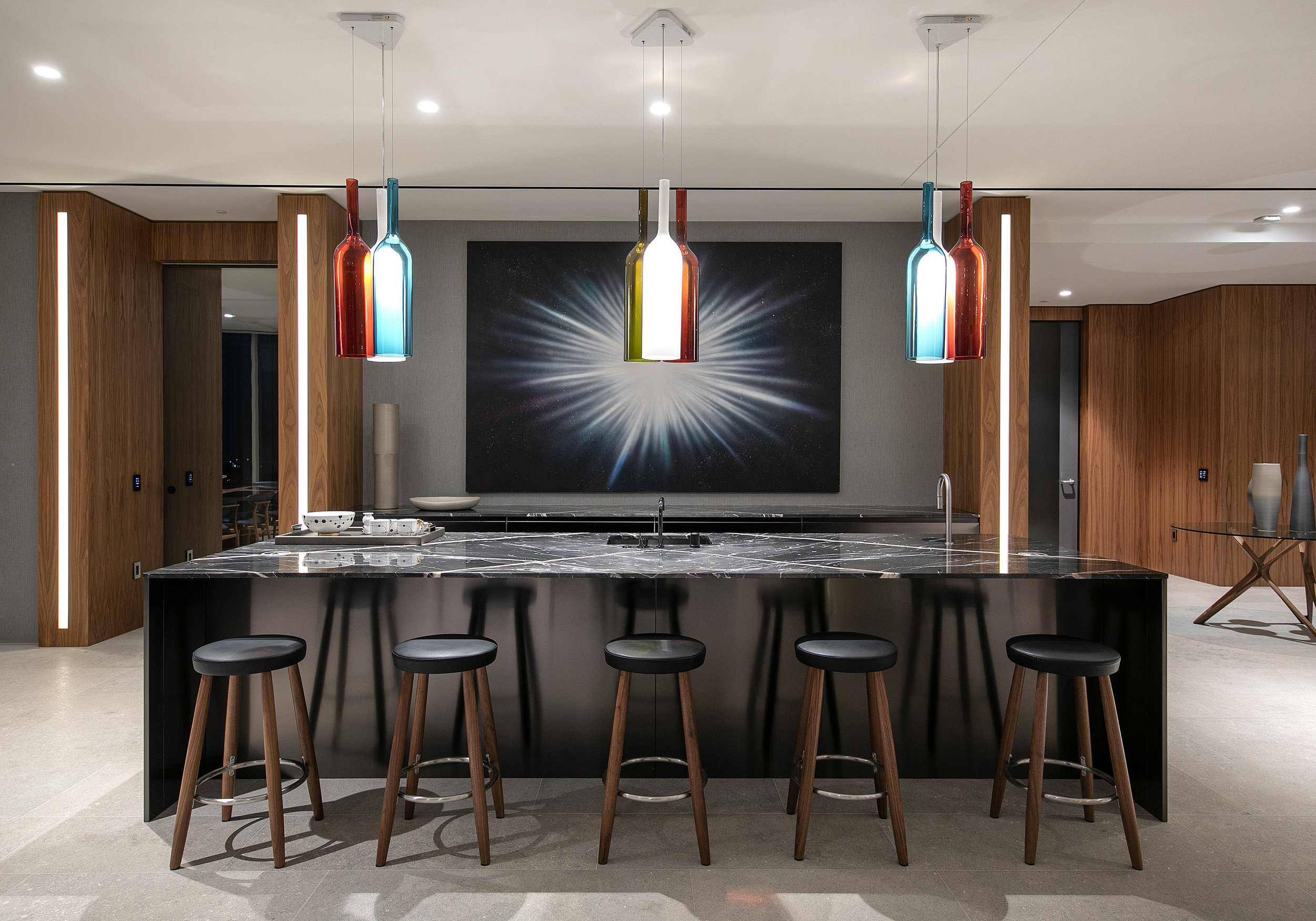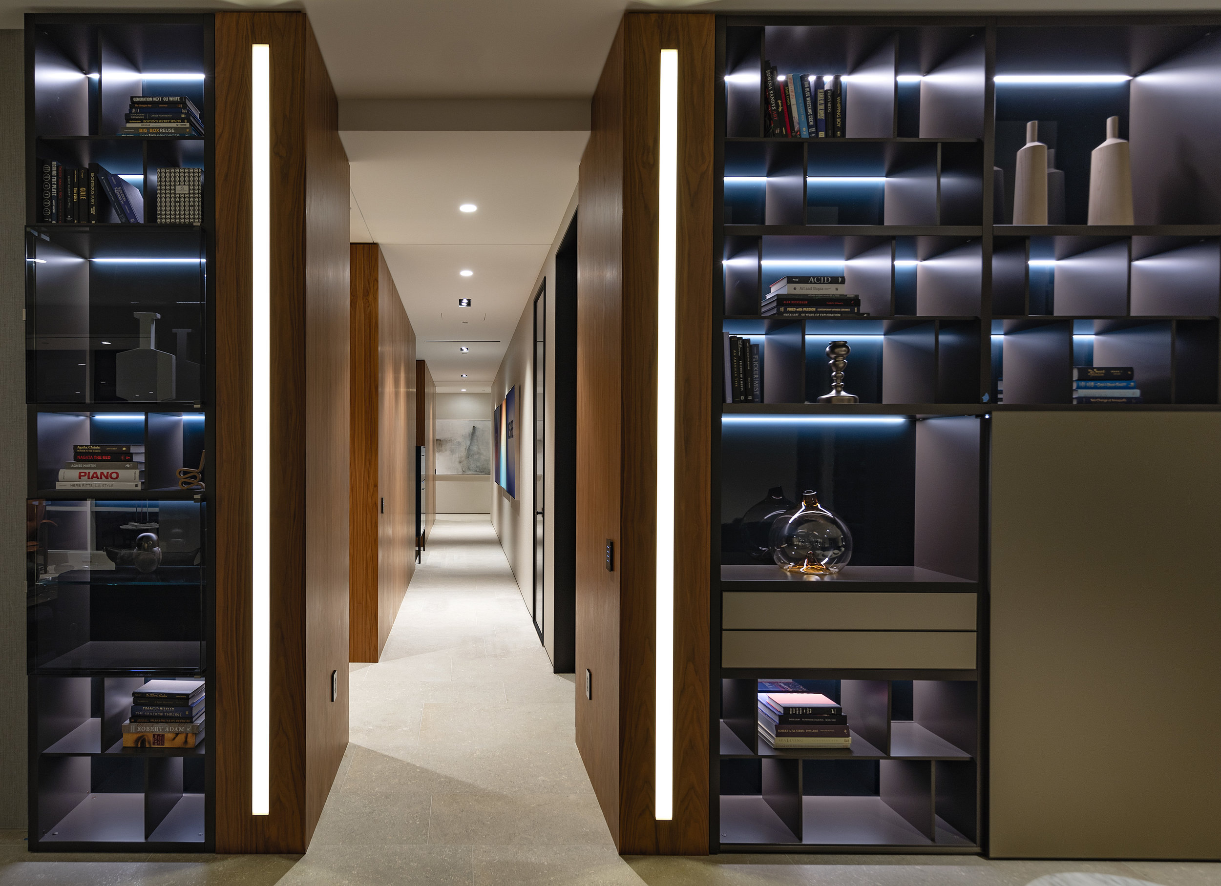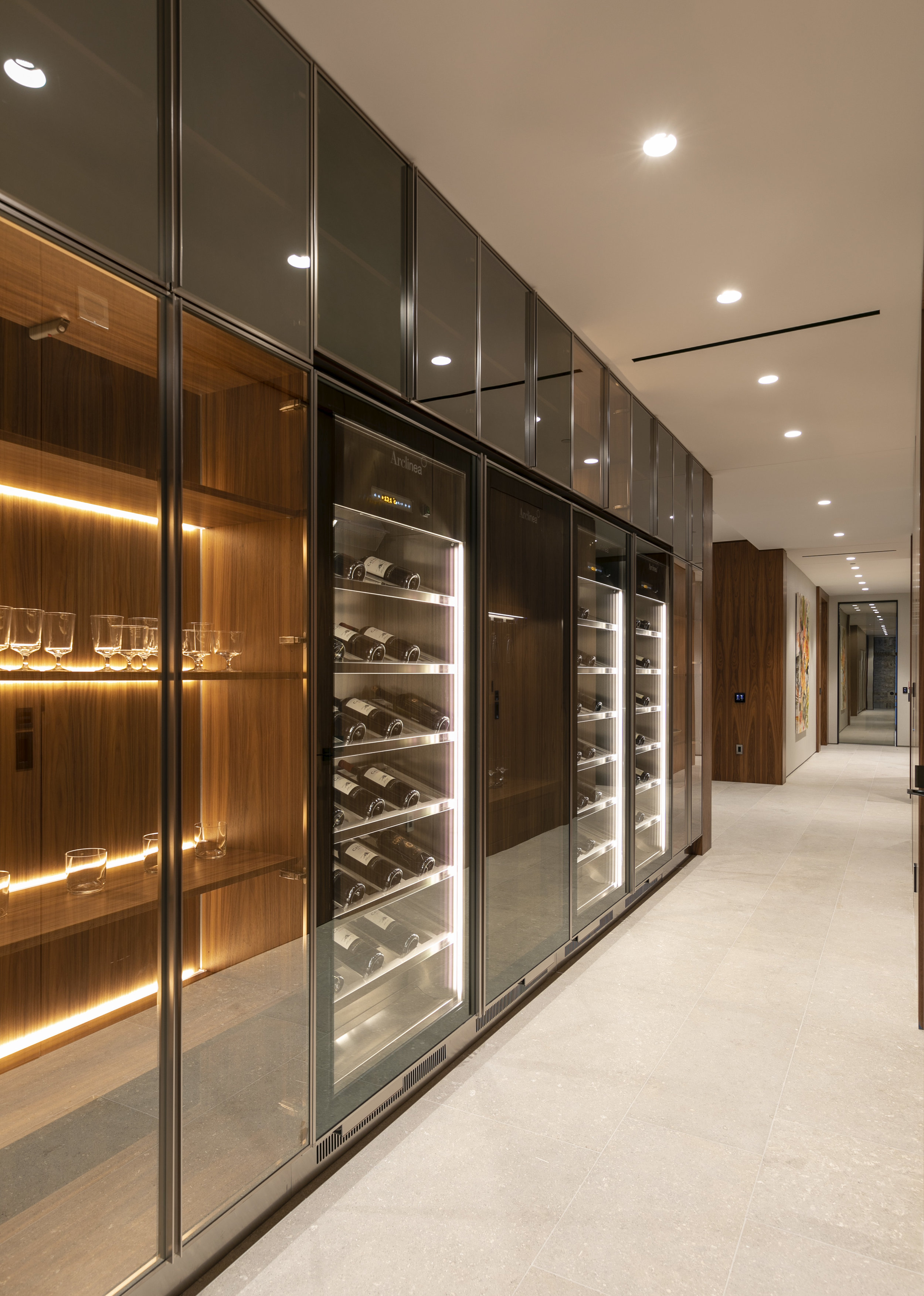 开放式橱柜内侧装有隐形灯带,冷调蓝光映衬出独特未来感。走廊一侧的 Arclinea 玻璃酒柜也是从意大利定制的,全高的尺度气派非凡。
