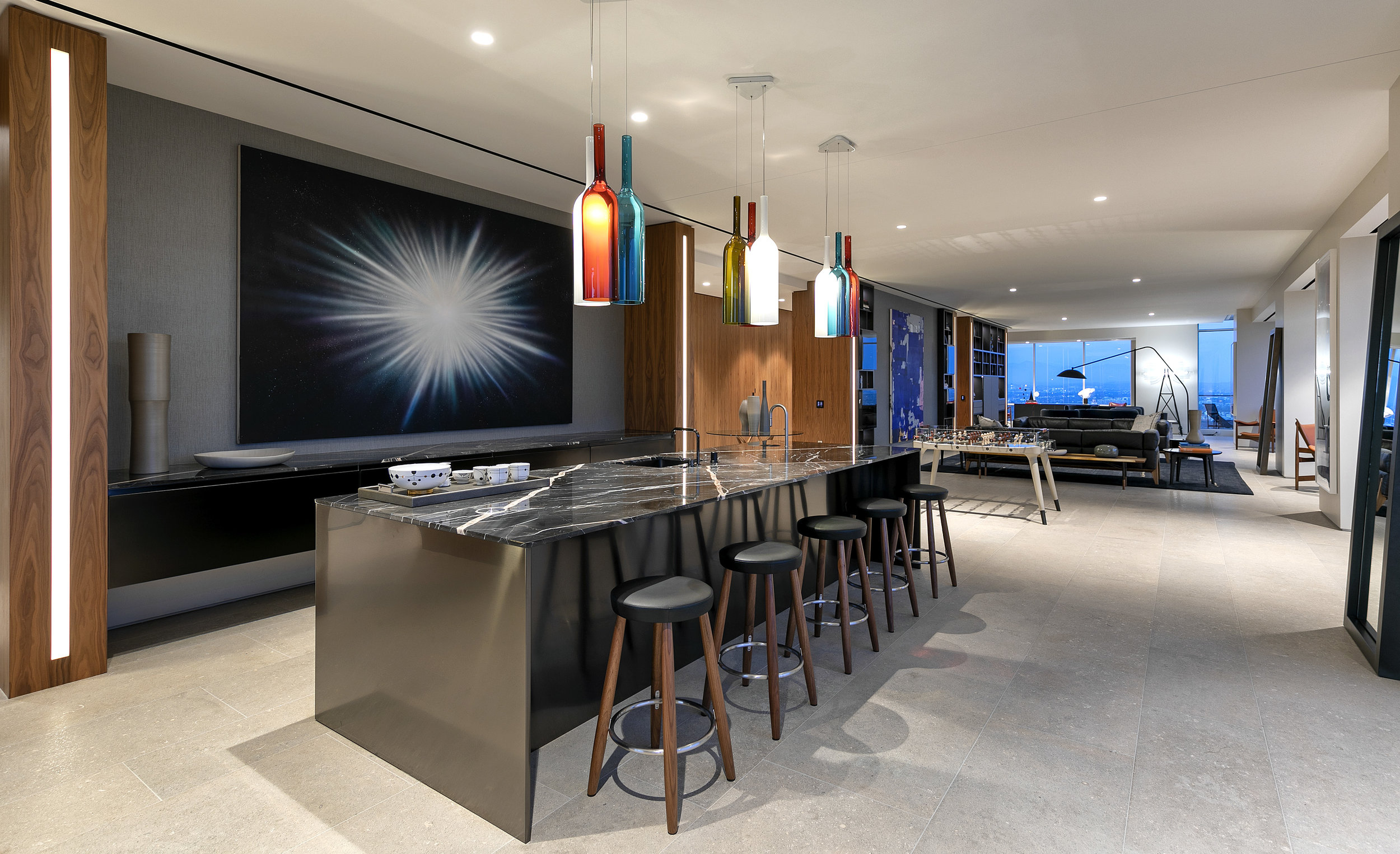 这套位于 19 层的公寓名为 The Entertainers,面积 763㎡,包括 3间卧室、4间浴室,以及按摩室、宴会厅等休闲娱乐设施,可以说为开 party 而生。