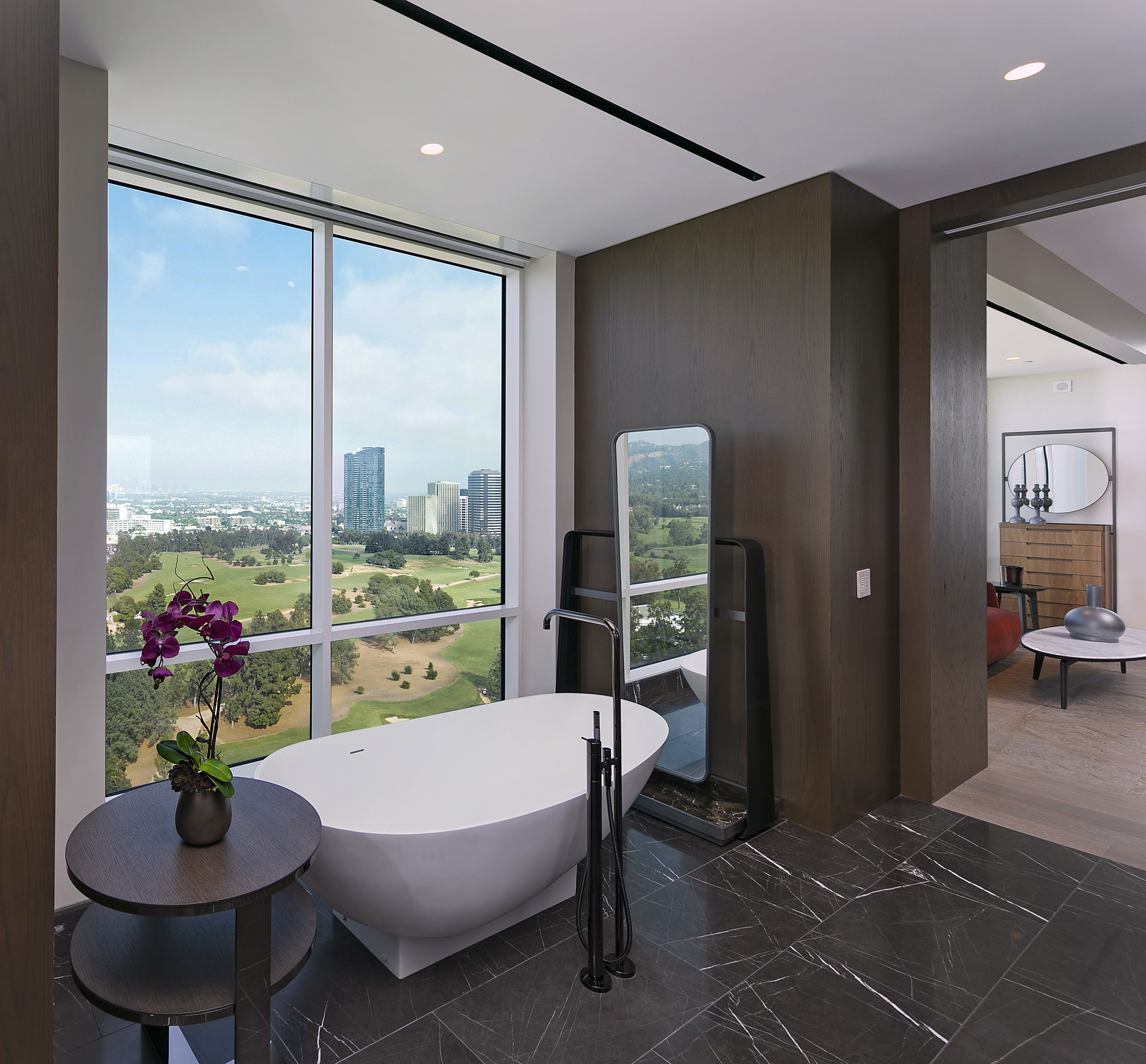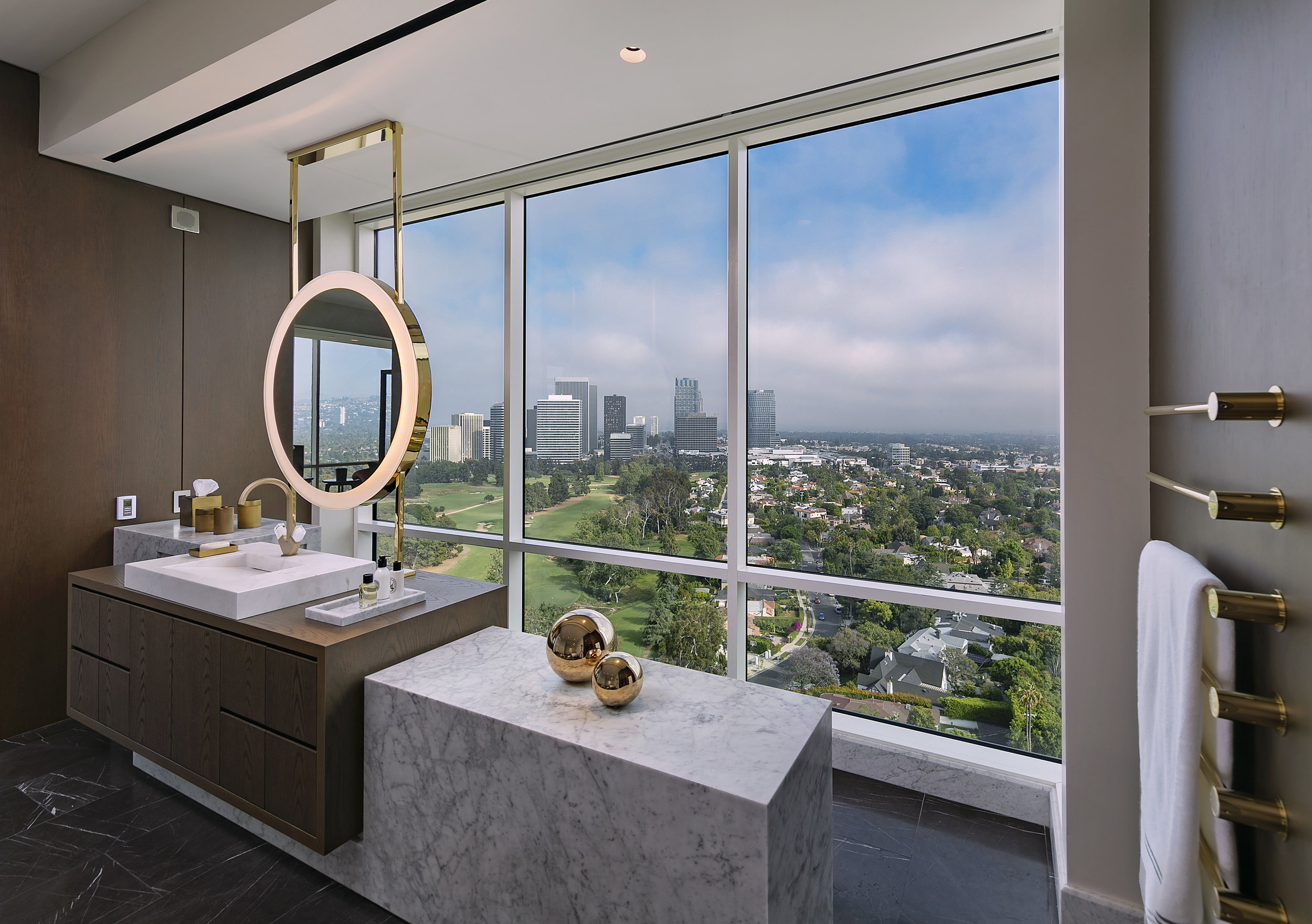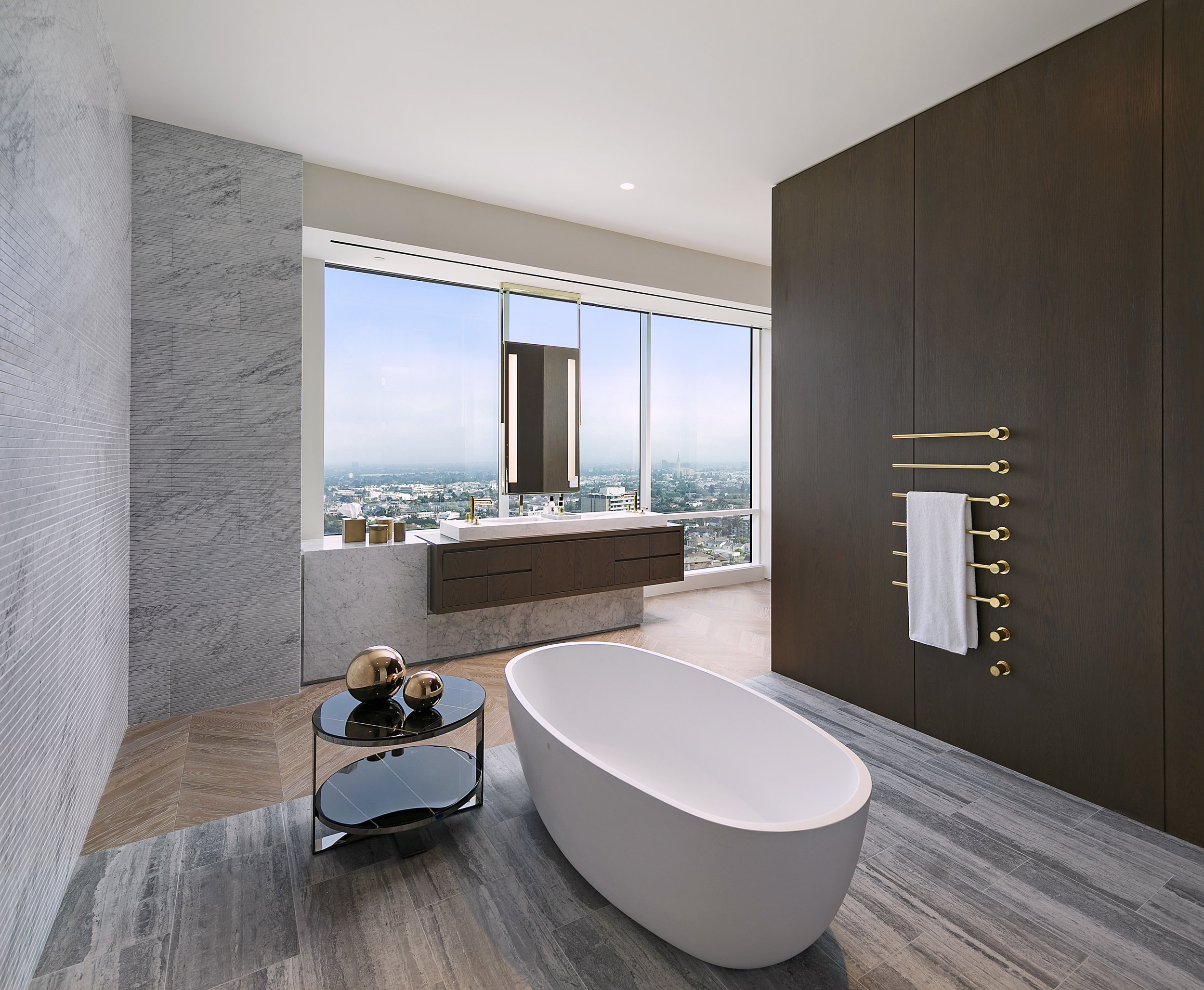 这里有来自 Vola,Dornbracht,Fantini和Kallista的豪华卫浴设备,开放式浴缸线条优雅,临窗而设,视野绝佳。