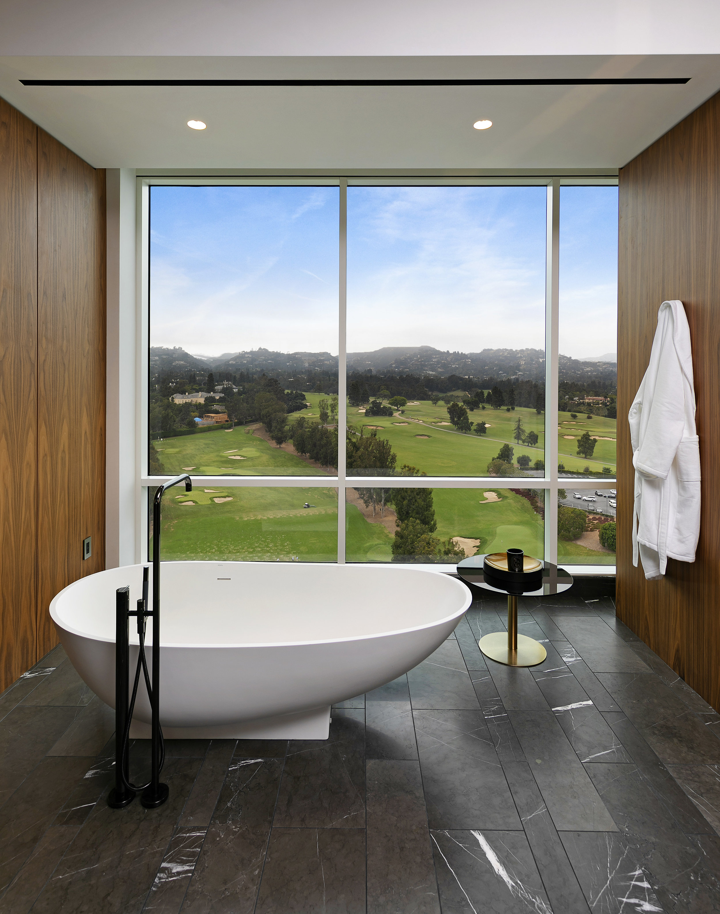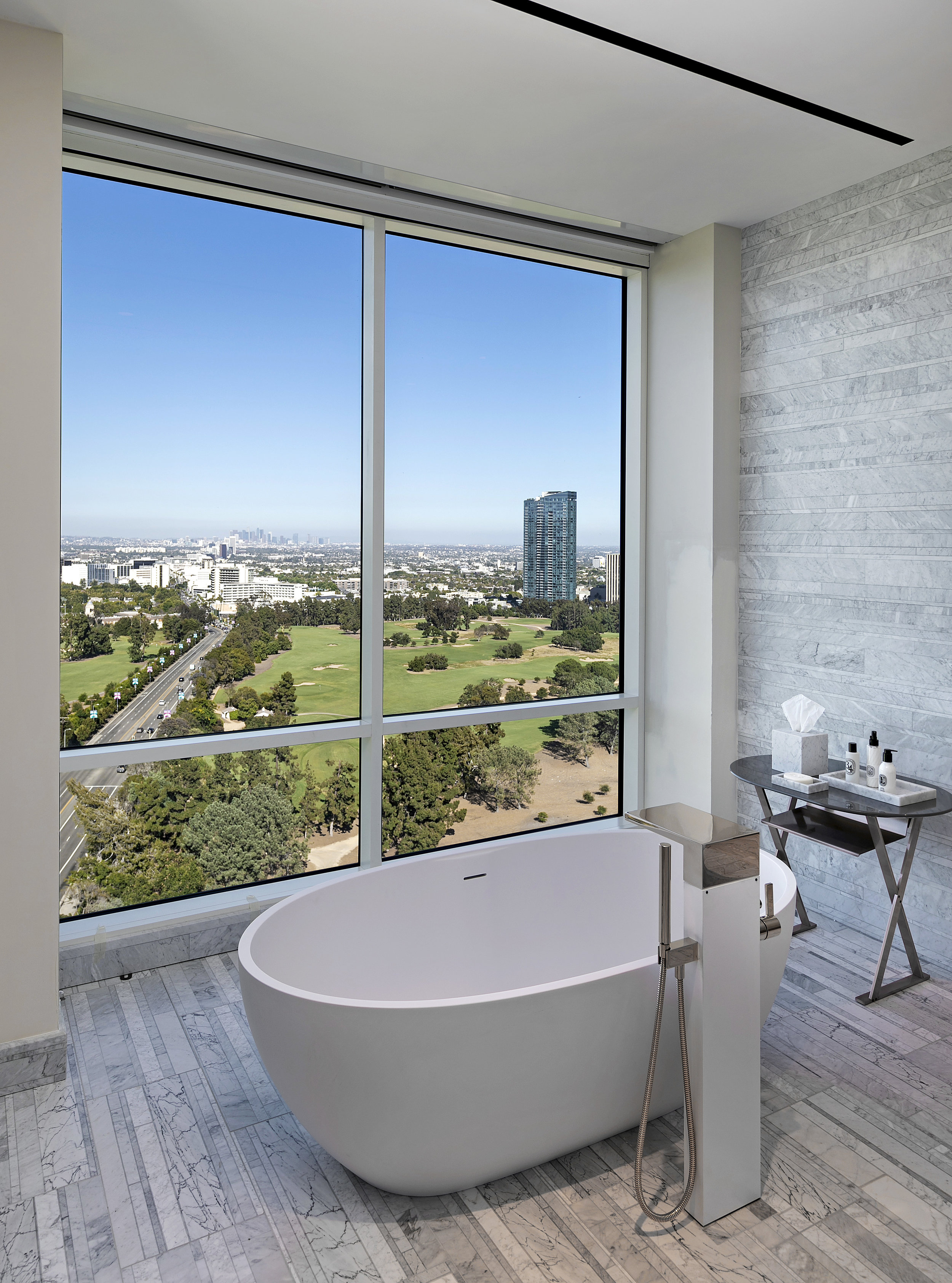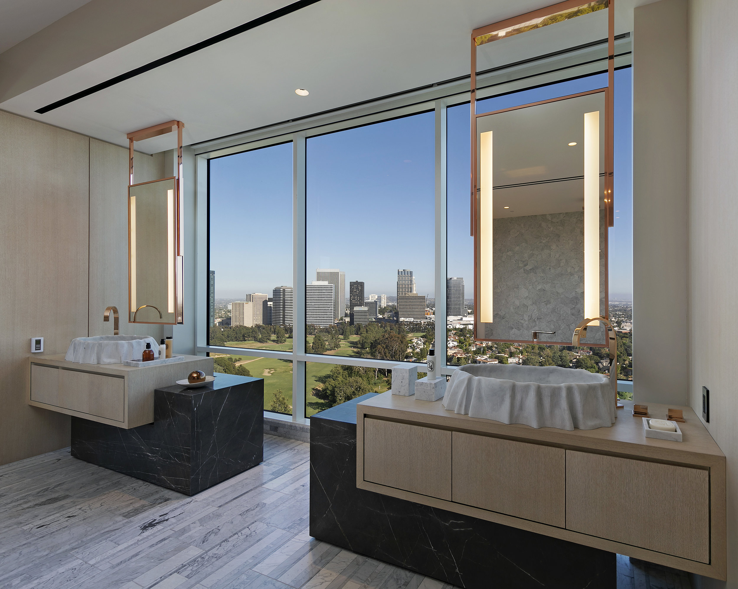 这里有来自 Vola,Dornbracht,Fantini和Kallista的豪华卫浴设备,开放式浴缸线条优雅,临窗而设,视野绝佳。