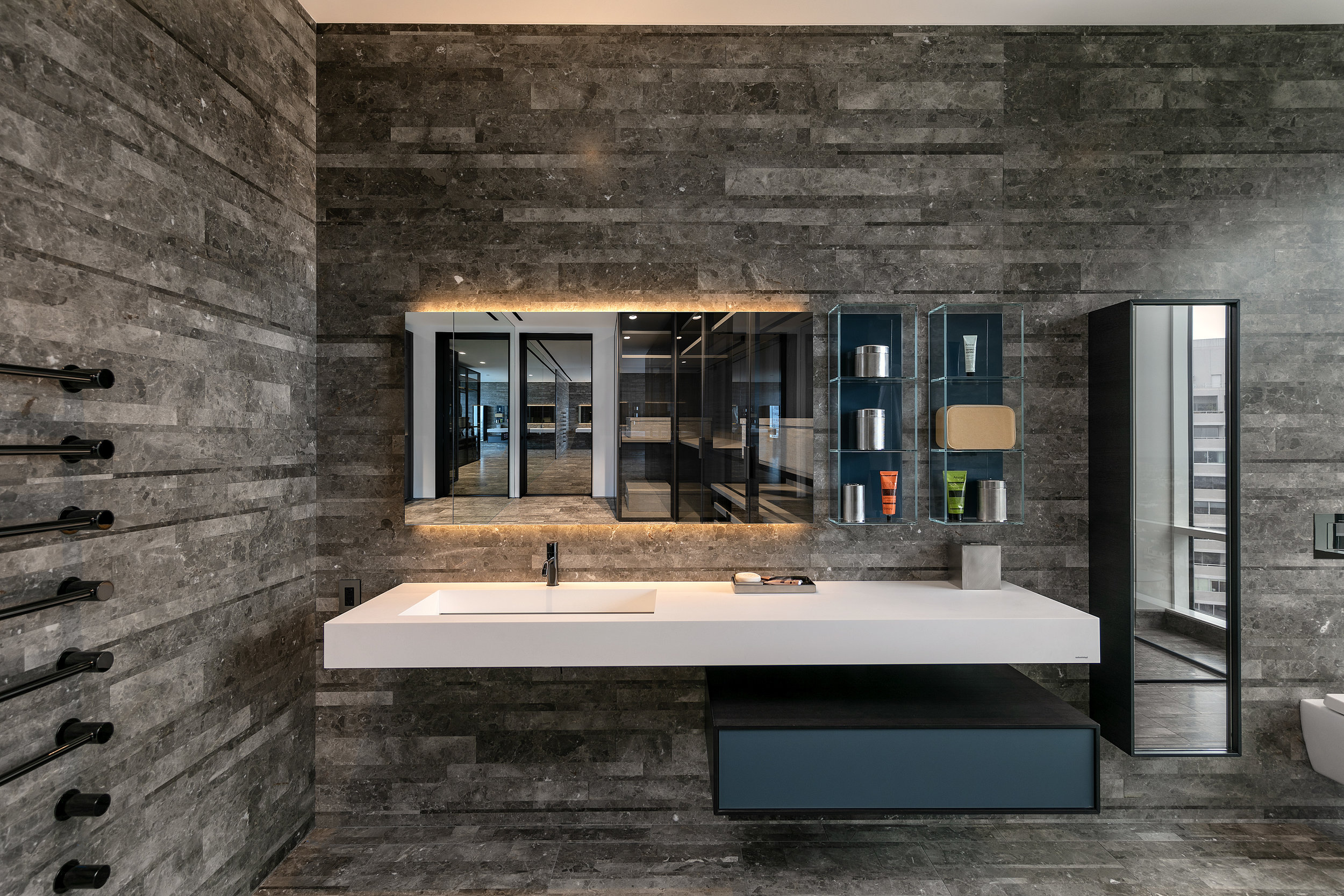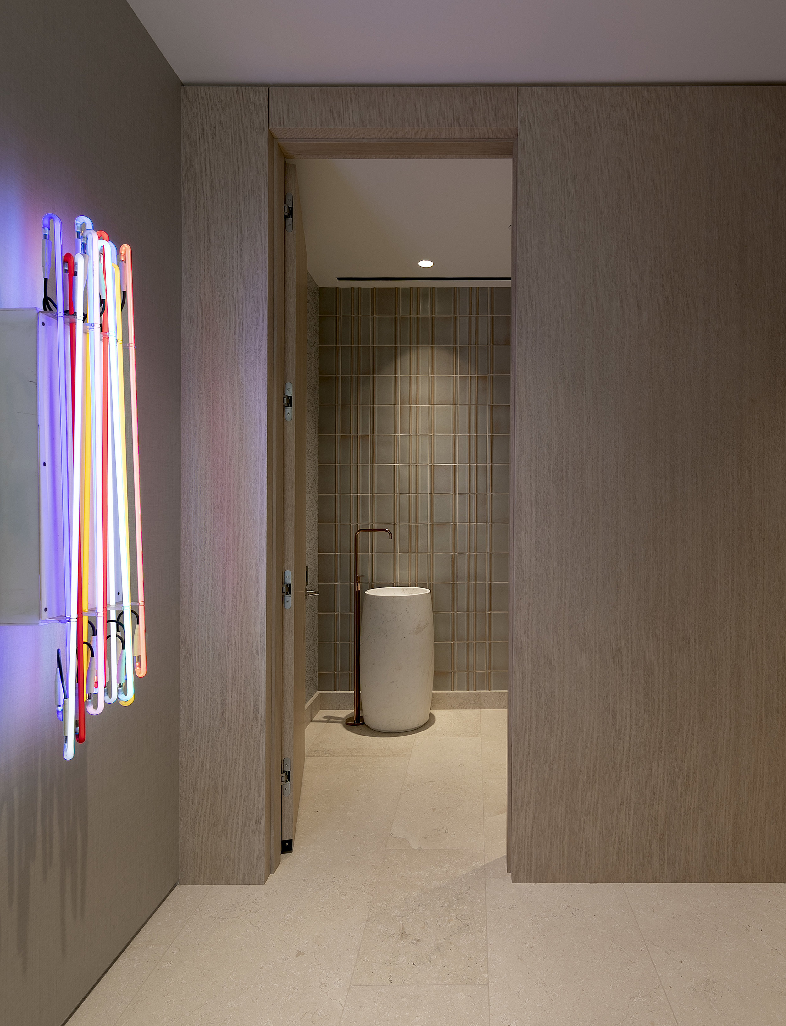 不规则石材拼成的大理石地板、墙壁,无序的纹理极费工序,值得仔细推敲。客用卫生间外的灯管装饰,给优雅饰面注入些许都市气息。