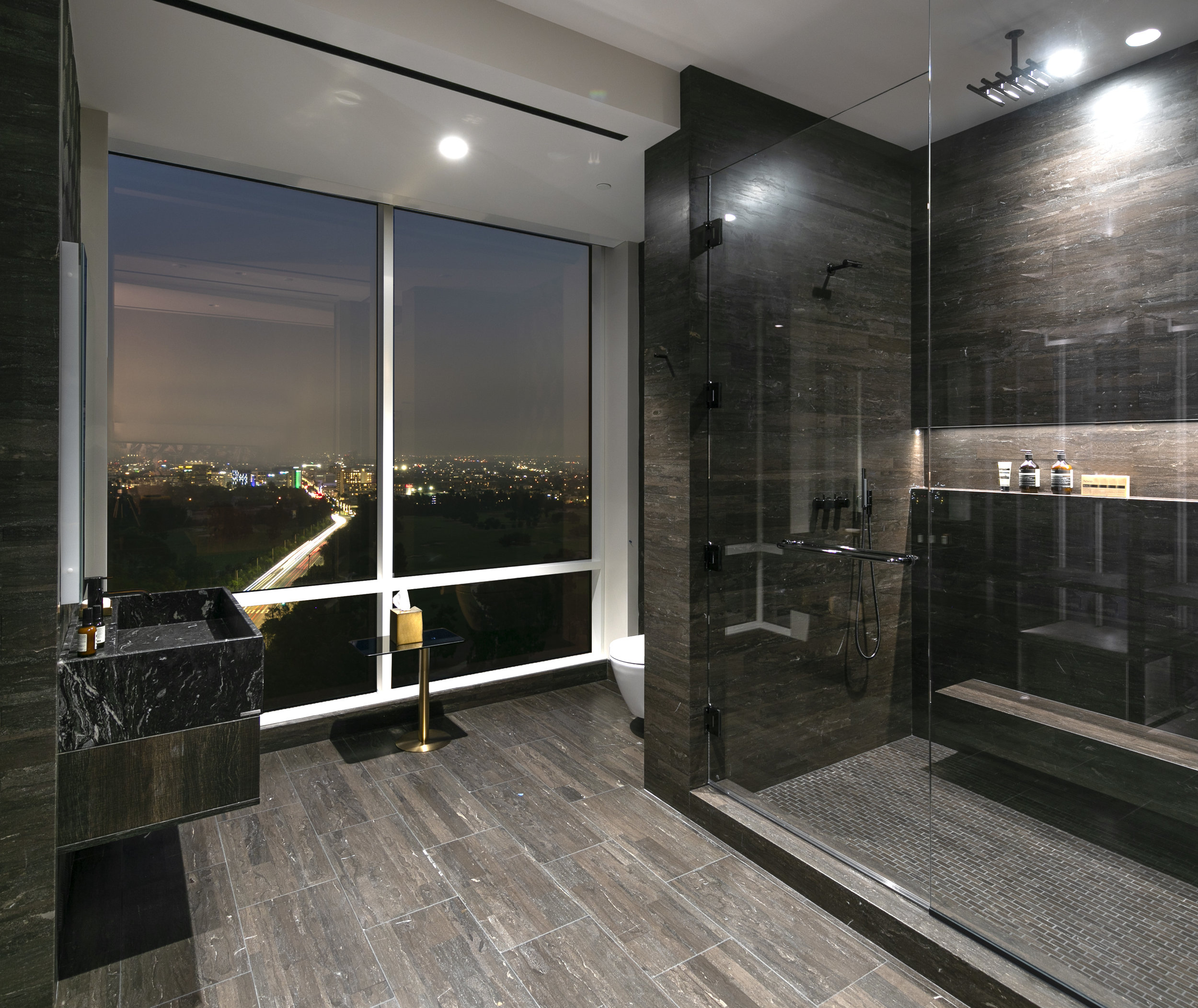 套房卫生间选择和卧房同色系的灰色大理石,形成整体的连续感。次卧淋浴房尺度同样很大,墙面衔接玻璃门开放感和私密性之间自由过渡。Beverly West 每一套顶层公寓均造价不菲,我们也一并分享给你。