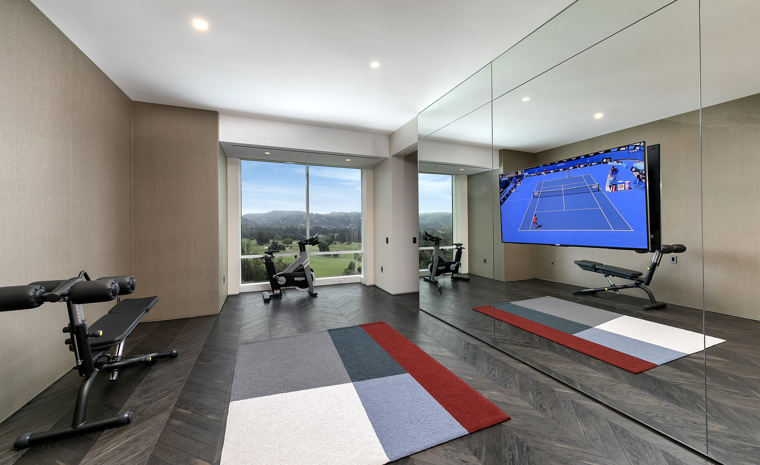 步入式衣帽间里由 MisuraEmme Of Milan 设计的玻璃衣橱,隔壁就是贴着大镜墙的健身房,还和主卧衣帽间相联通。