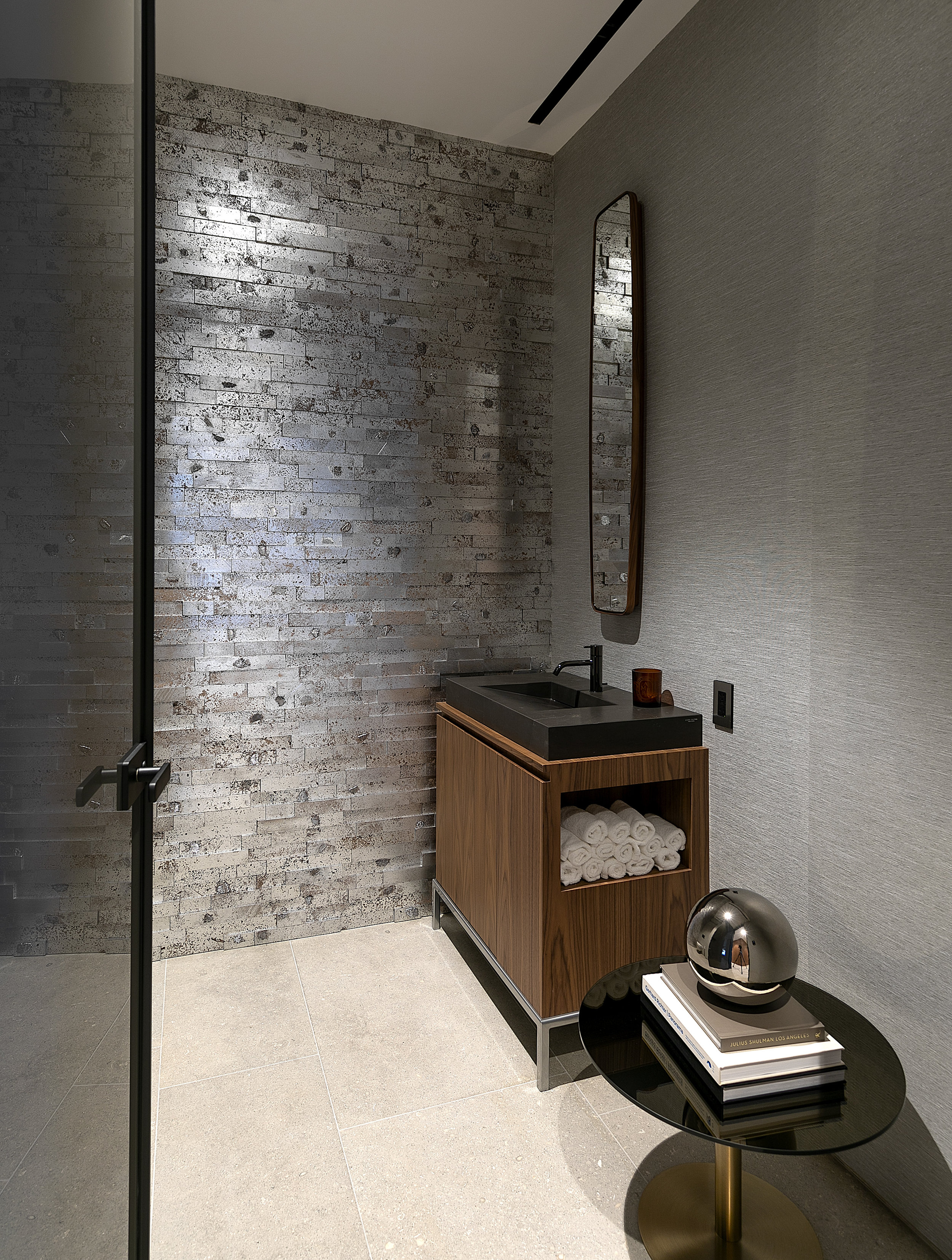 供客人使用的卫生间也装饰的十分典雅,墙面铺贴银色墙砖,在镜子的反射下呈现复杂光影。