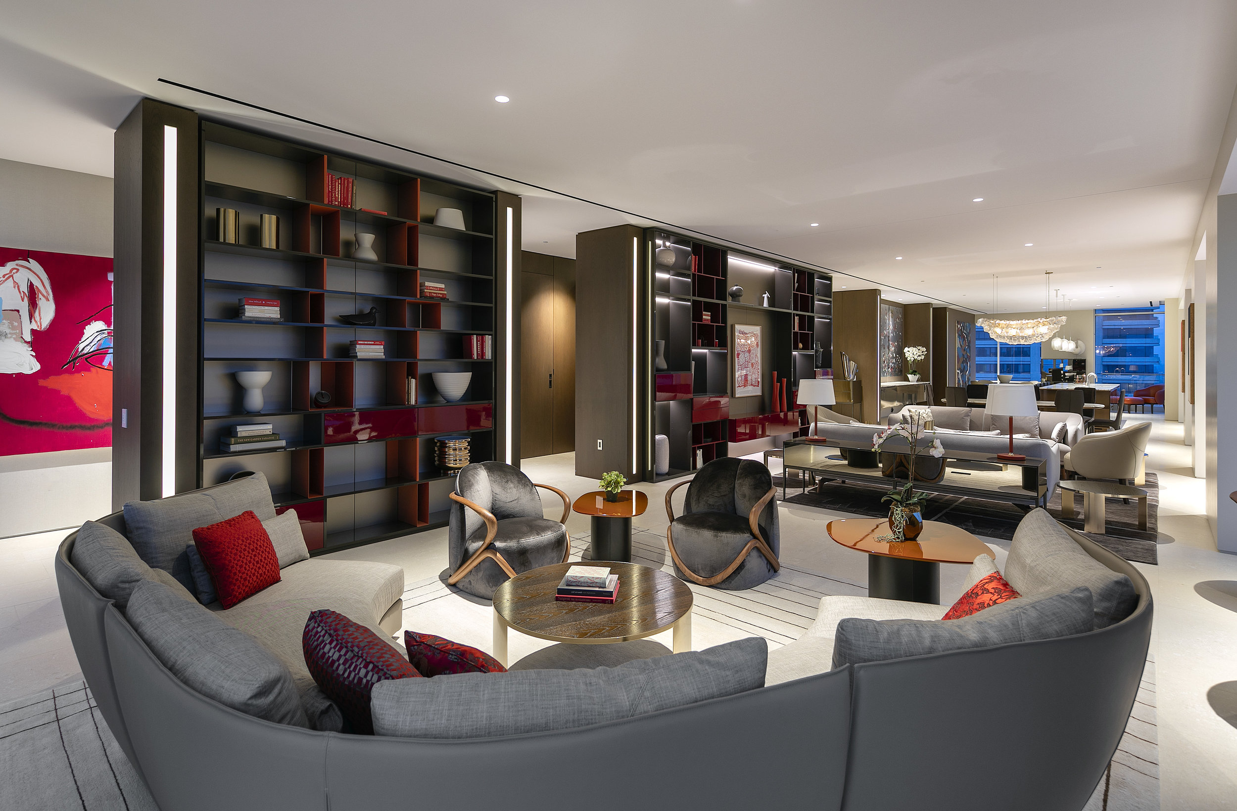 室内以深邃的海军蓝作为基调,辅以胡桃木镶板作补充,阳刚之余充满优雅气息。Giorgetti,B&B Italia,Armani Casa,Poltrona Frau,Verpan,One Collection,Lasvit 等国际大牌的定制家具分区摆放,主次分明。