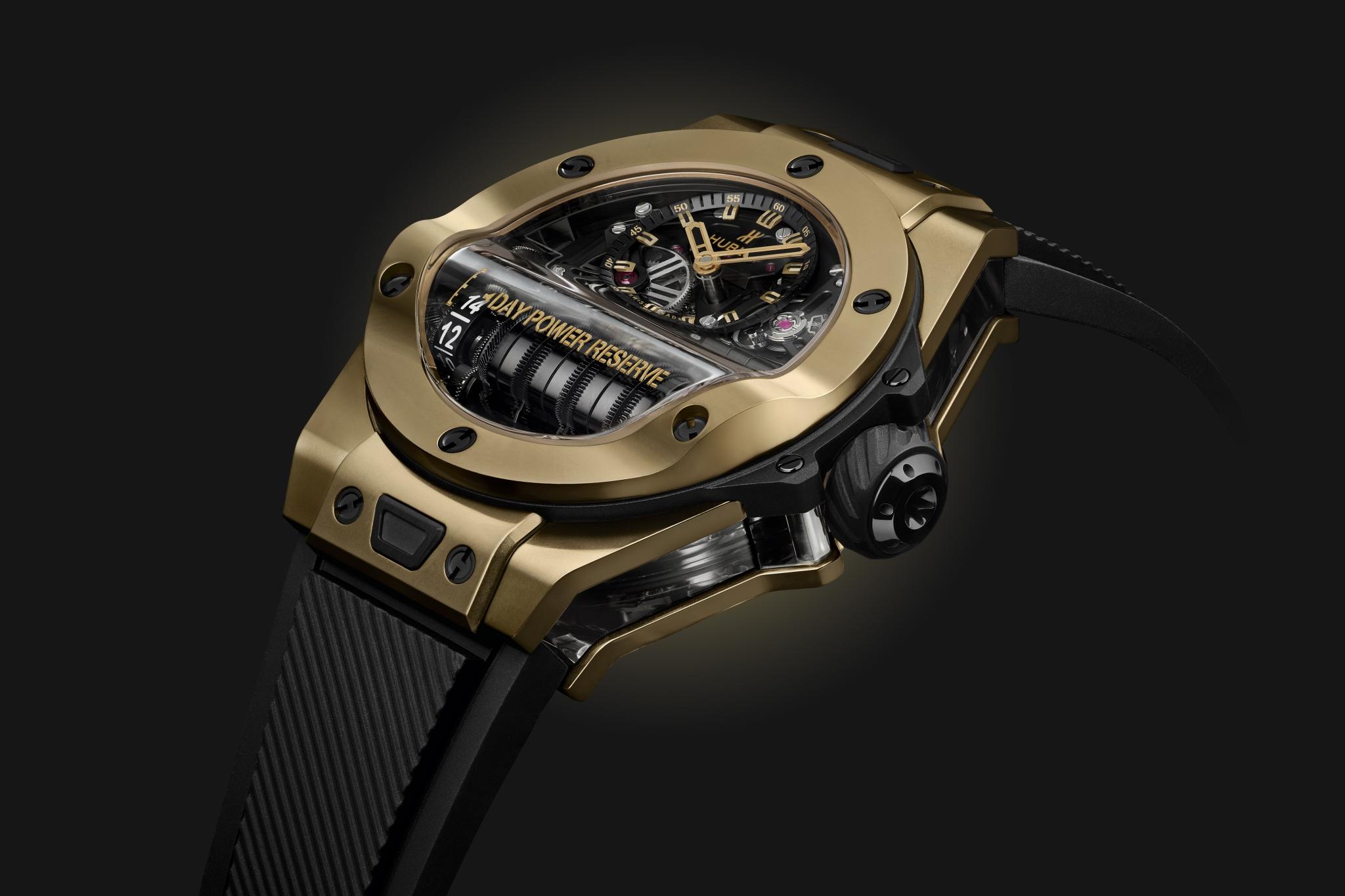 腕表搭载了手动上链镂空机芯,由宇舶表自主研发制造,配备七个串联发条盒,拥有超长14天动力储存。
