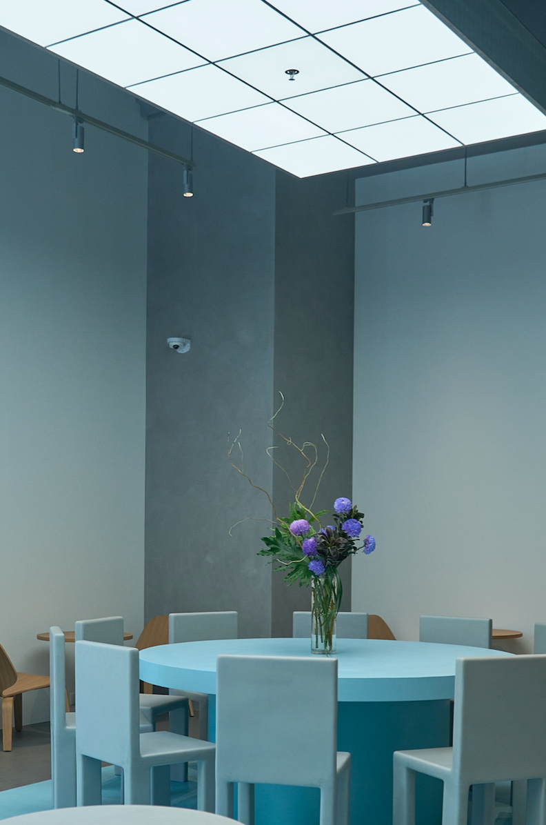 呼应对未来的无限遐想,蓝瓶也首次在门店使用新型树脂材料浇筑制成的灰蓝桌面和座椅,辅以原木色系家具的混搭,与整体冷色调的科技感互补,为这场对话增添了一份明亮和温暖。从一层的靠墙长椅到二层的沙发坐席,无论是可独享个人时光的条形阅读区,或是适合与朋友分享咖啡点心、欣赏定制花艺的海蓝色中央圆桌,顾客都能在蓝瓶咖啡深圳万象天地店,寻得一处舒适的咖啡体验。