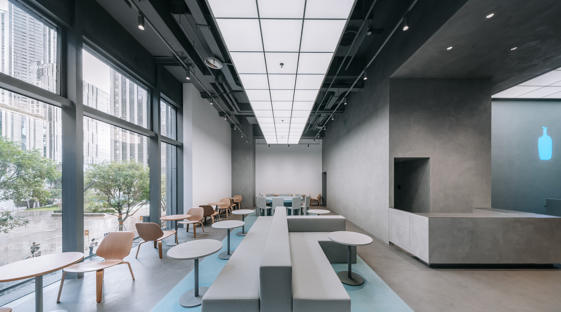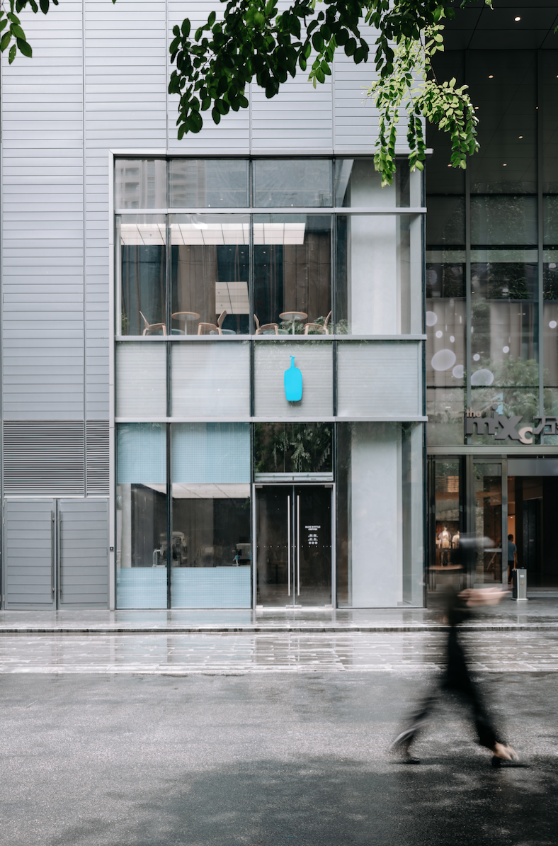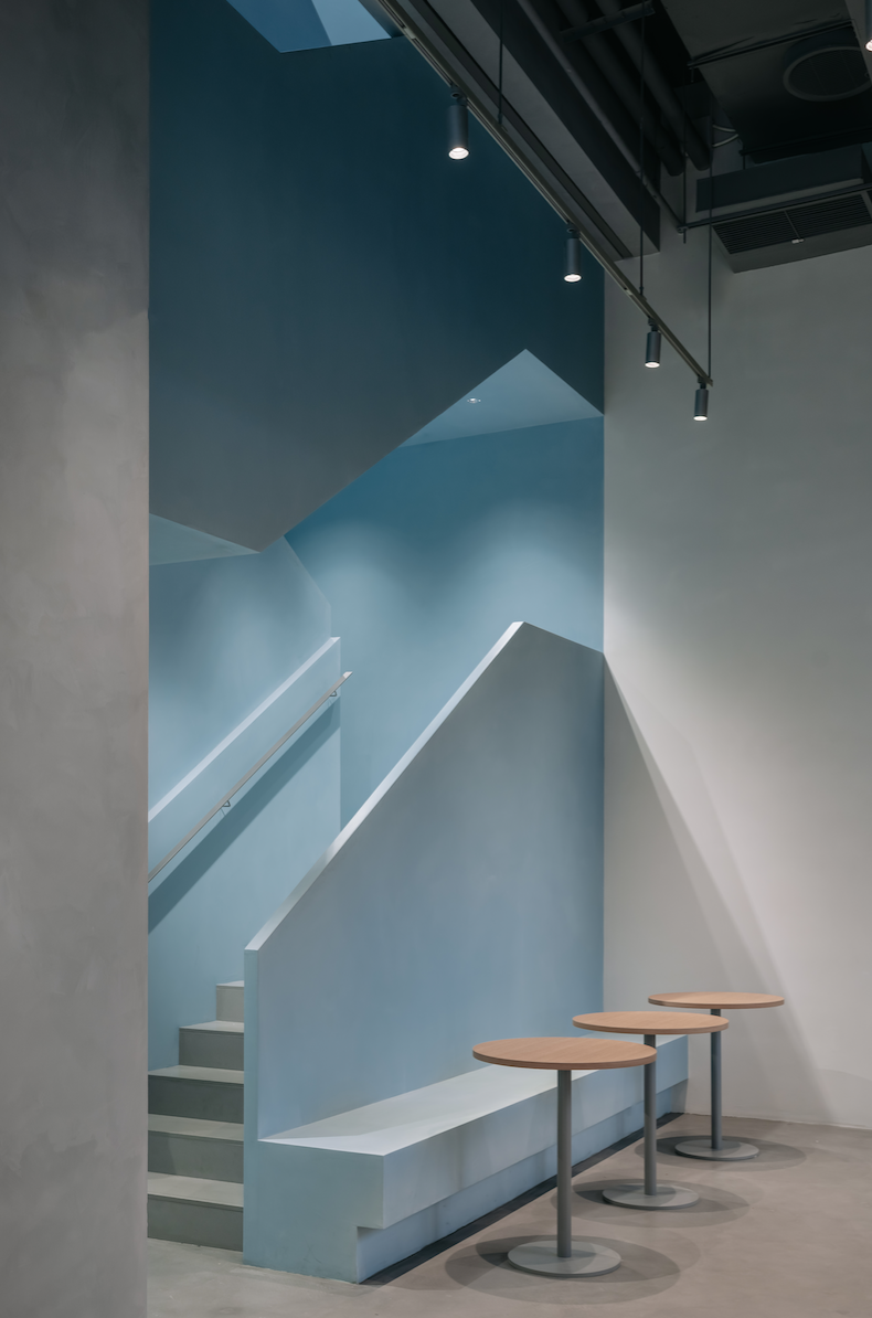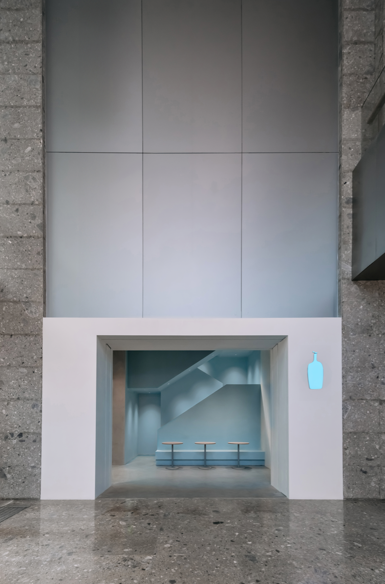 一如这座未来之城求新求变的先锋态度,蓝瓶咖啡首次与来自中国香港的年轻建筑师团队——COLLECTIVE合作,用充满想象力的方式,叠加自然肌理、当代文化与未来风格的笔触,让深圳的创新、活力和包容跃然眼前。从高楼林立的万象天地高街步入门店,层次渐变的大面积海蓝色调,贯穿一层及二层空间,就像是进入了沉静的海洋,带领顾客开启对于咖啡的探索。由同色系磨砂亚克力叠加不锈钢网格打造的主吧台与吊灯,搭配以整齐格纹线条处理的吊顶白光,勾画出前卫的科技质感;吧台上本店限定的蓝色定制滤杯,明亮灵动,完美地融入整体环境,作为目前全球唯一使用蓝色滤杯的蓝瓶门店,让蓝瓶标志性的手冲咖啡艺术更添新趣。