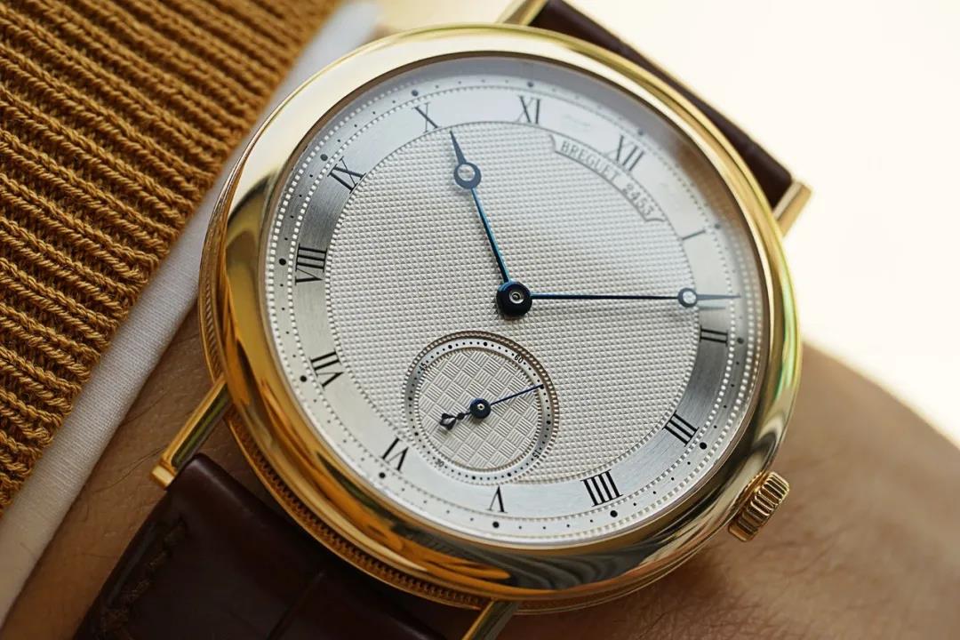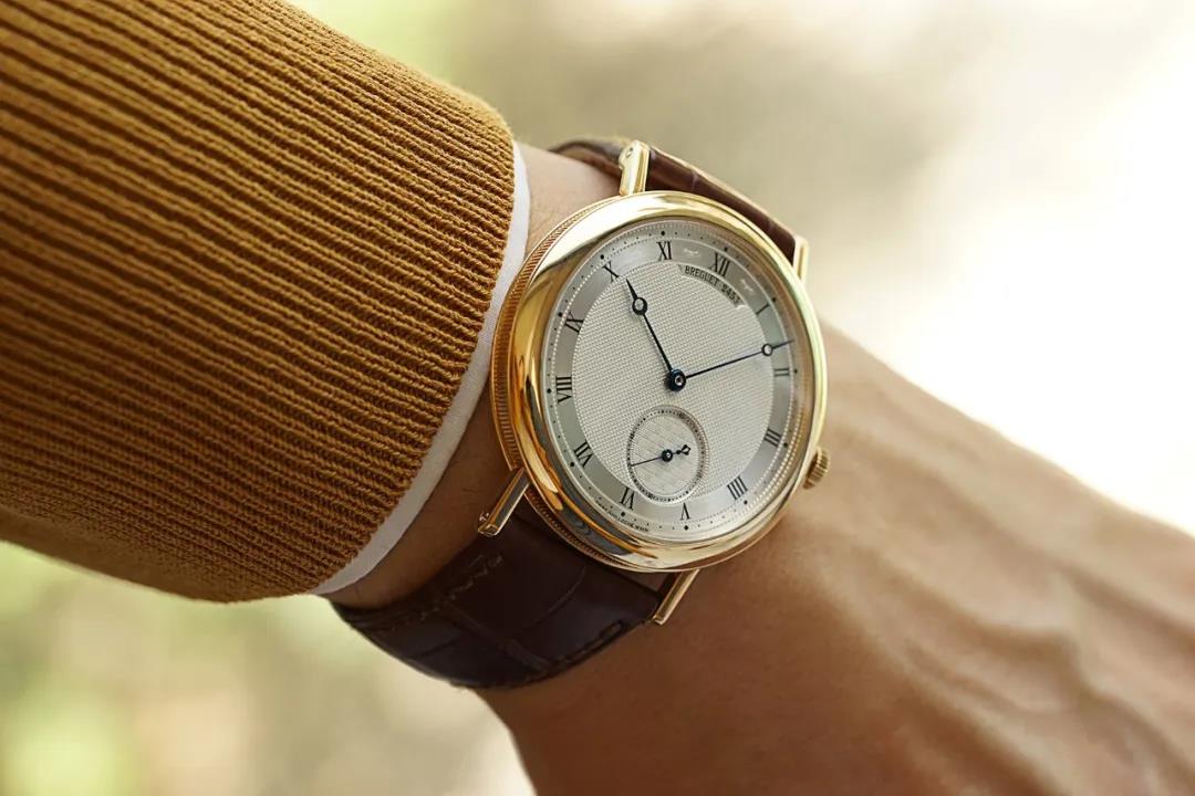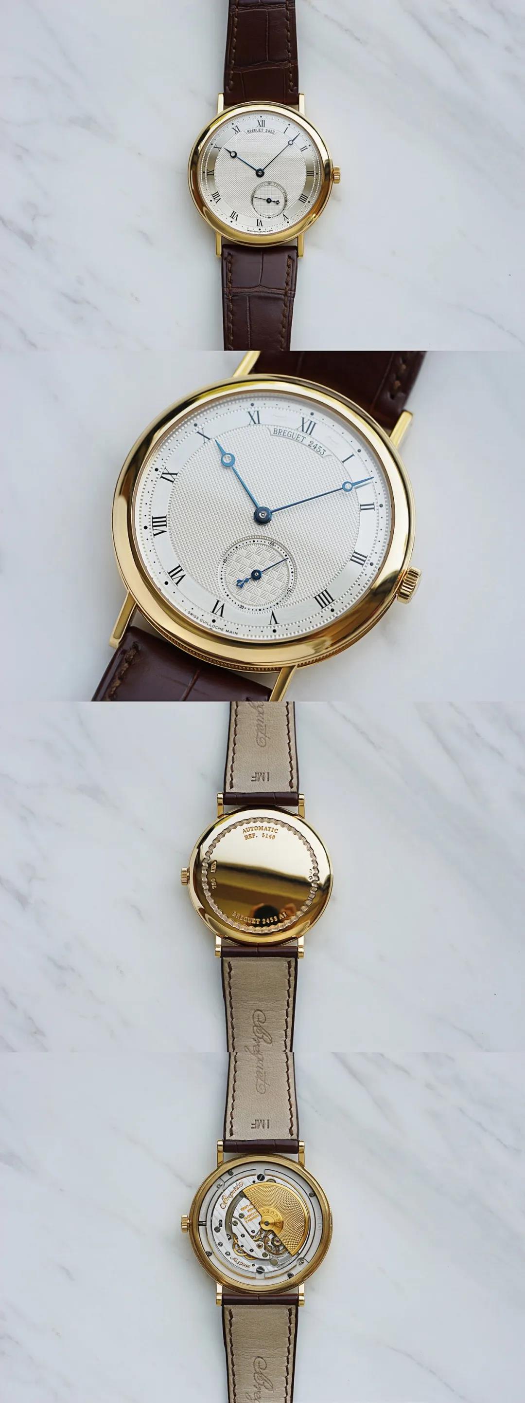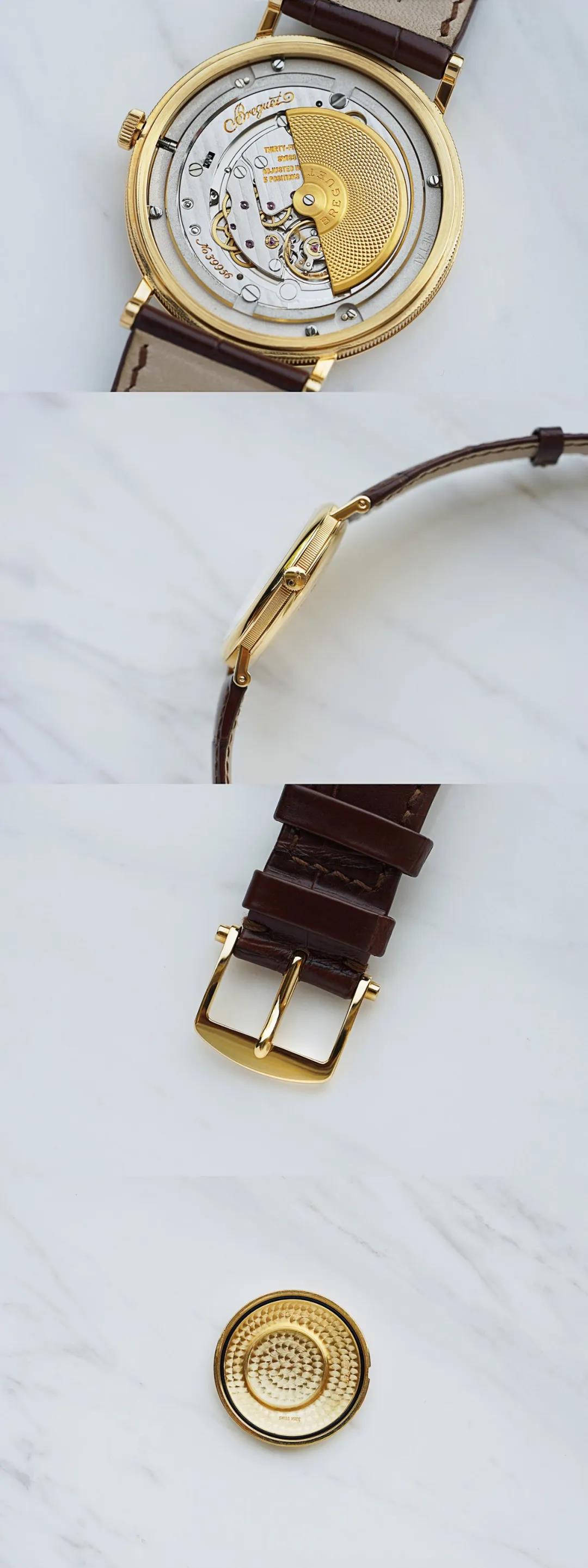真正的美只有时间知道,这是一枚2010年前后瑞士生产的Breguet宝玑黄金男士腕表,型号5140。经典的圆形18K黄金表壳直径40mm搭配透明蓝宝石玻璃表镜,钱币纹侧边装饰,表耳亦体现了百分百的宝玑风格。以螺丝栓取代常用的弹簧杆,将表带固定于表耳之间,不仅美观而且稳固。