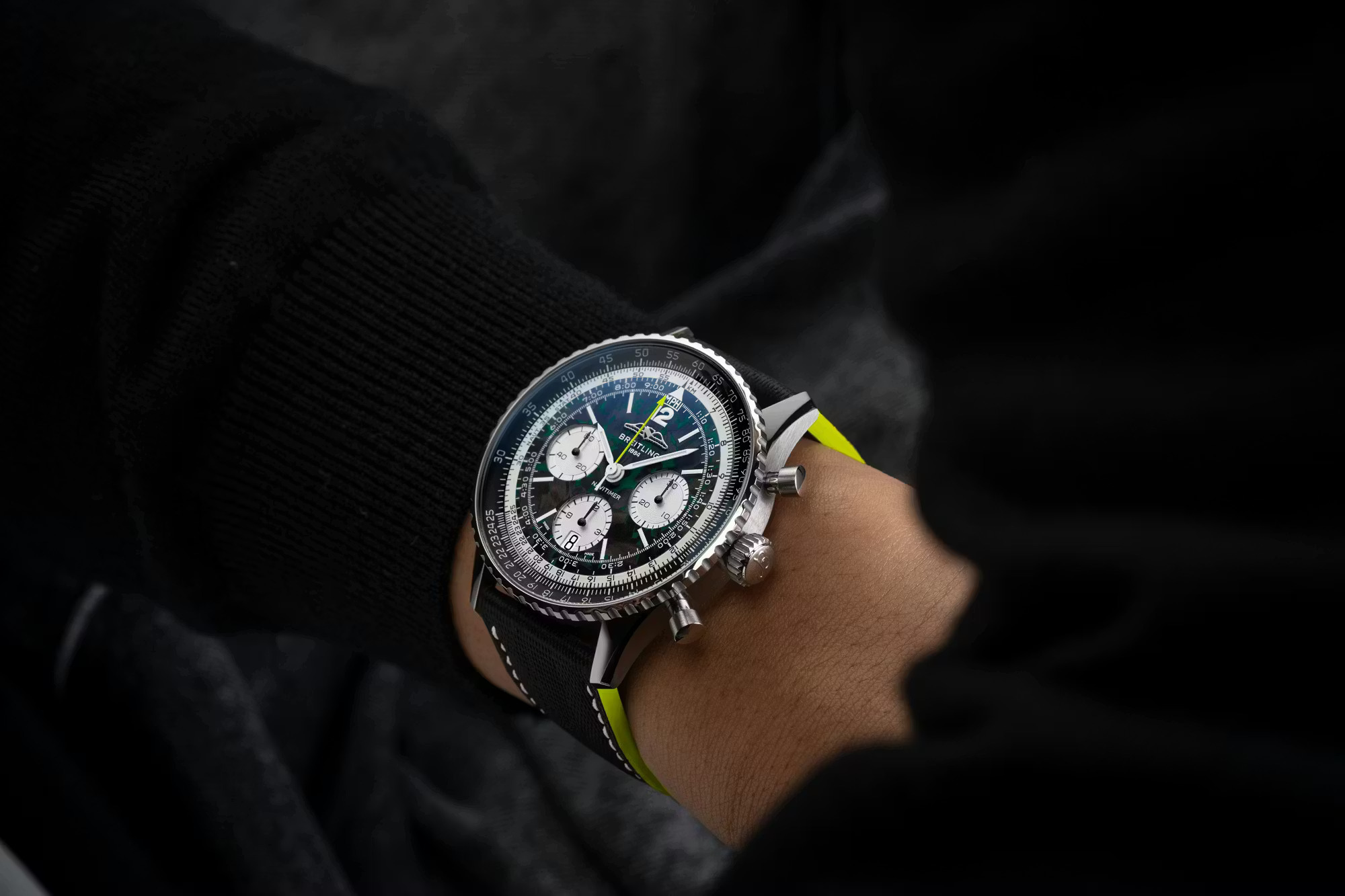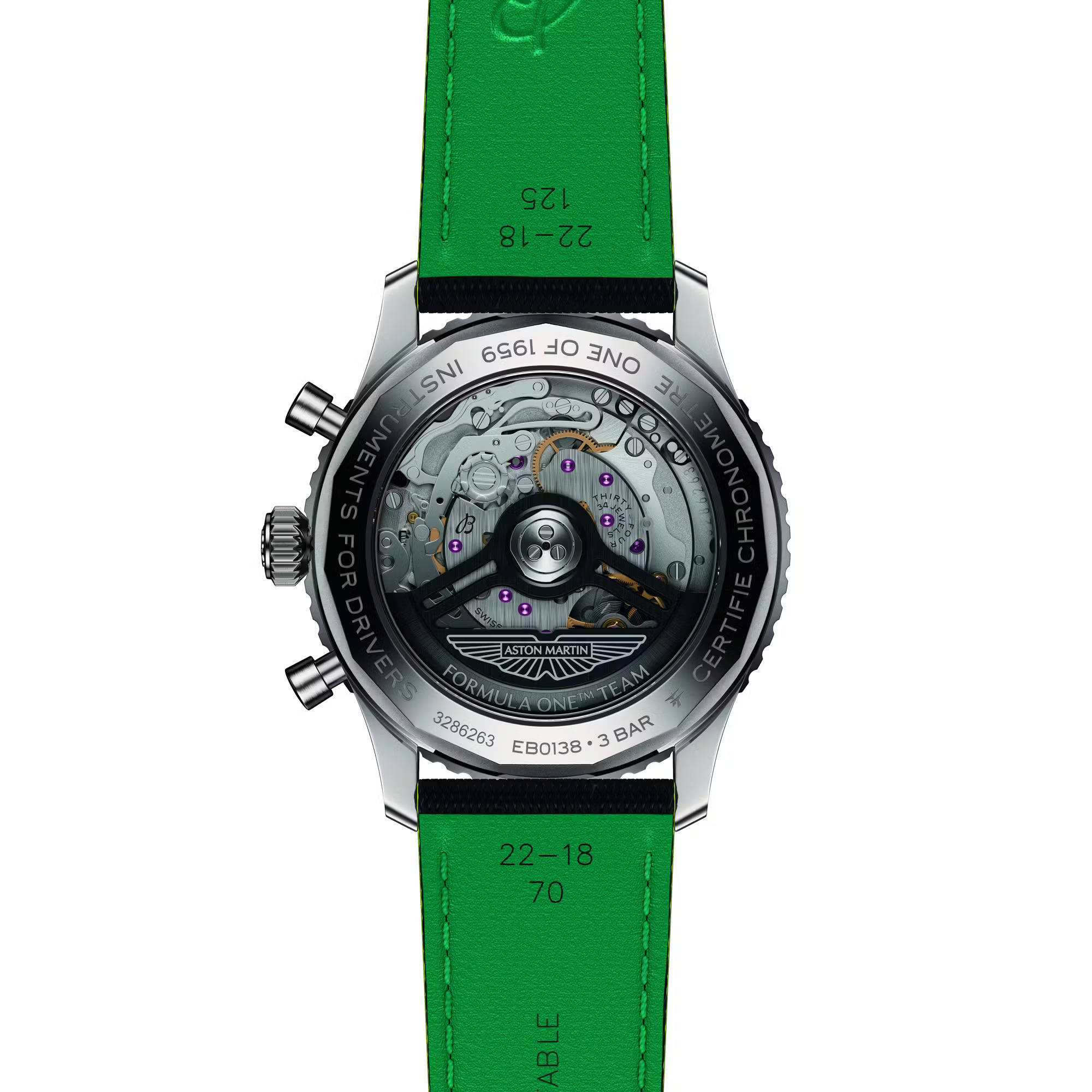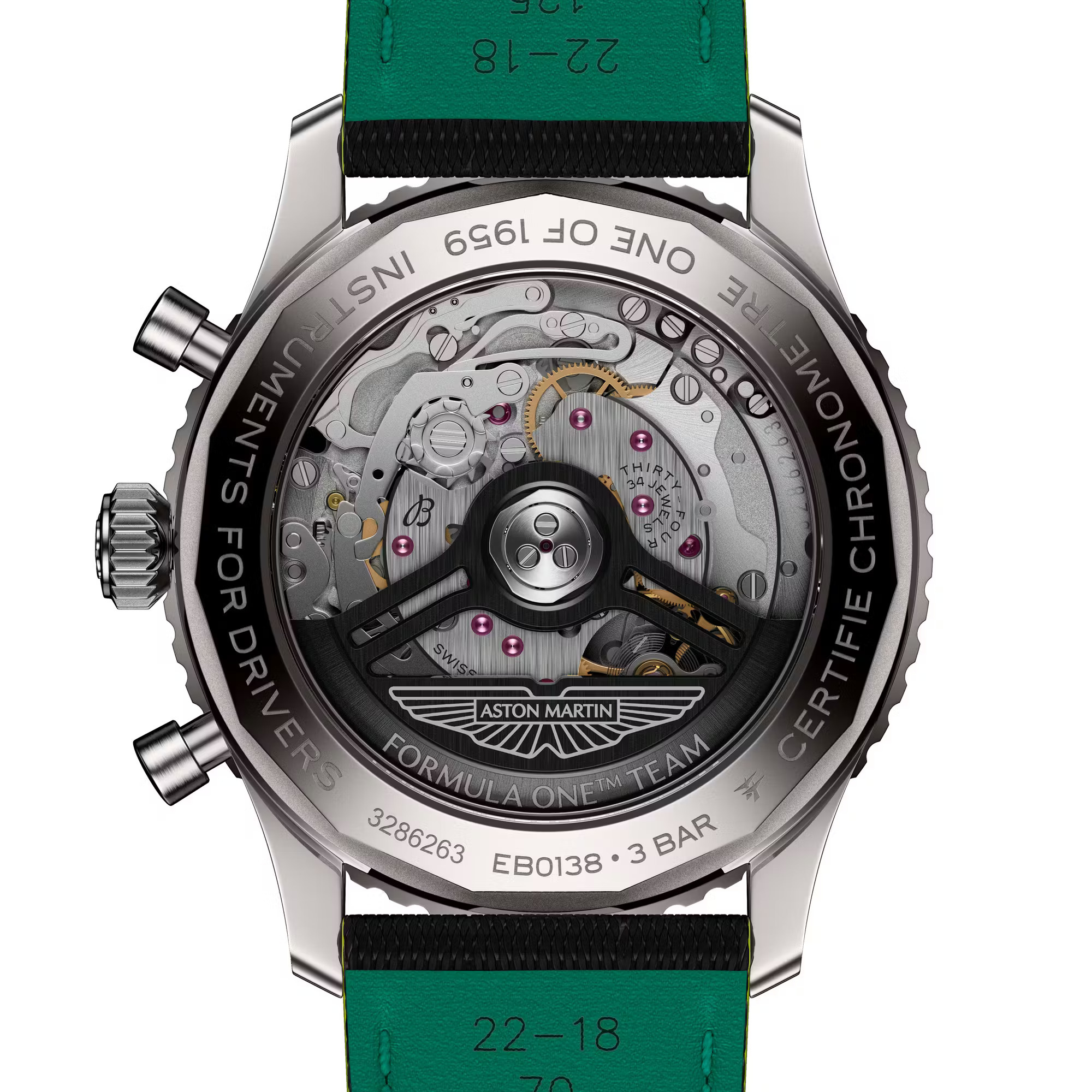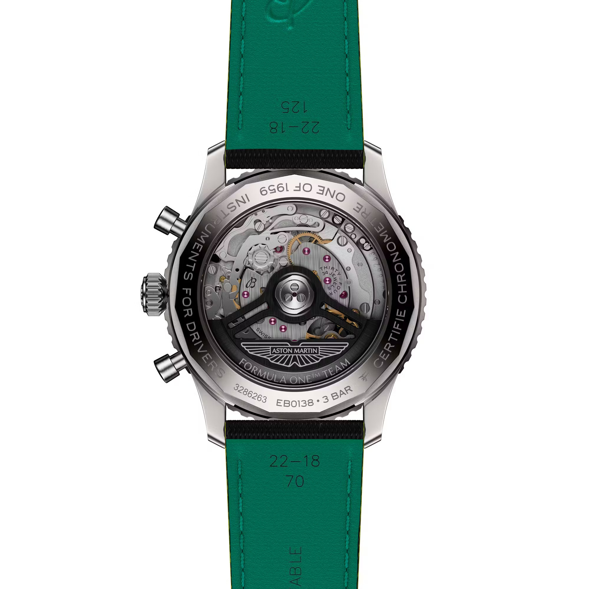 事实上,这项合作可谓是众望所归,一个品牌历来追求速度,另一个品牌则历来以计时码表来衡量速度。此次联合的首款产品是 “Navitimer B01 Chronograph 43 Aston Martin Aramco Formula One Team” 腕表,其设计灵感源自阿斯顿·马丁赛车的标志性绿和亮眼的青柠色。腕表搭载钛金属表壳,以呼应 F1 赛车轻量化机械的理念,这在 Navitimer 系列中尚属首次。表盘采用碳纤维材质,旨在致敬赛车座舱的材质;翻转表盘,哑光黑自动陀上镌刻着车队标志和 “One of 1959” 字样,以纪念阿斯顿·马丁首次亮相 F1 赛场的年份。