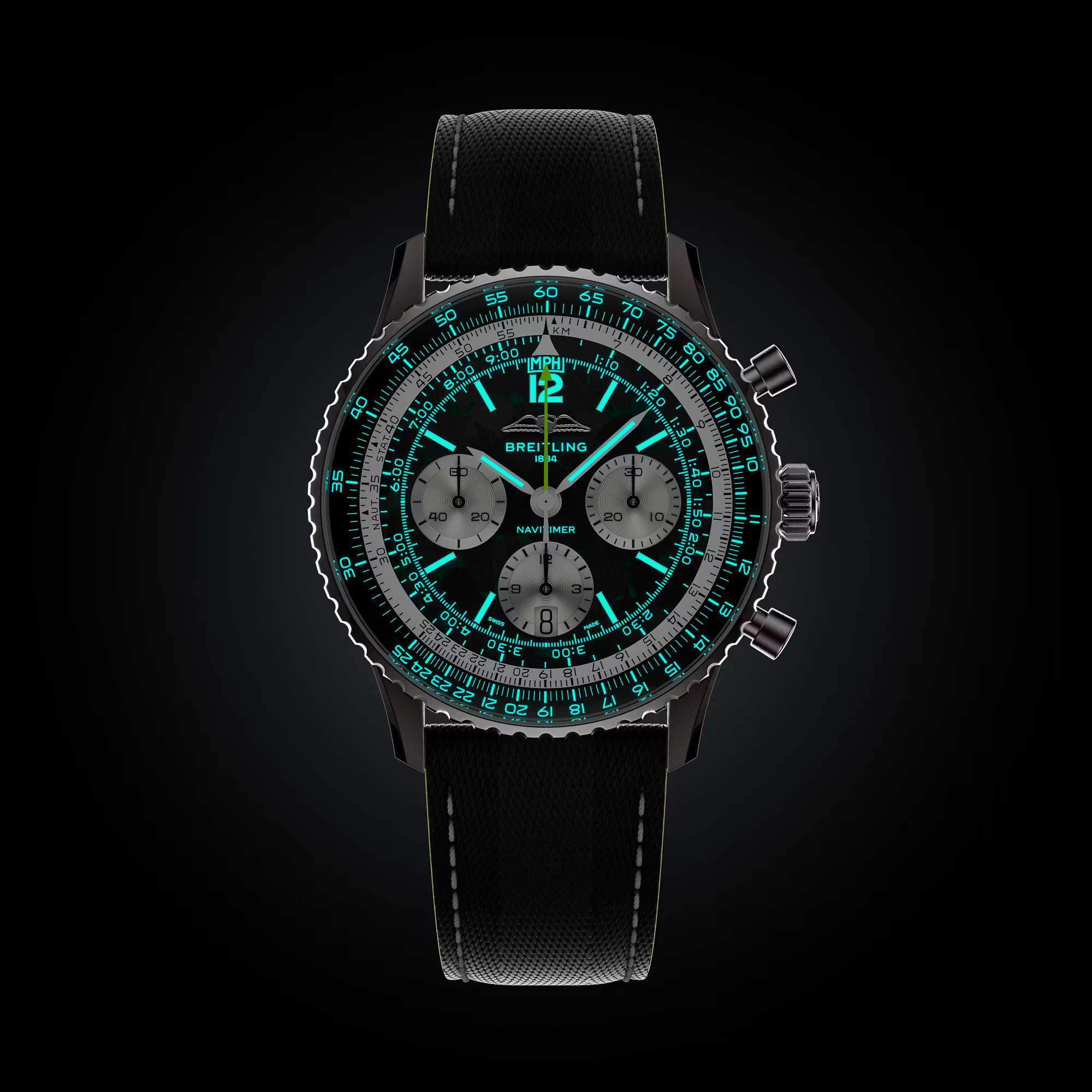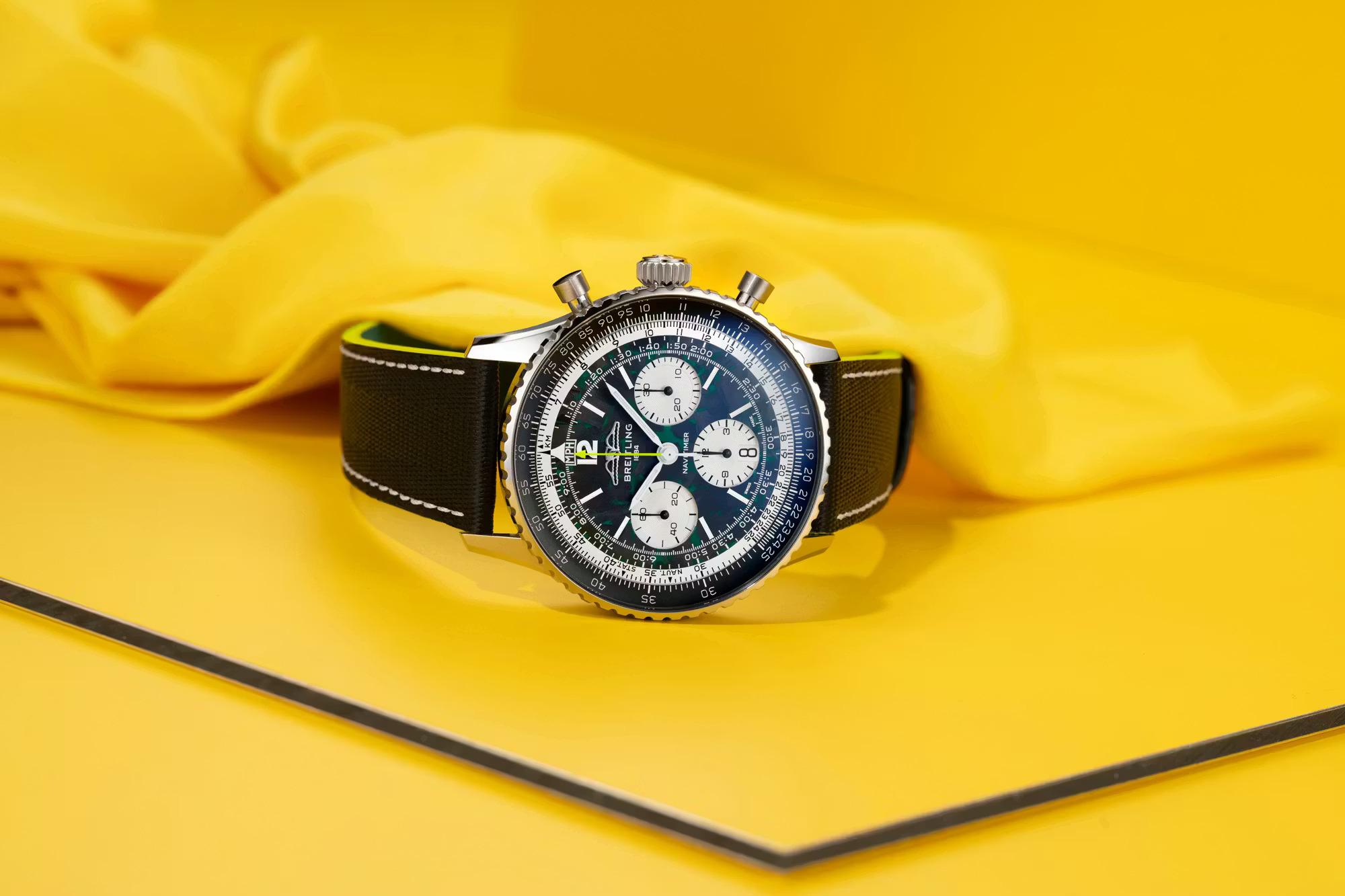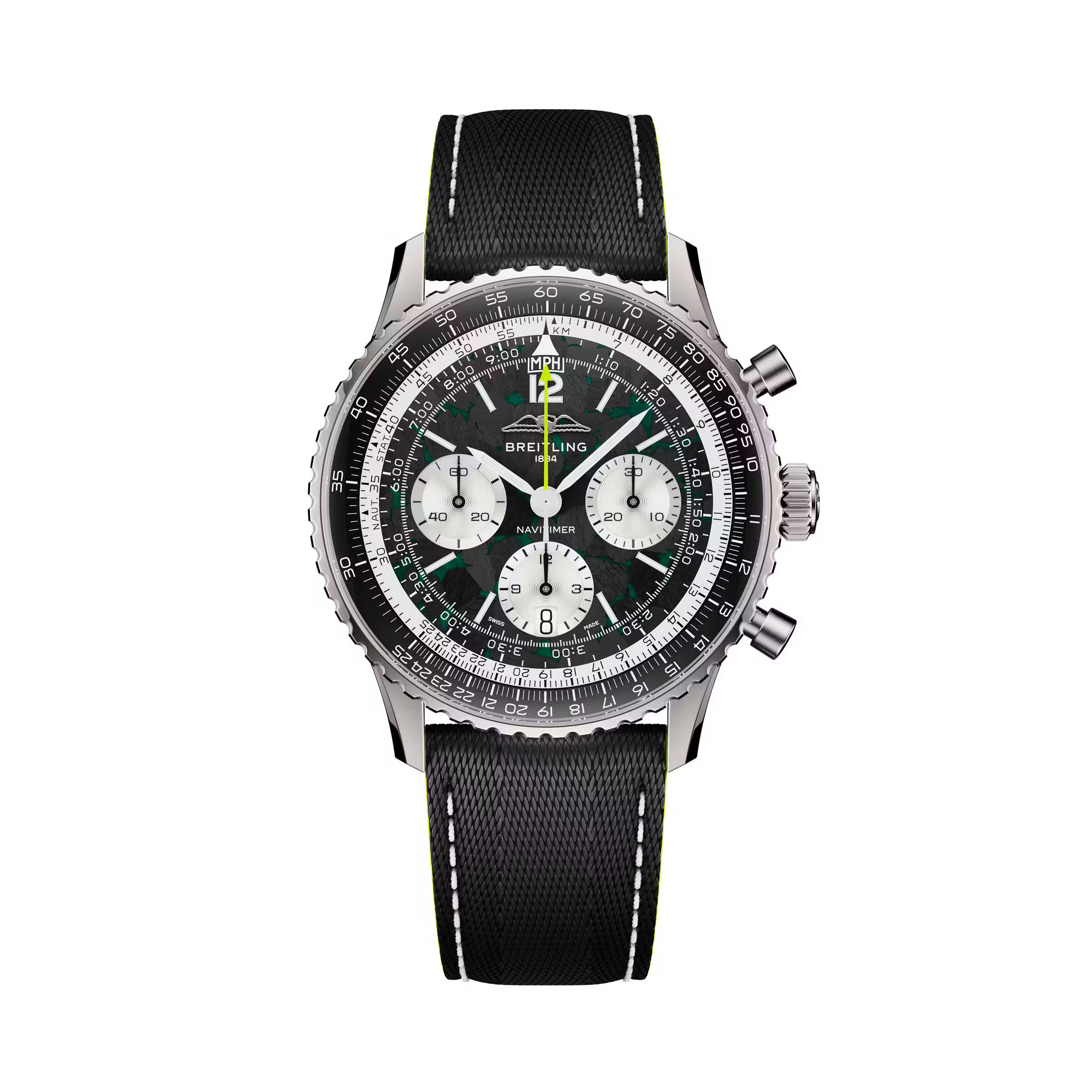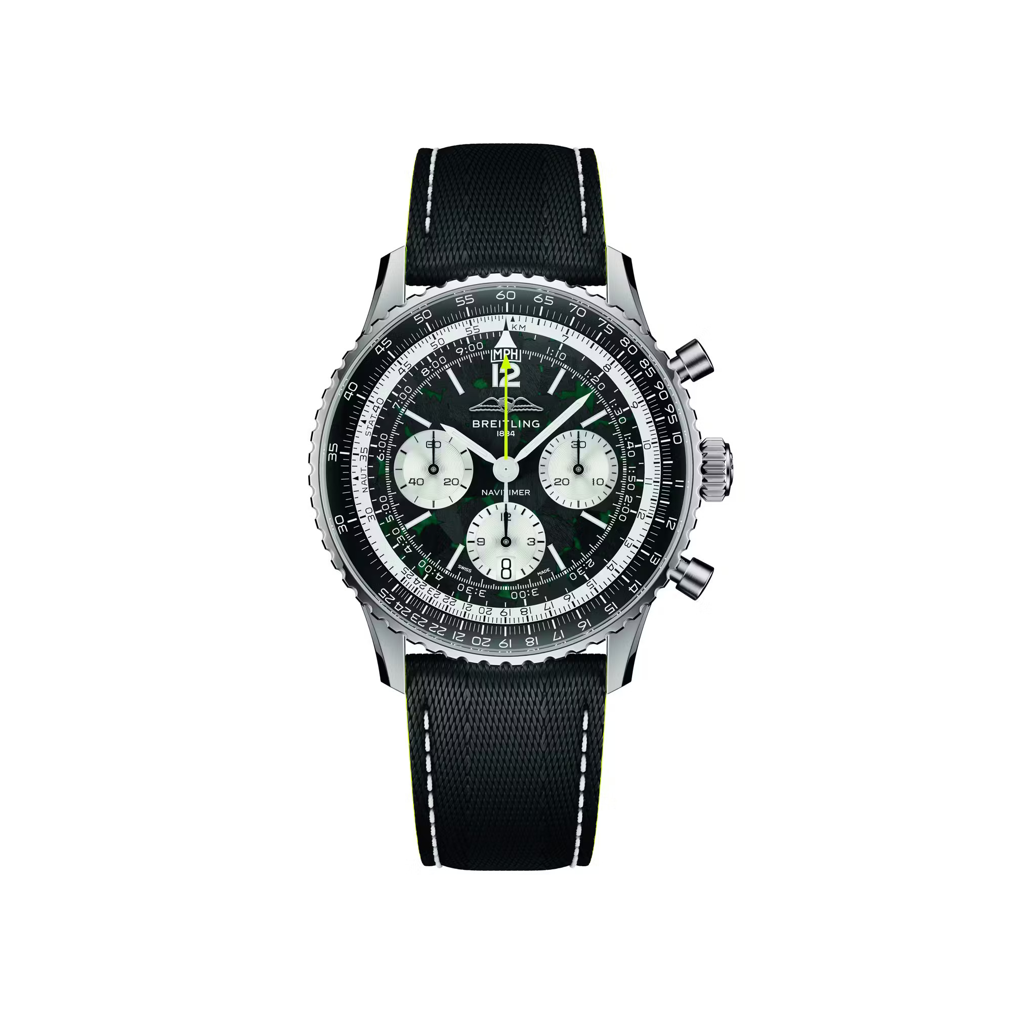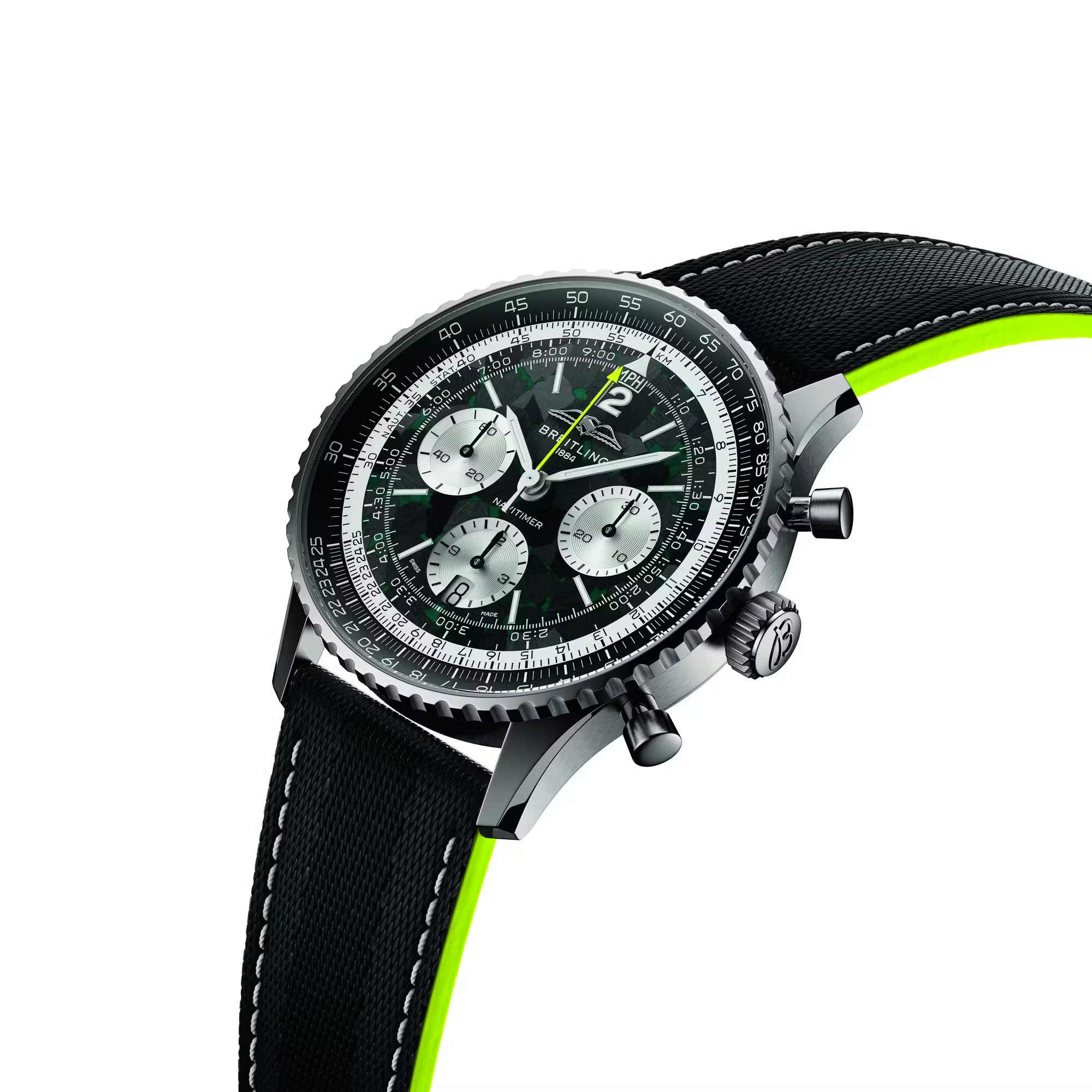 事实上,这项合作可谓是众望所归,一个品牌历来追求速度,另一个品牌则历来以计时码表来衡量速度。此次联合的首款产品是 “Navitimer B01 Chronograph 43 Aston Martin Aramco Formula One Team” 腕表,其设计灵感源自阿斯顿·马丁赛车的标志性绿和亮眼的青柠色。腕表搭载钛金属表壳,以呼应 F1 赛车轻量化机械的理念,这在 Navitimer 系列中尚属首次。表盘采用碳纤维材质,旨在致敬赛车座舱的材质;翻转表盘,哑光黑自动陀上镌刻着车队标志和 “One of 1959” 字样,以纪念阿斯顿·马丁首次亮相 F1 赛场的年份。