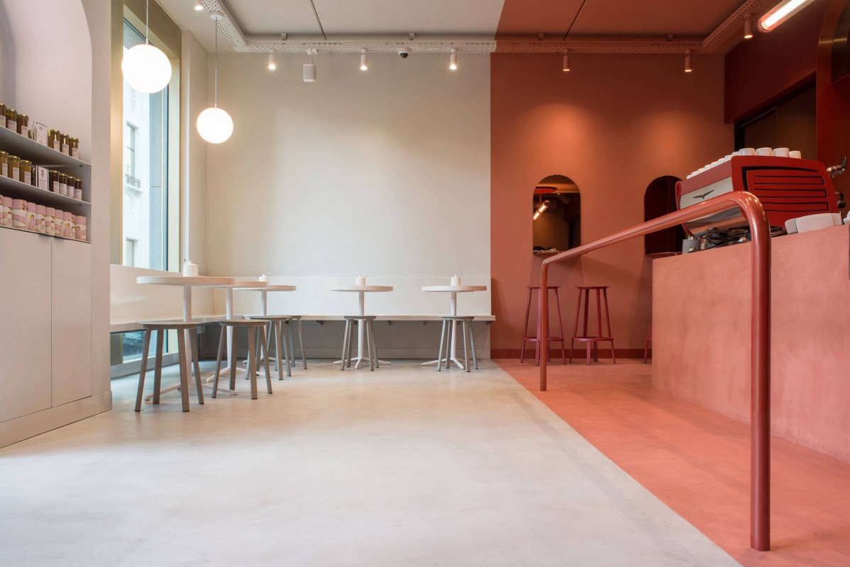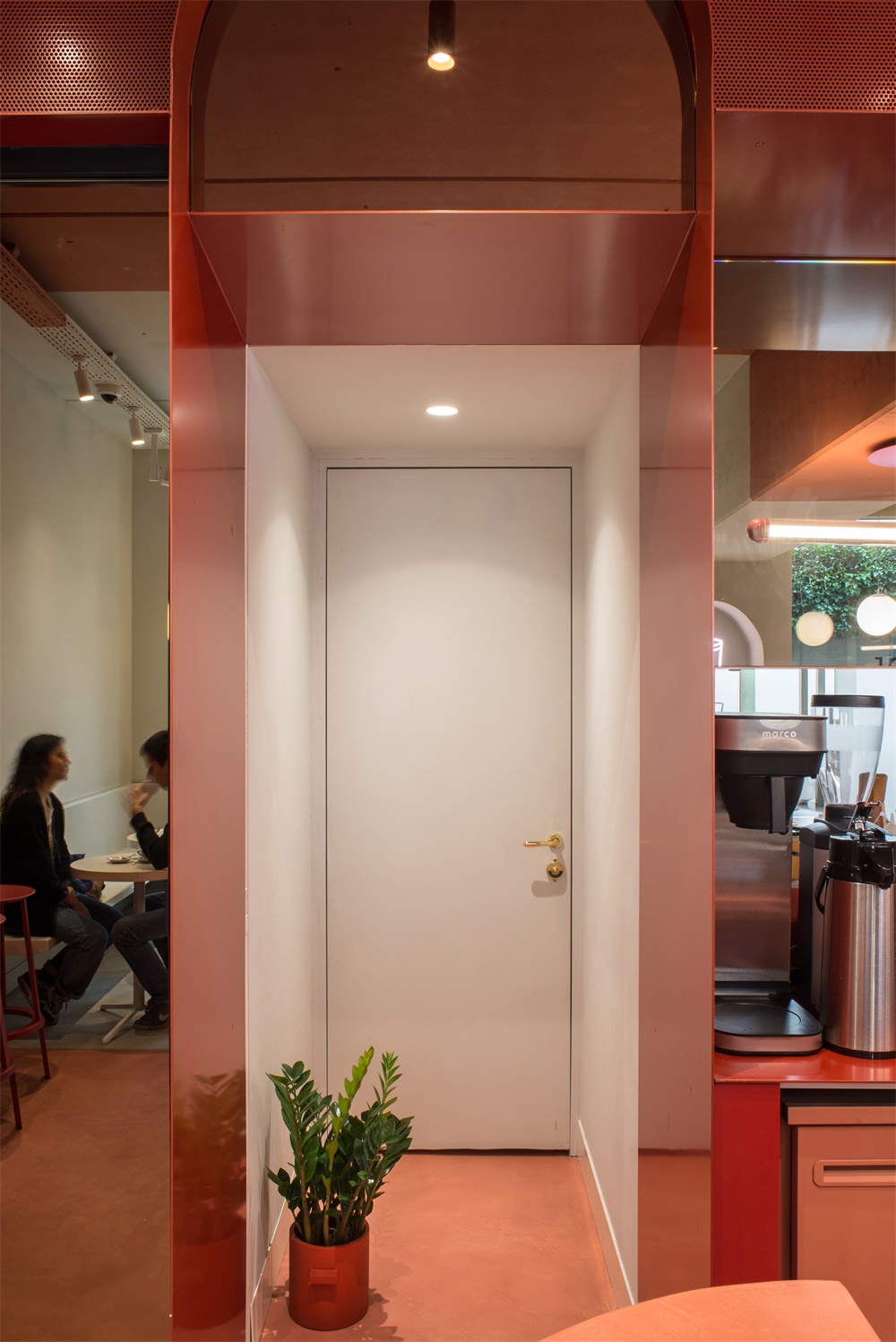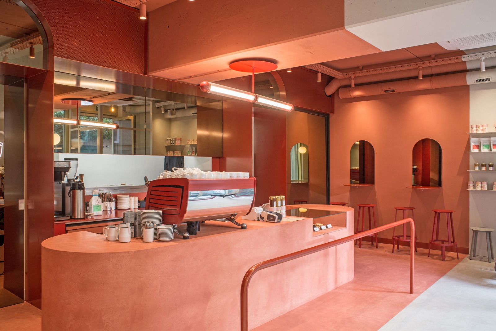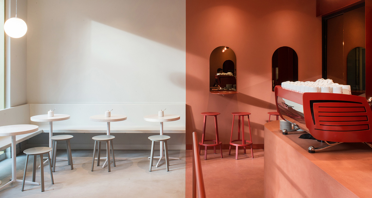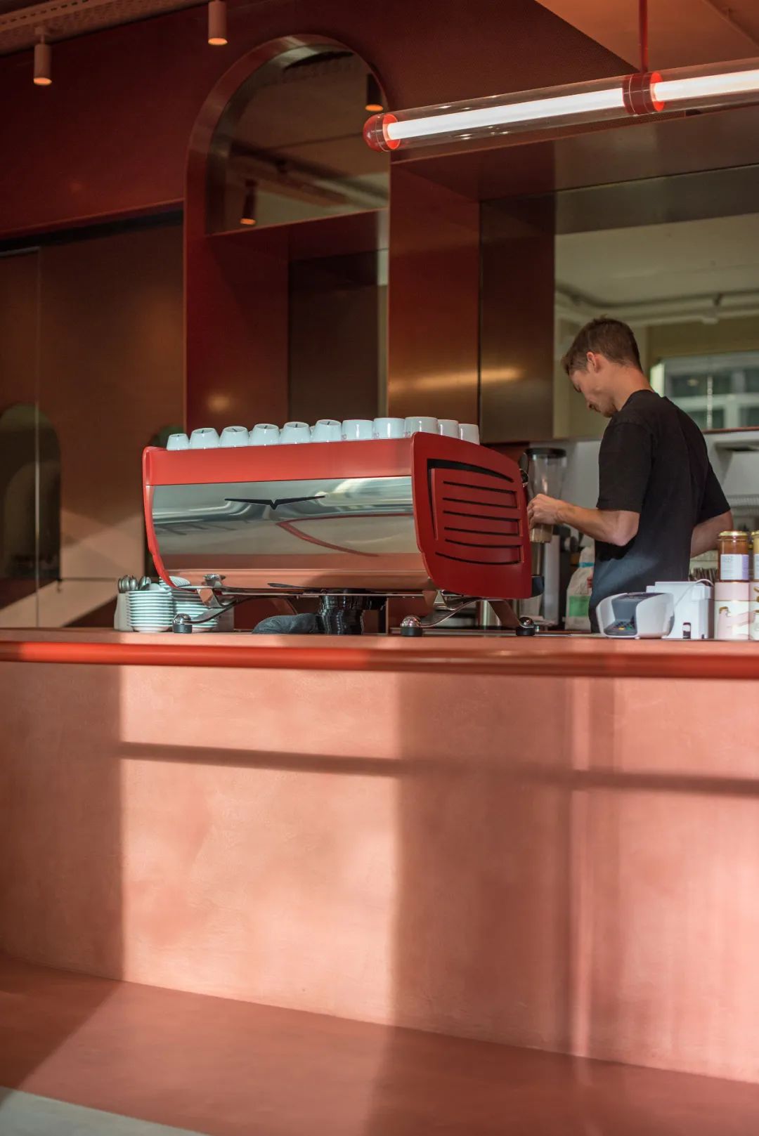 由于空间具有双重功能——咖啡馆和工作台,设计师为Buddy Buddy设计了两种颜色方案。后部包括了柜台和高凳子座位区,由特殊的金属红色与大地色混合组成。前部是温暖的白色,包含了低矮的座位区。