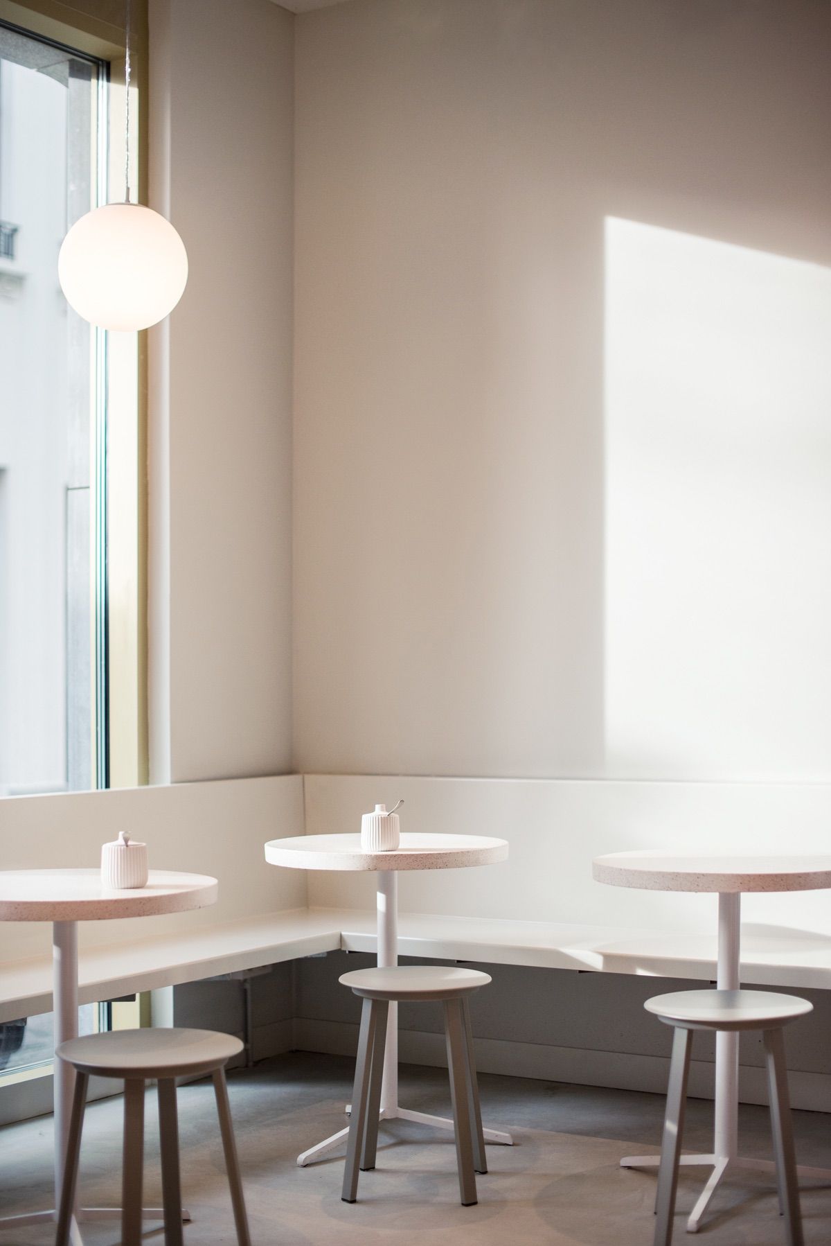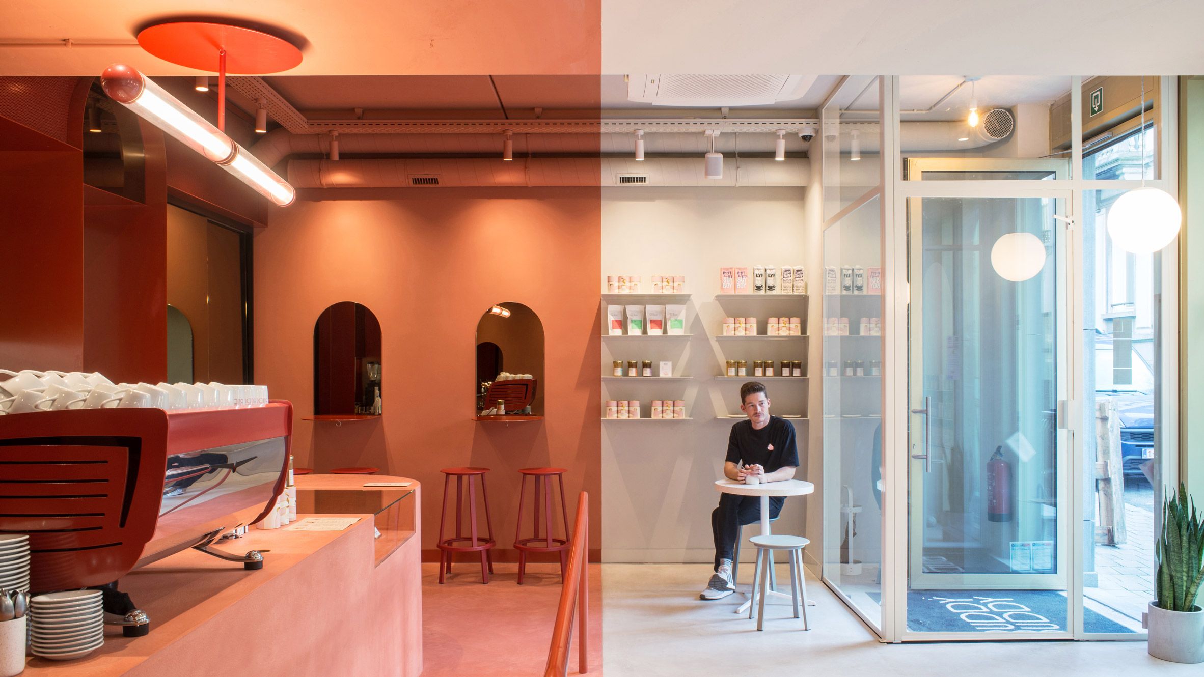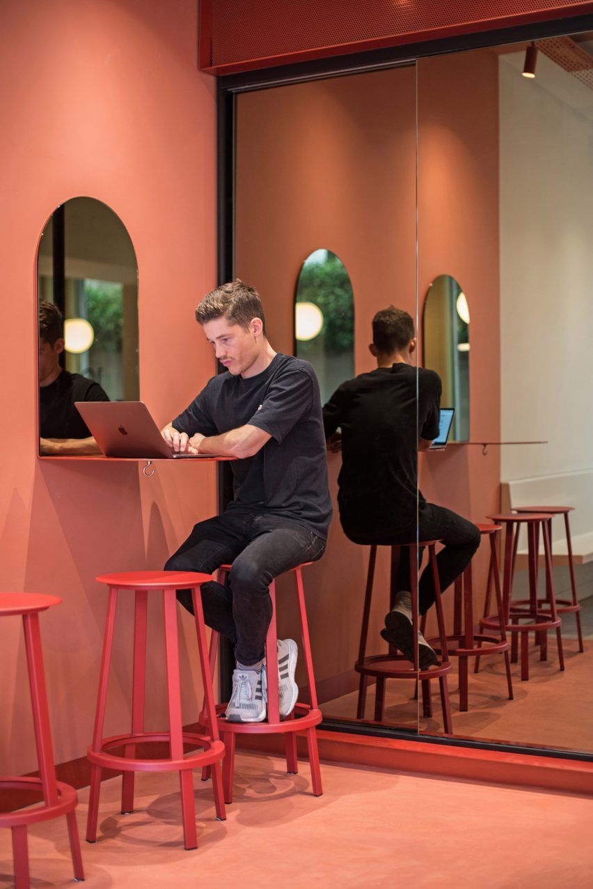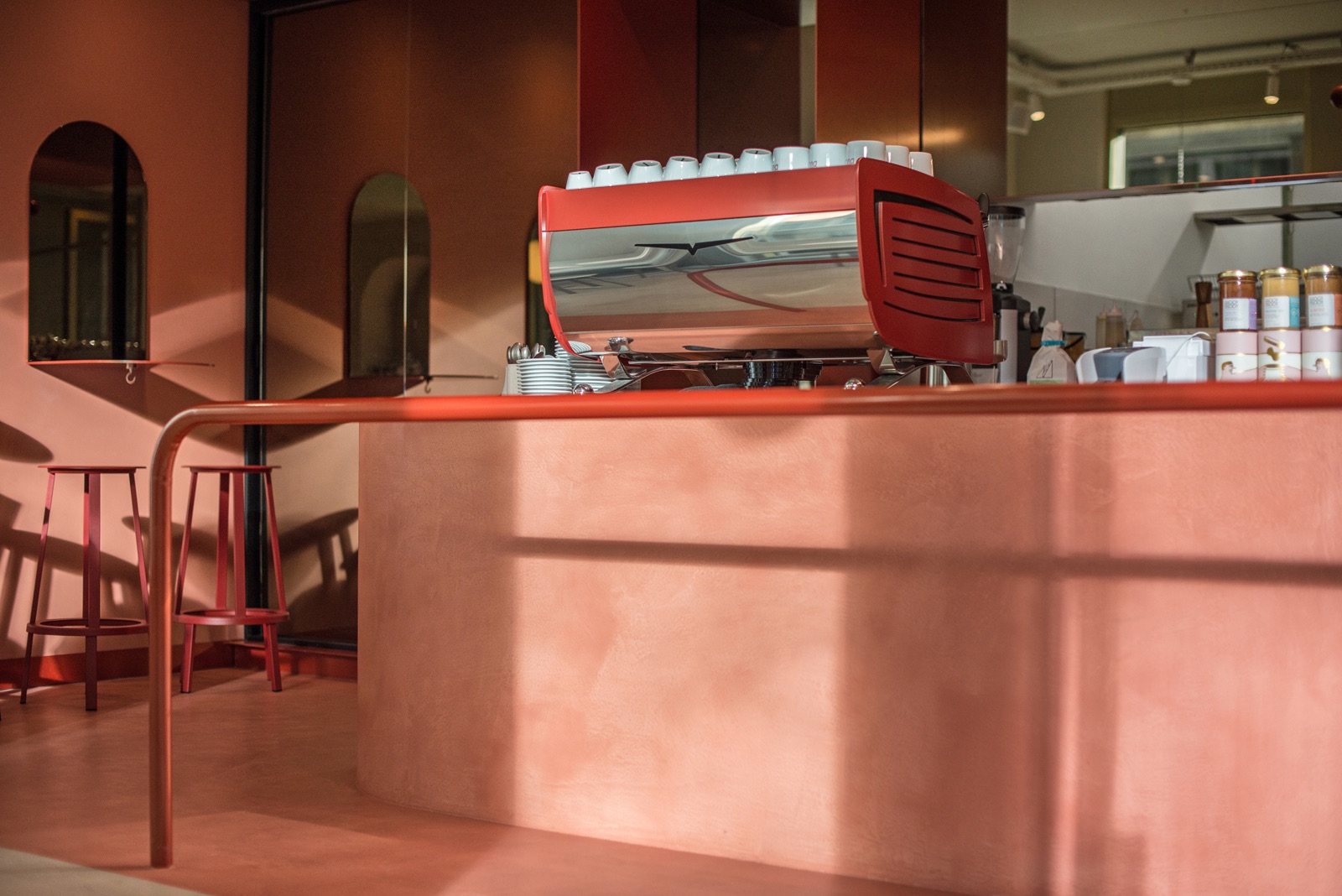 由于空间具有双重功能——咖啡馆和工作台,设计师为Buddy Buddy设计了两种颜色方案。后部包括了柜台和高凳子座位区,由特殊的金属红色与大地色混合组成。前部是温暖的白色,包含了低矮的座位区。