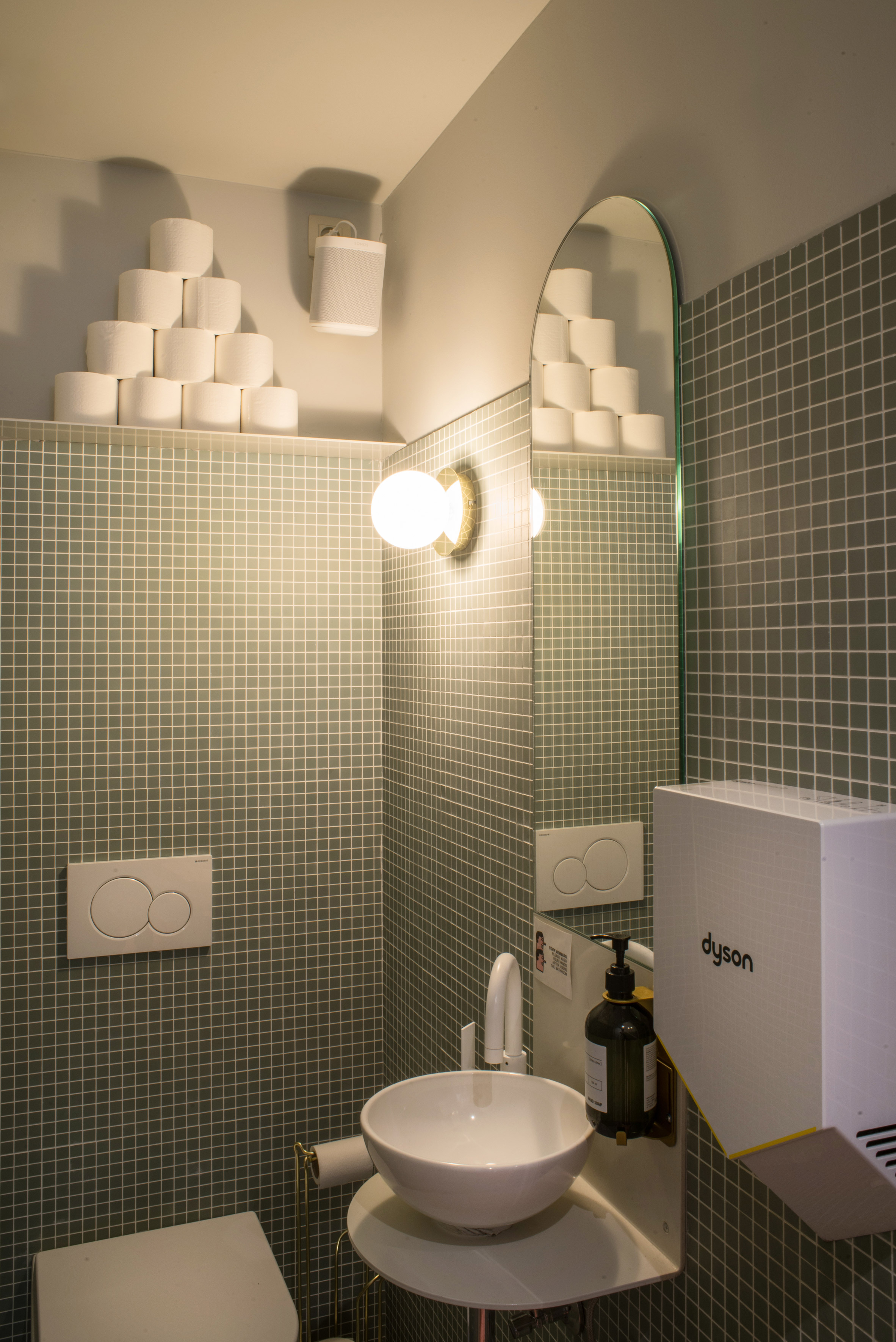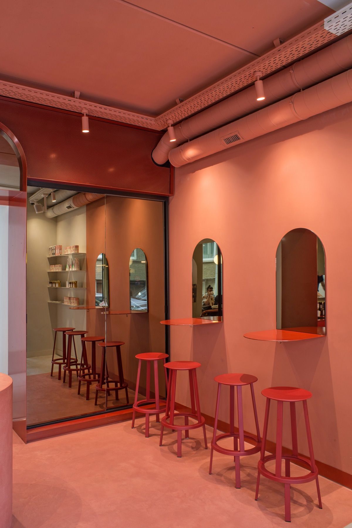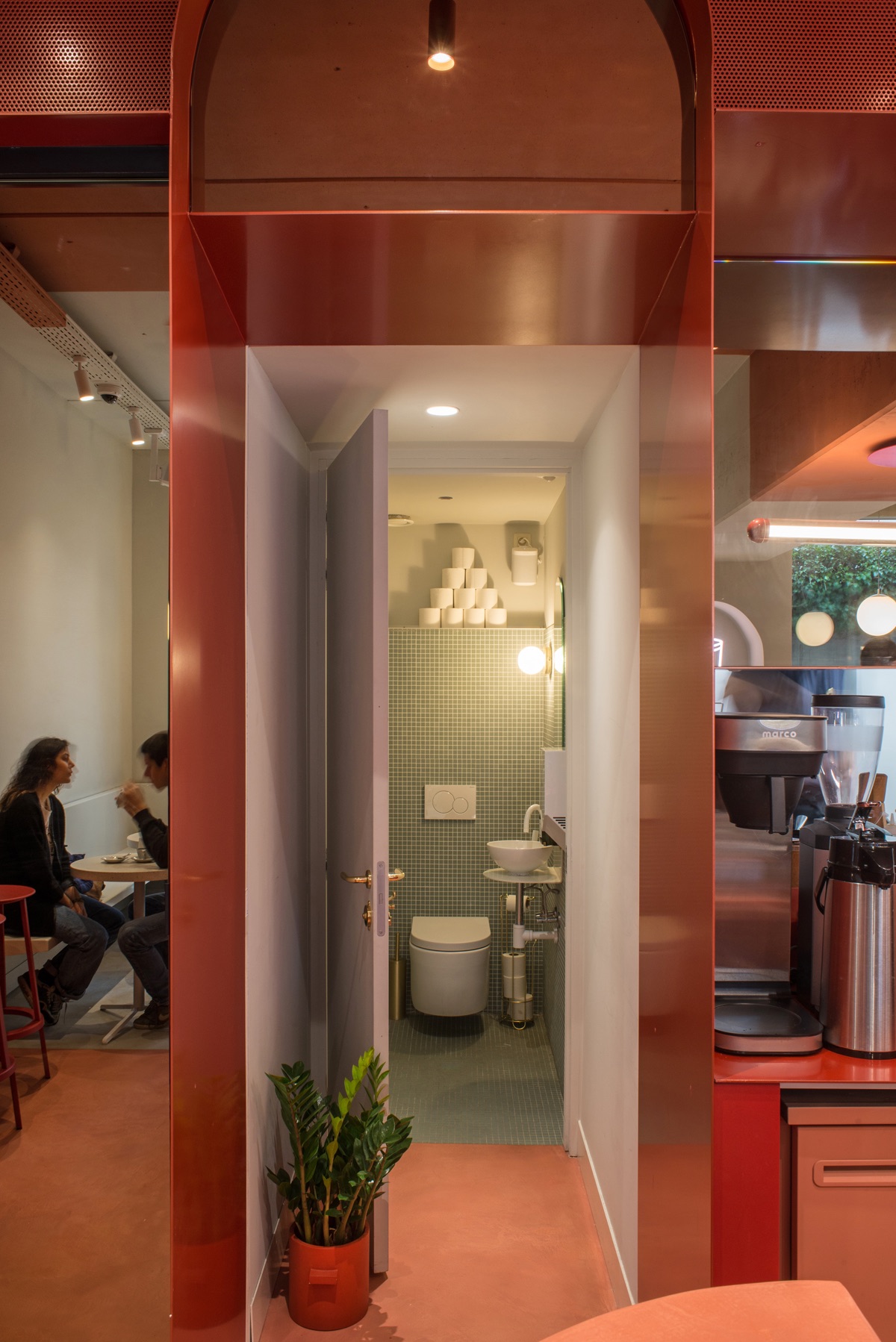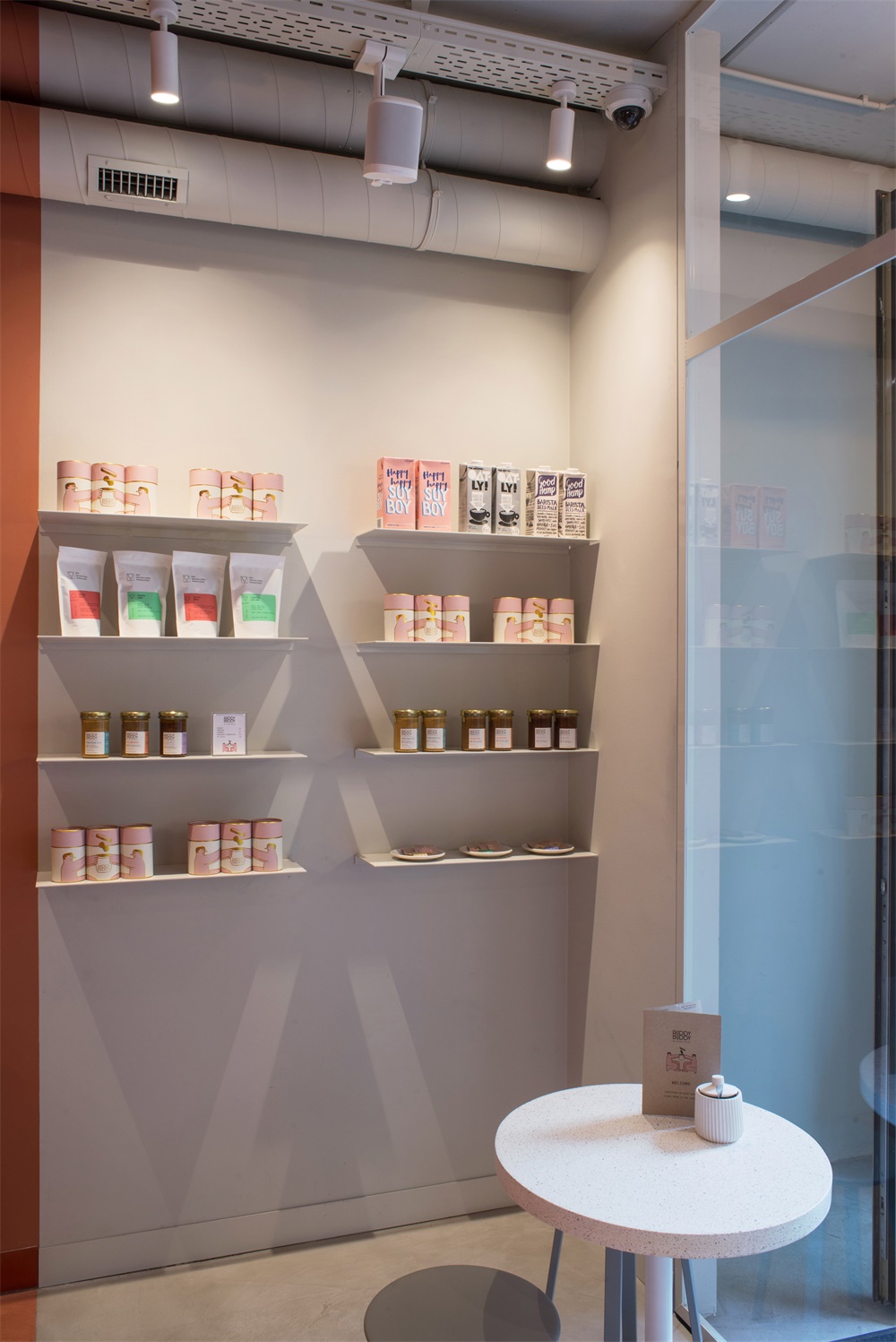 Buddy Buddy的室内陈设也在设计中扮演着重要角色。几乎所有的家具都是由定制的粉末涂层钢构件组合而成,形成了一种优雅的氛围。地板和柜台都被涂上鲜艳的塑料涂层,巨大的铜镜让这个紧凑的空间视觉上更开阔。Buddy Buddy内部的每一个小细节都经过精心设计,与业主有趣的性格和坚果黄油的美味口感相得益彰。