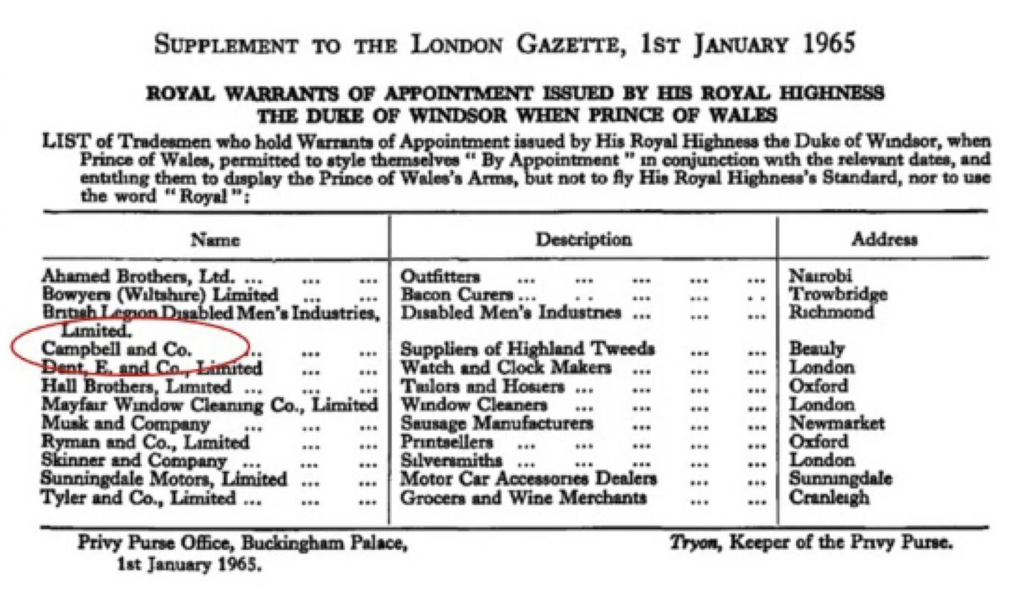 1965年,前威尔士亲王、后来的温莎公爵授予Campbell & Co.王室认证。