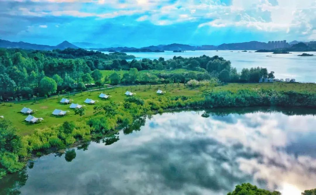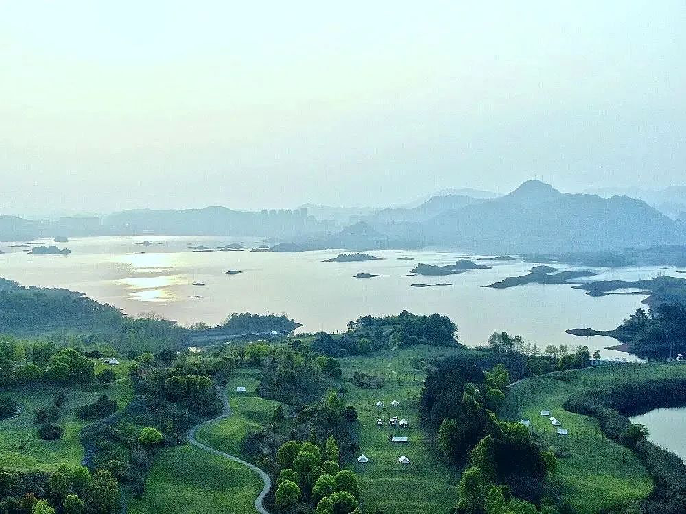 姨丈此行来到的这片营地叫做柳岸花鸣帐篷营地,位于浙江省杭州市淳安县千岛湖镇天鹅山万向路,前身是浙江省最大的高尔夫球场。占地120亩的营地拥有非常平整的草坪,据说这还是千岛湖风景区最大且最完整的露营区域。