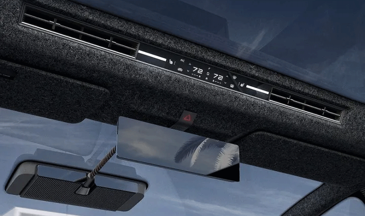 值得一提的是,整个车内由于没有多余的按键设计,空调、座椅加热等等功能都需要通过手机来操作,这也是Canoo主打的核心理念,而这些信息,你可以在手机或车顶处的显示屏上查看。