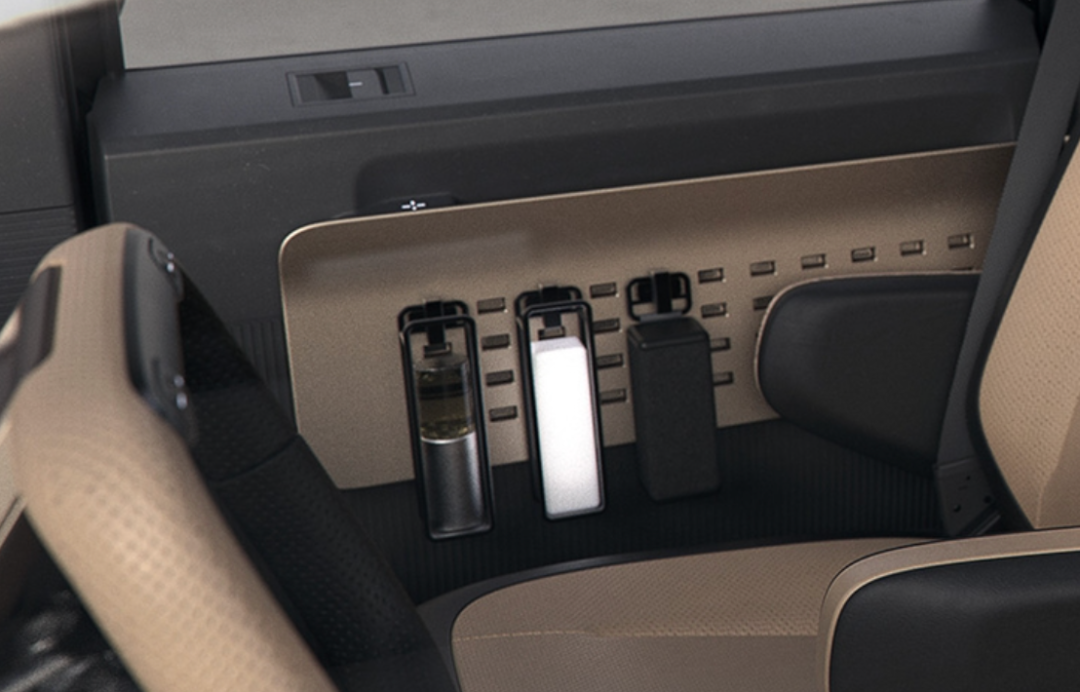 车内还拥有极为丰富的储物空间,如座椅下方的储物格、车门上的洞洞板...你可以在上面挂上各种不同的设备,有很强的扩展性。
