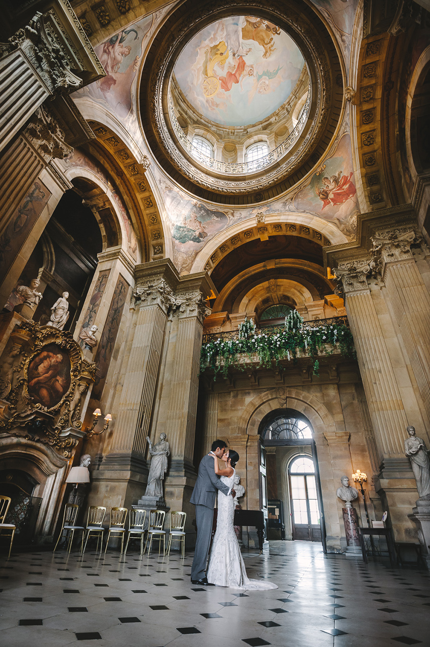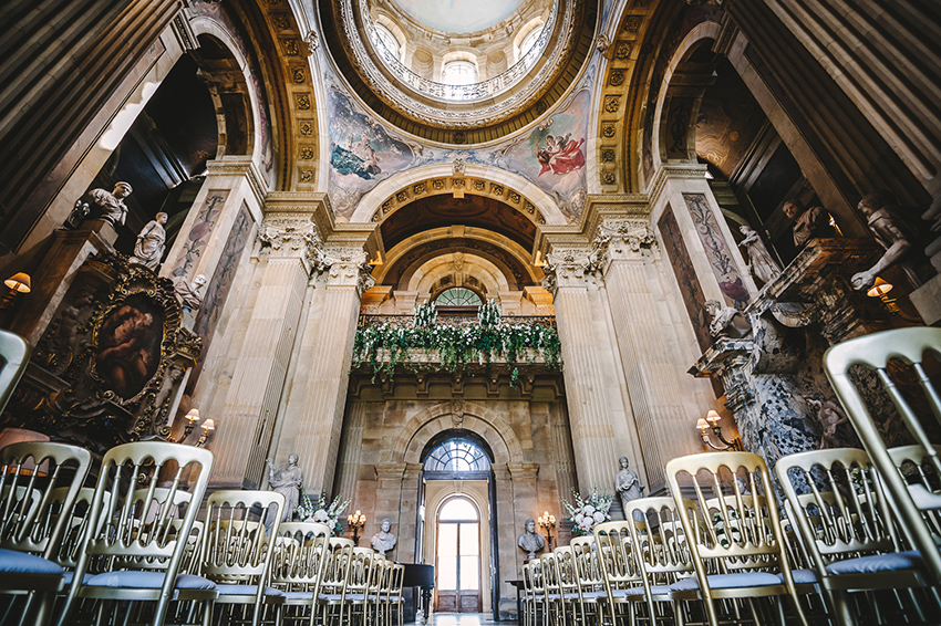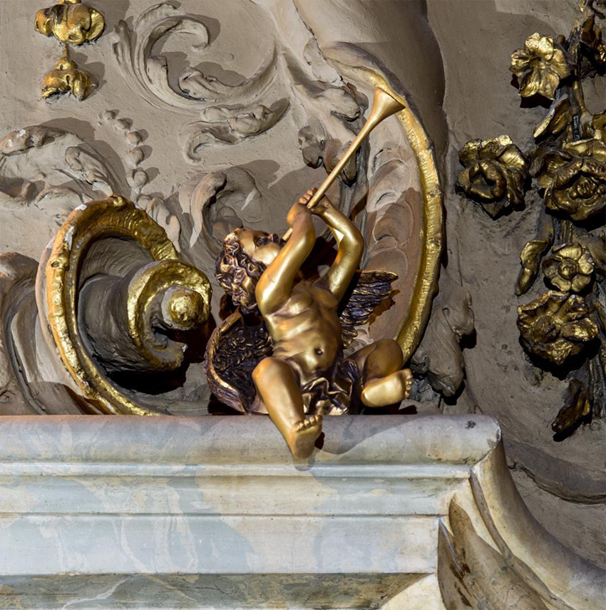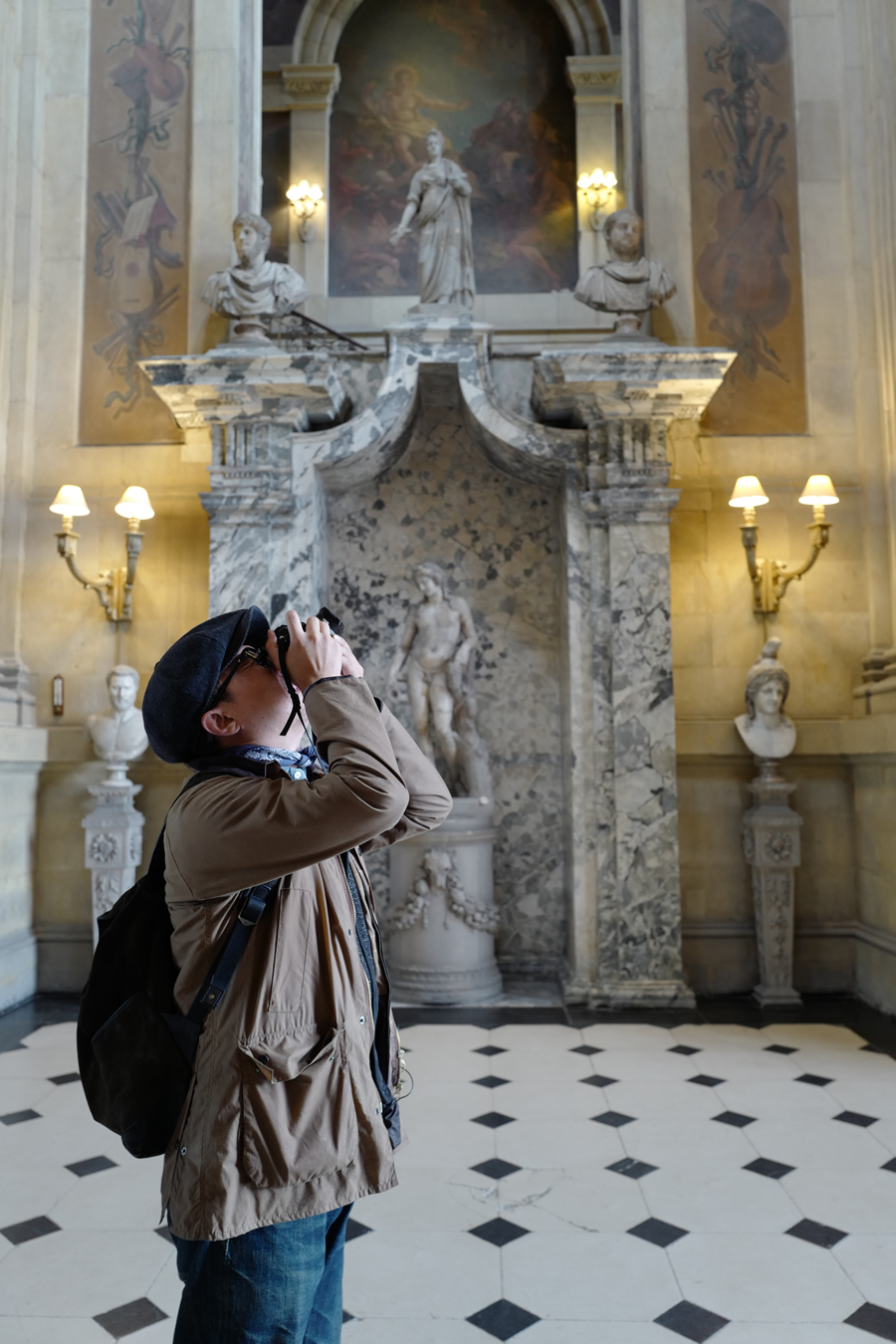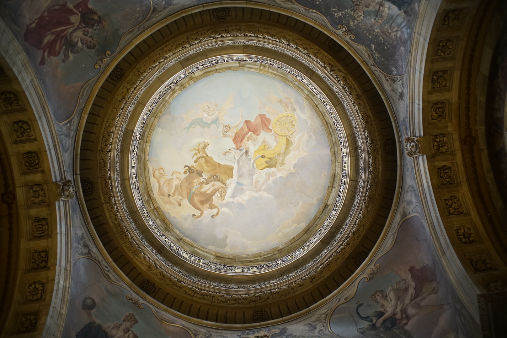 走进城堡中央的大厅,这里是整栋建筑最高且最宽阔的空间,位于大宅的中轴线上。四周充满了各式雕刻精美的柱子和雕塑,主要以希腊神话为题材,而那副位于穹顶的名作则取材于太阳神之子法厄同坠落太阳车的希腊神话。