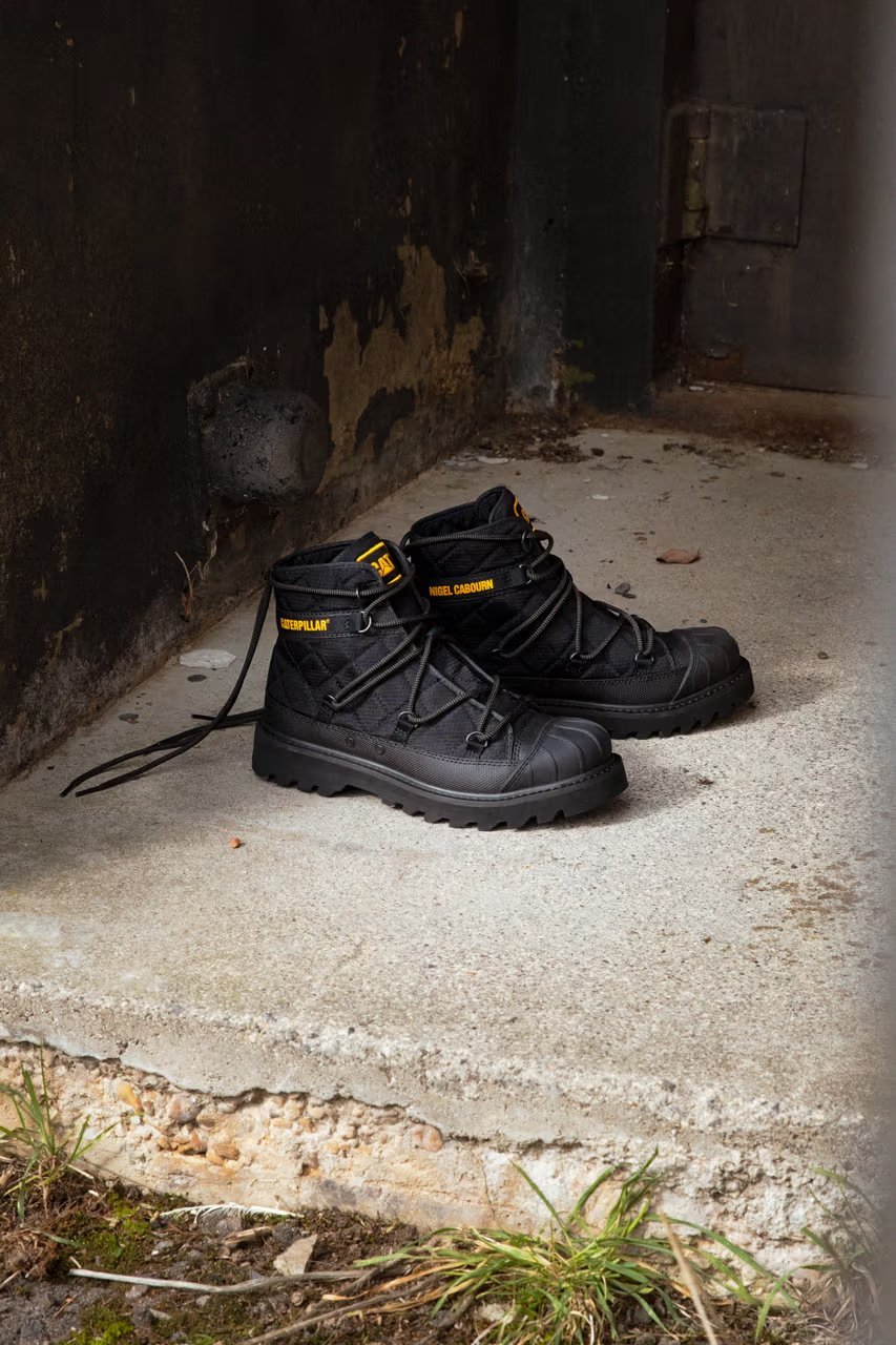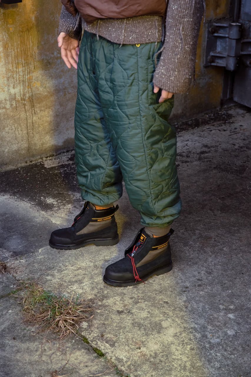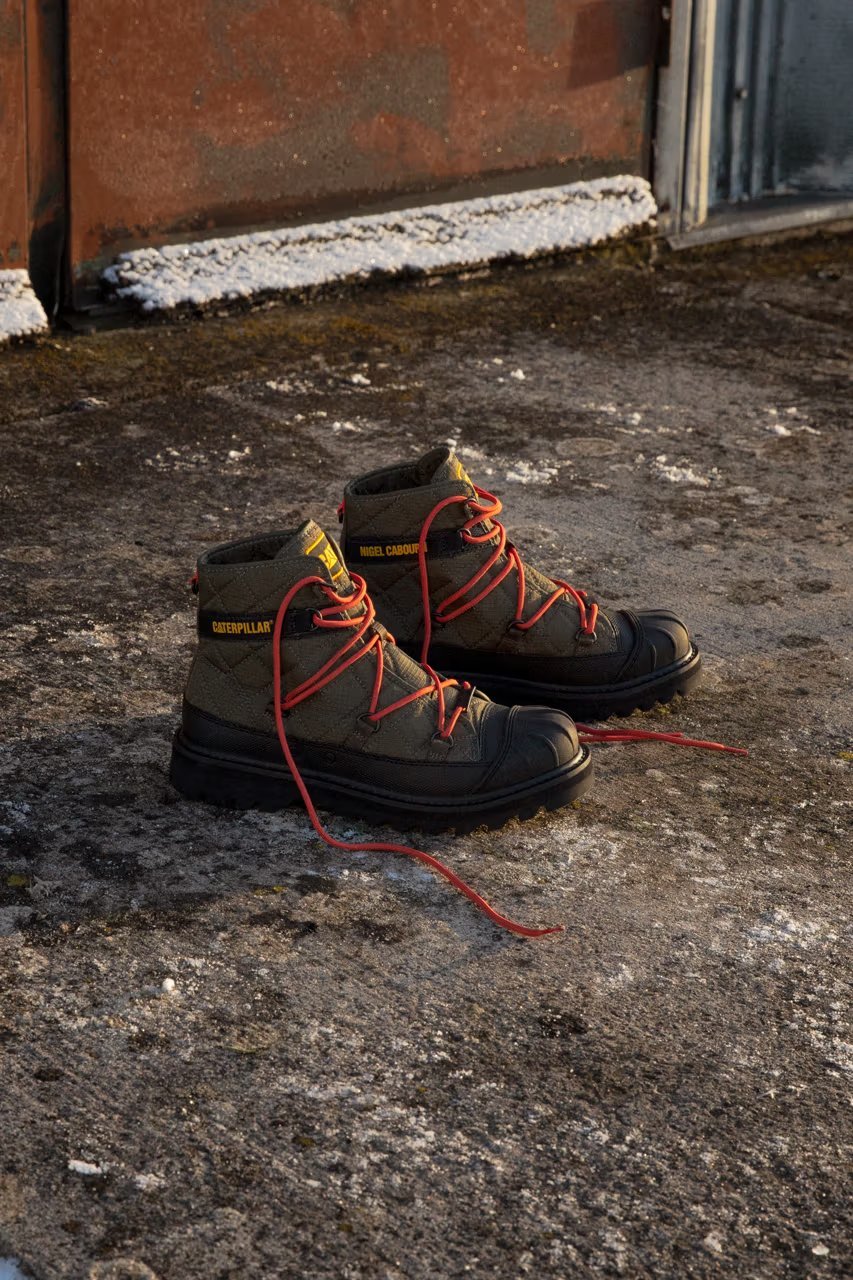与前回合作类似,Cat x Nigel Cabourn 对历史事件有着共同热情,本回灵感来自 Caterpillar Inc. 于 1956 年进行的备受赞誉的南极探险,即 “Operation Deepfreeze” 行动。Cat x Nigel 将功能性材料与 Nigel Cabourn 的军事传统相结合,对原始 Omaha 和 Utah 廓形进行变奏处理。针对受军装靴启发的 Omaha ,Cat 为其赋予 3D 打印鞋头和由挡泥板组成的厚实外底,以让其维持经典重型感。而鞋面则采用绗缝尼龙,以增加绝缘性同时彰显崭新工业外观。最后,Nigel Cabourn 还设计了网状系带系统,旨在模仿标志性的 Expedition 派克大衣。