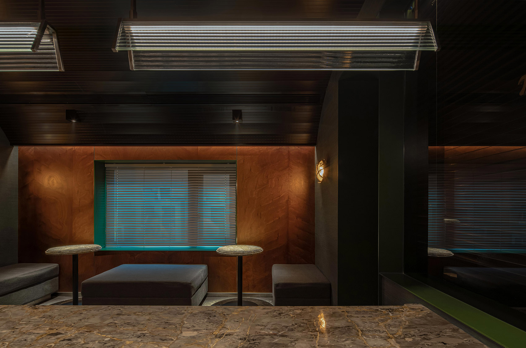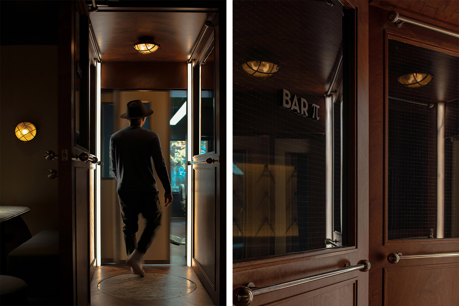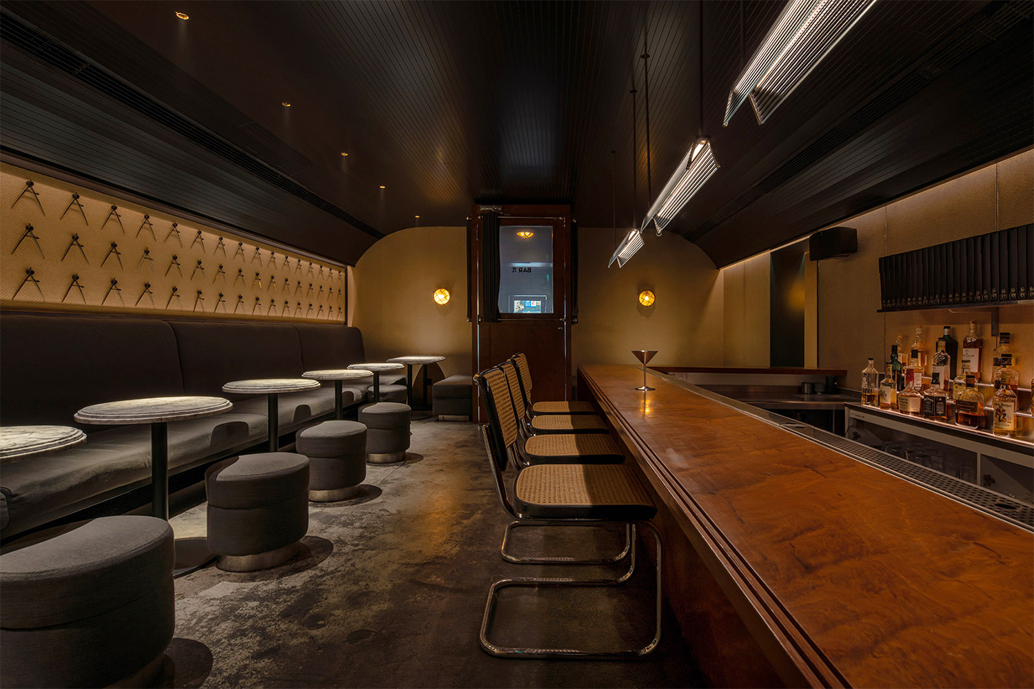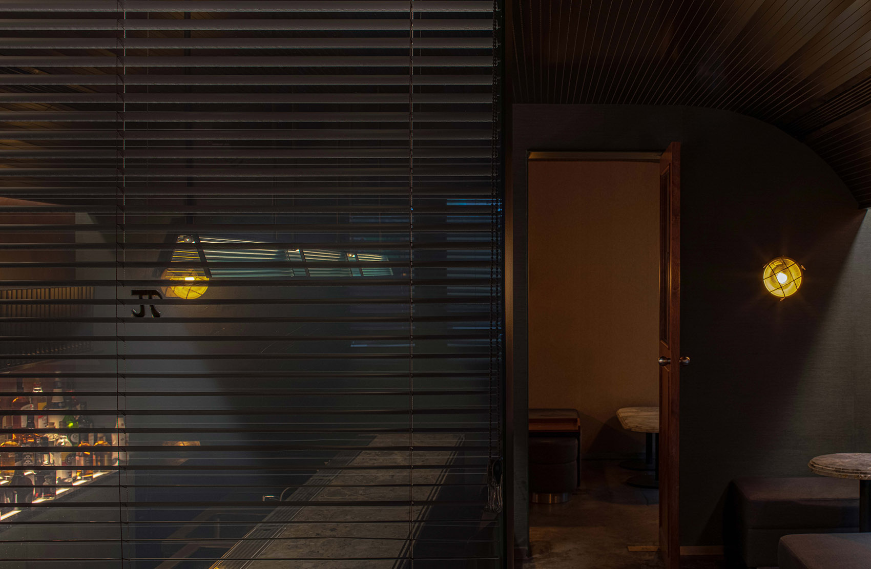 “Bar π”重要的设计灵感来自2016年的好莱坞电影《隐藏人物》。60年代美国办公空间里会出现的玻璃灯罩吊灯、复古百叶窗、方格磨砂玻璃、THONET经典椅的藤编质感,共同营造了区别于传统的“美式风格”。空间的整体呈现,每个细节都有它的作用,是无法割裂来看的。但一个个巧思般的细节,欧式车厢和美式办公室风格的结合,都在润物无声的烘托出设计师想要讲述的空间故事。