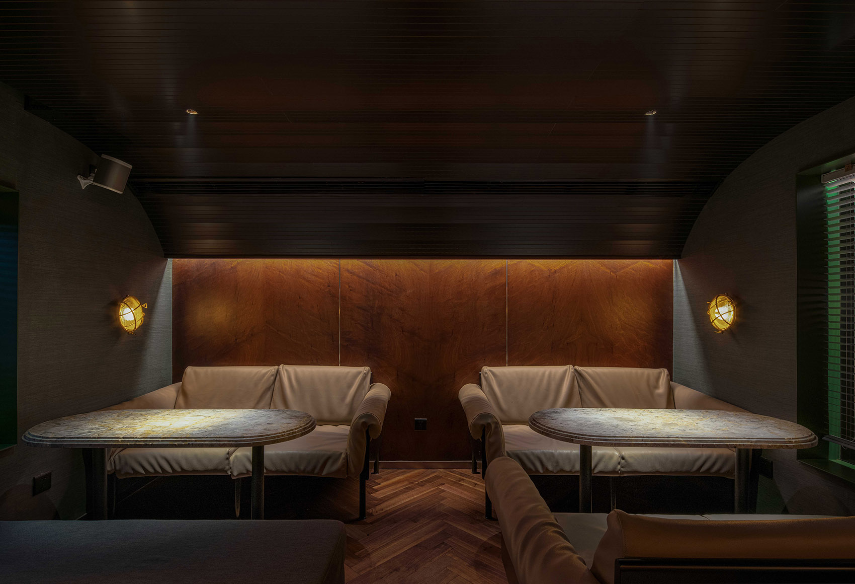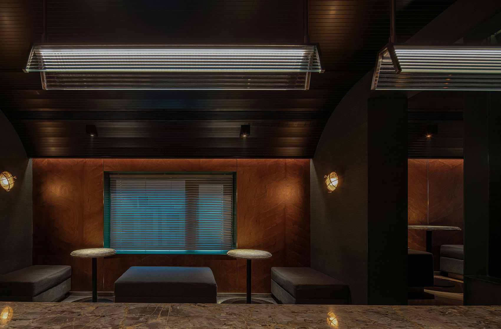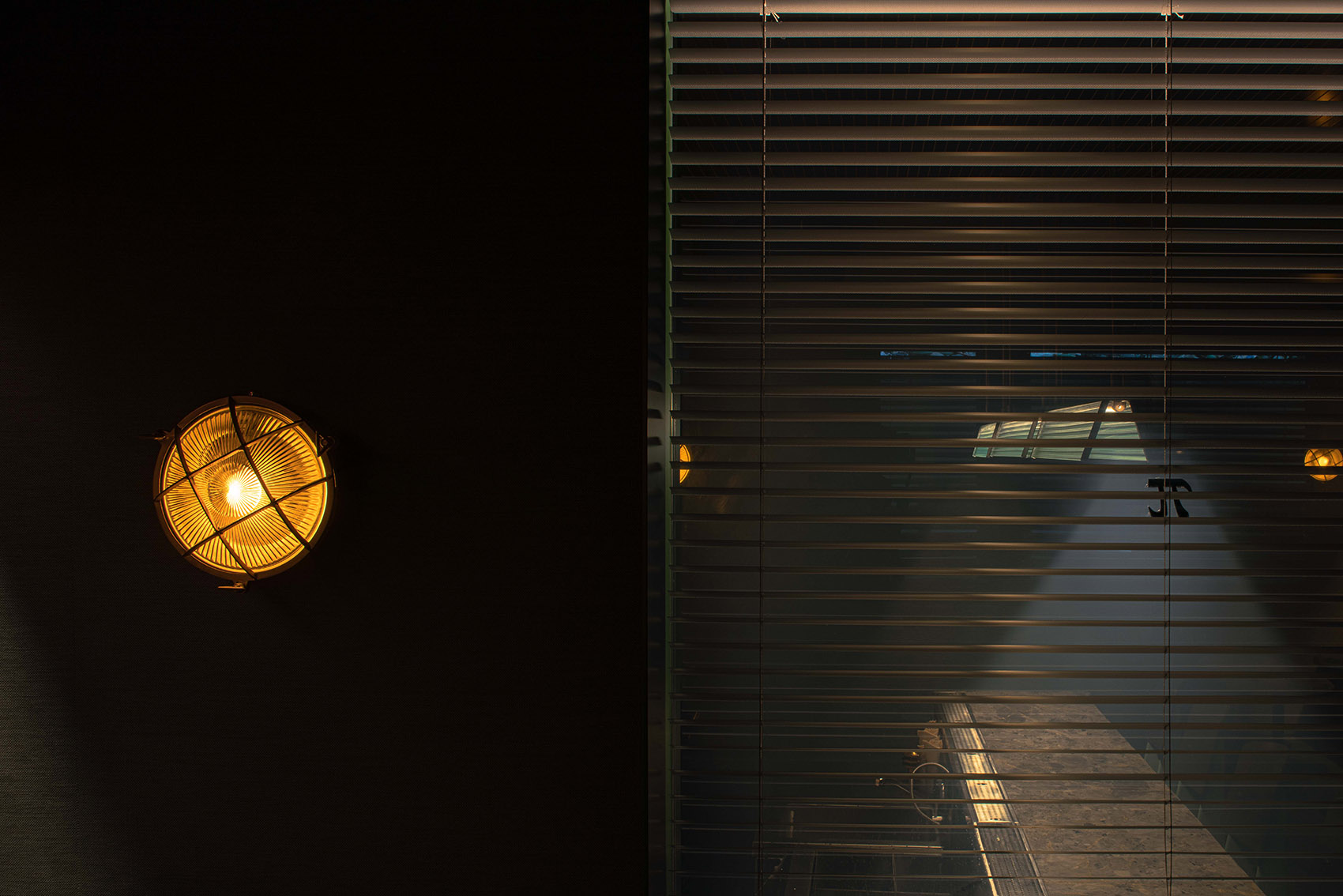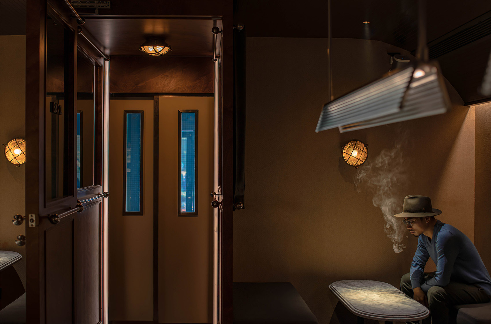 “Bar π”重要的设计灵感来自2016年的好莱坞电影《隐藏人物》。60年代美国办公空间里会出现的玻璃灯罩吊灯、复古百叶窗、方格磨砂玻璃、THONET经典椅的藤编质感,共同营造了区别于传统的“美式风格”。空间的整体呈现,每个细节都有它的作用,是无法割裂来看的。但一个个巧思般的细节,欧式车厢和美式办公室风格的结合,都在润物无声的烘托出设计师想要讲述的空间故事。