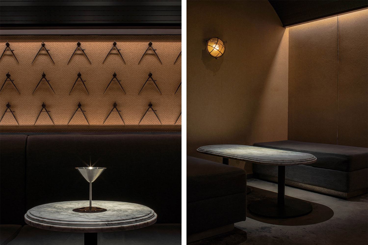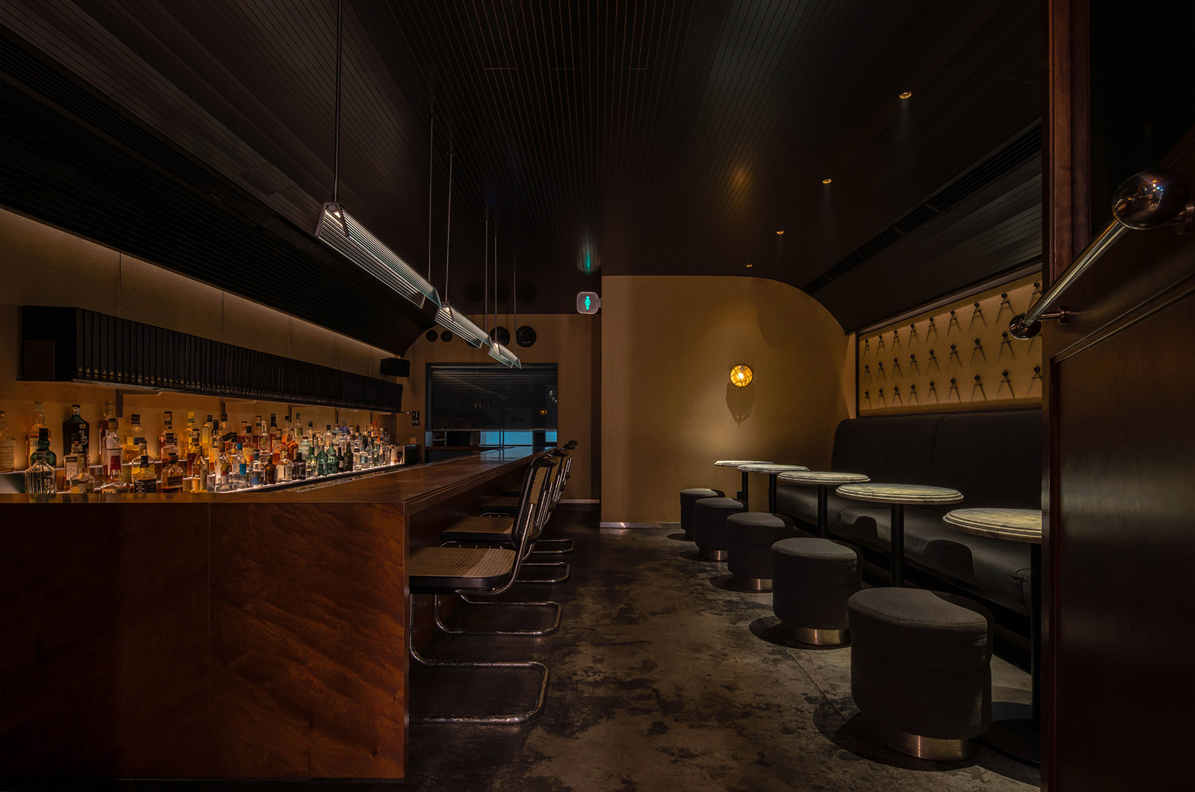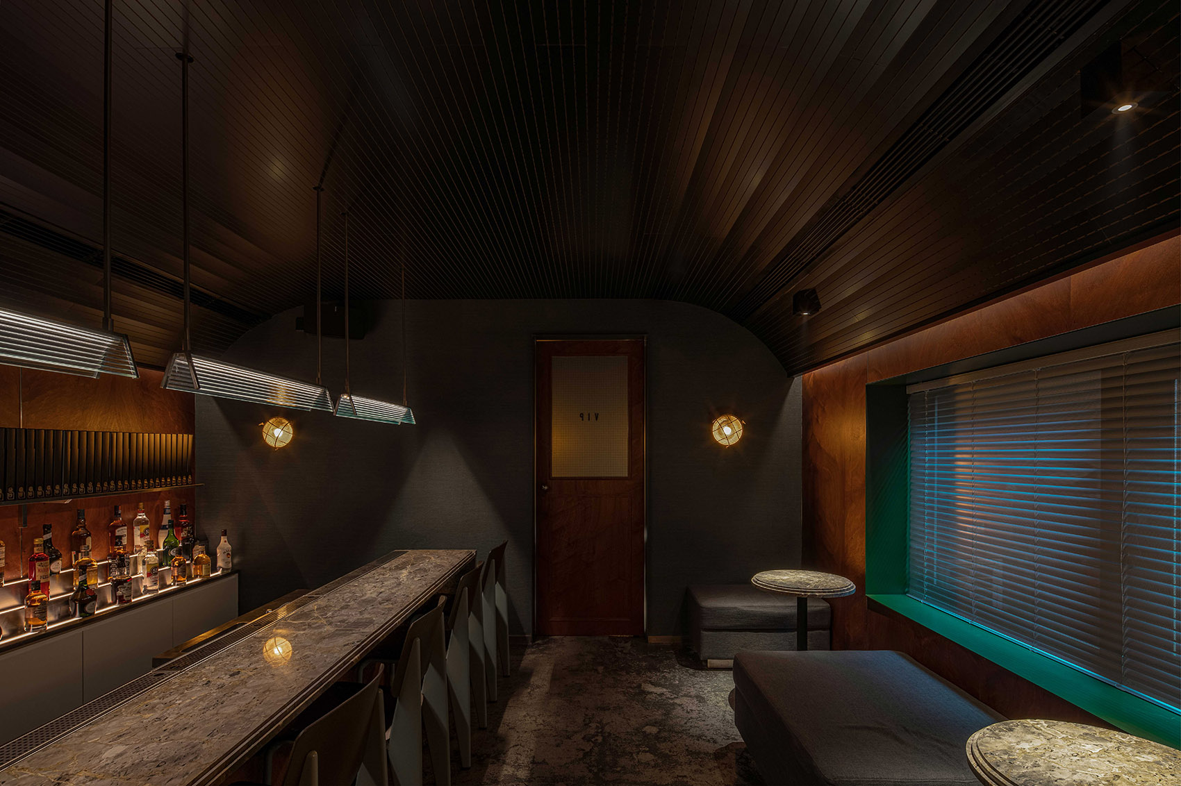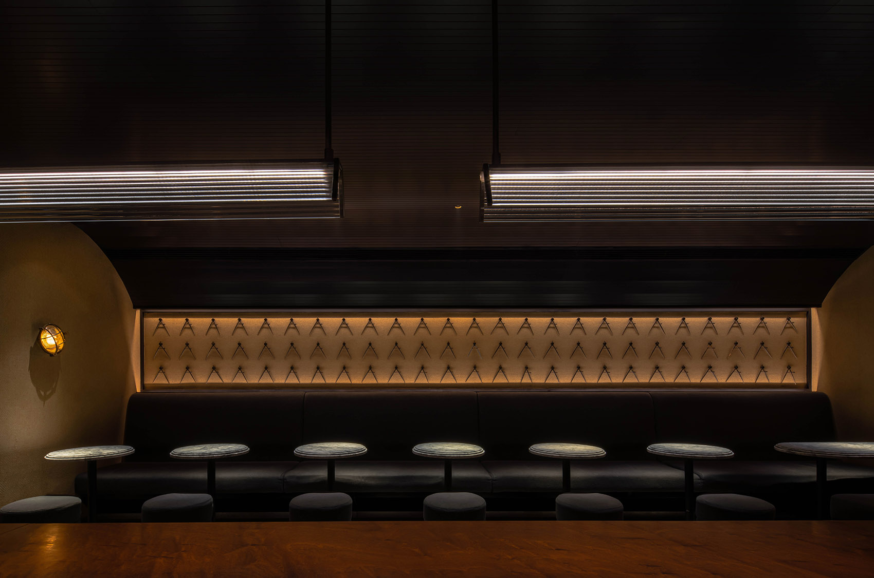 “Bar π”重要的设计灵感来自2016年的好莱坞电影《隐藏人物》。60年代美国办公空间里会出现的玻璃灯罩吊灯、复古百叶窗、方格磨砂玻璃、THONET经典椅的藤编质感,共同营造了区别于传统的“美式风格”。空间的整体呈现,每个细节都有它的作用,是无法割裂来看的。但一个个巧思般的细节,欧式车厢和美式办公室风格的结合,都在润物无声的烘托出设计师想要讲述的空间故事。
