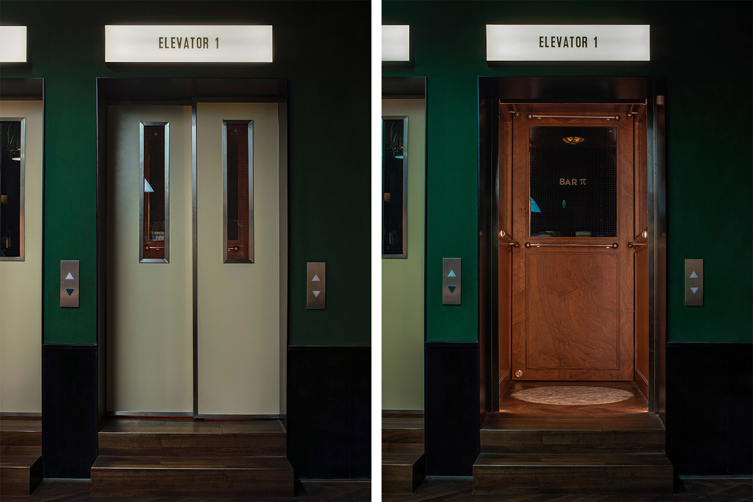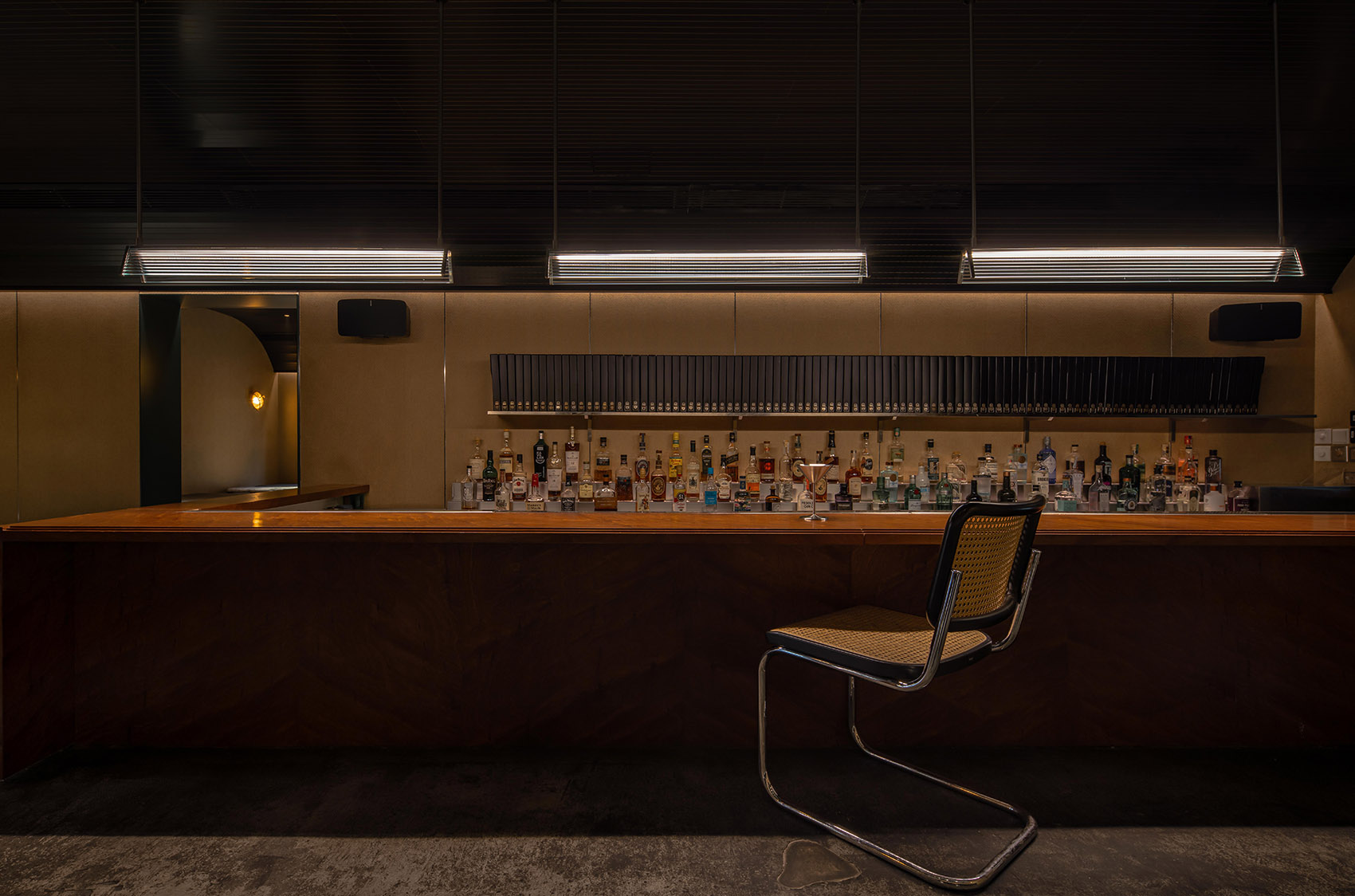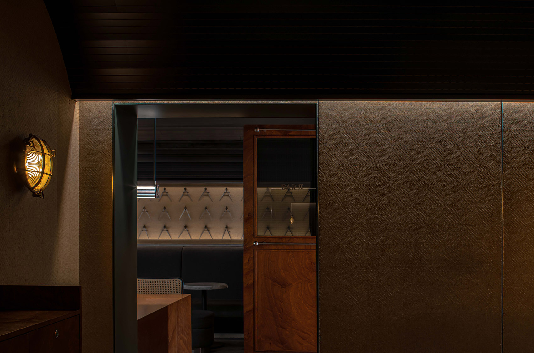 “Bar π”作为成都真正意义上的隐藏式酒吧之一,绝对“派头”十足。门头和空间前部完全作为复古男士BARBERSHOP「BUTCHER」的营业空间。与其他隐藏式酒吧双动线不同的是,你需要径直穿过BARBERSHOP主空间,直接来到酒吧的电梯轿厢式入口。按动“机关”进入狭窄的轿厢空间,再打开大门,终于豁然开朗。再从吧台到空间后部的VIP ROOM,整体层层递进,行进动线充满探索的趣味。