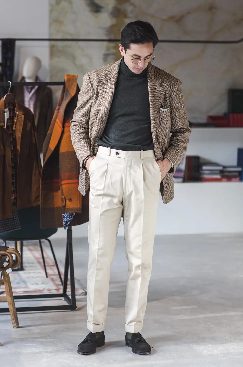中高腰和单褶裥都是比较经典的设计,所以我们选择了更修身的裤型,裤脚也做了翻边,十分休闲,适合365天各种场合的穿着。