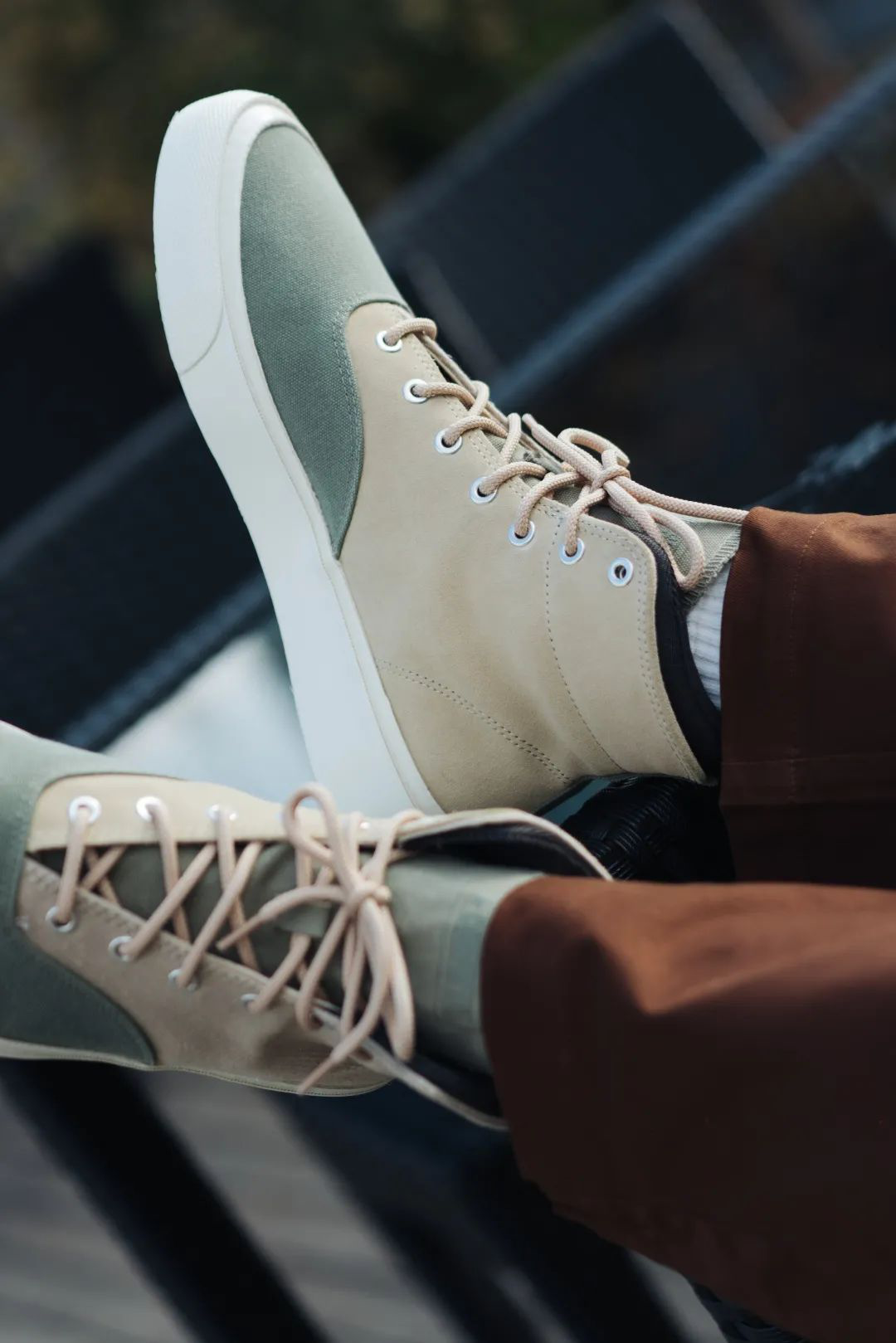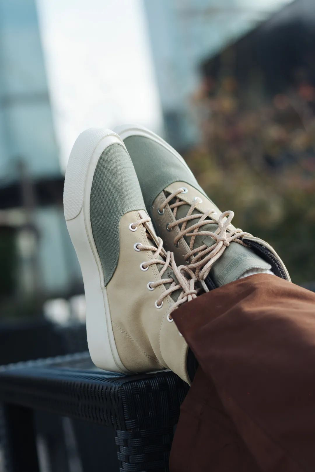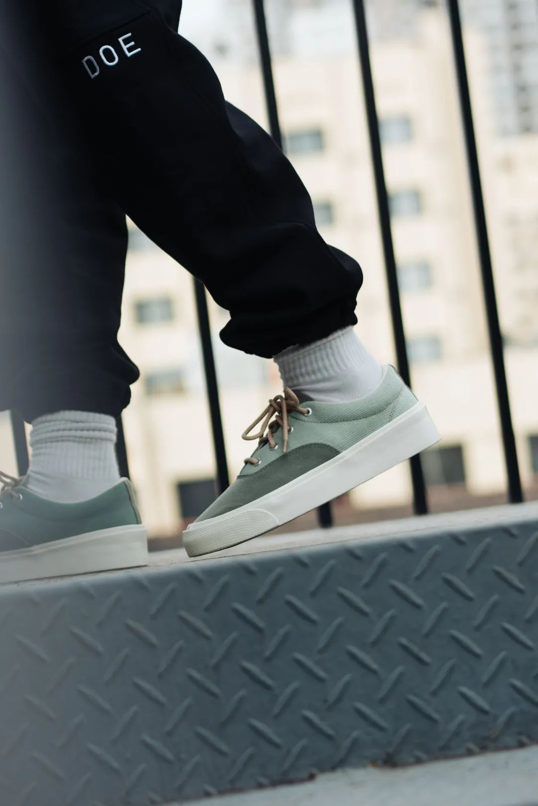 鞋面使用深浅不一的绿色和棕色,结合麂皮、灯芯绒、帆布等材质的不对称拼接,创造出丰富的视觉层次,而高低帮的设计也为日常穿着搭配带来了更多的选择。
