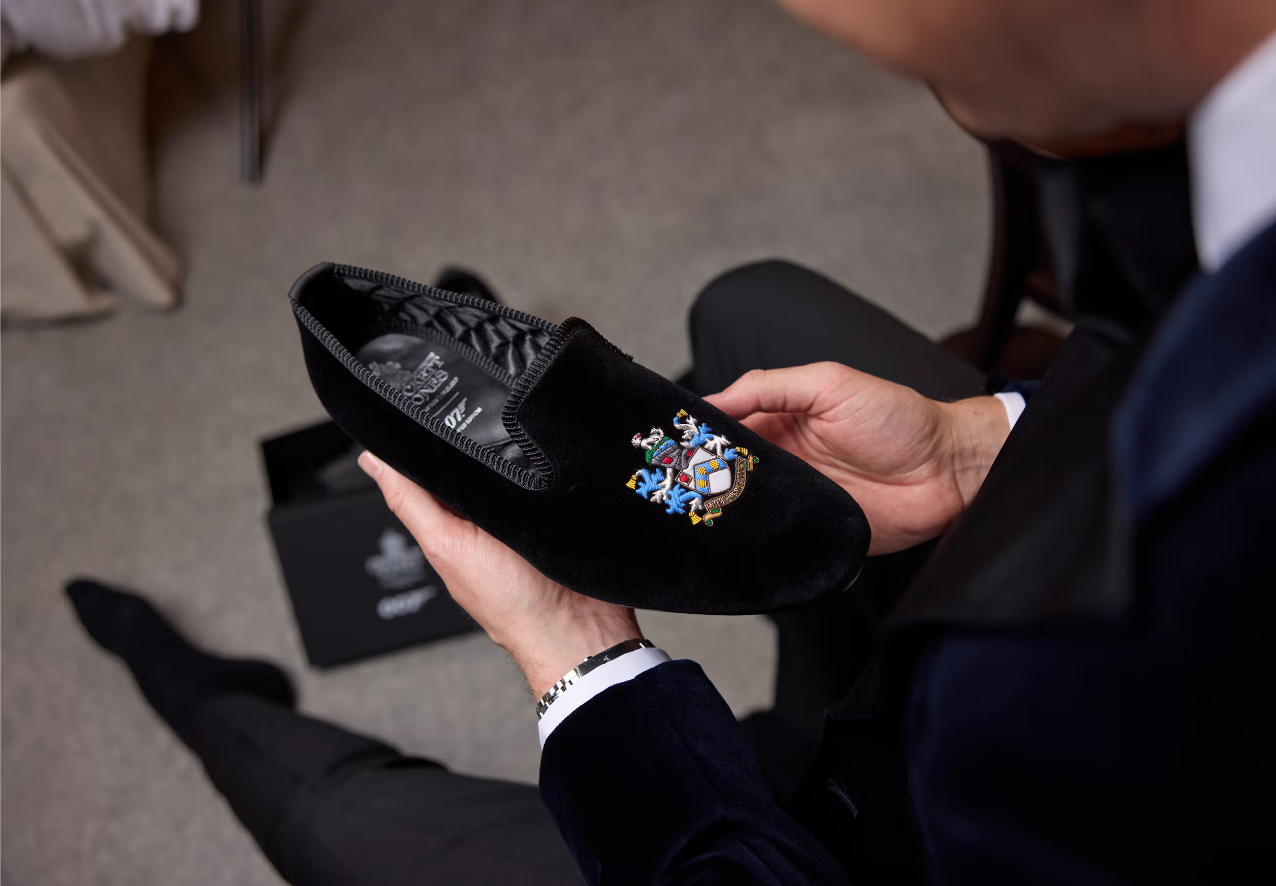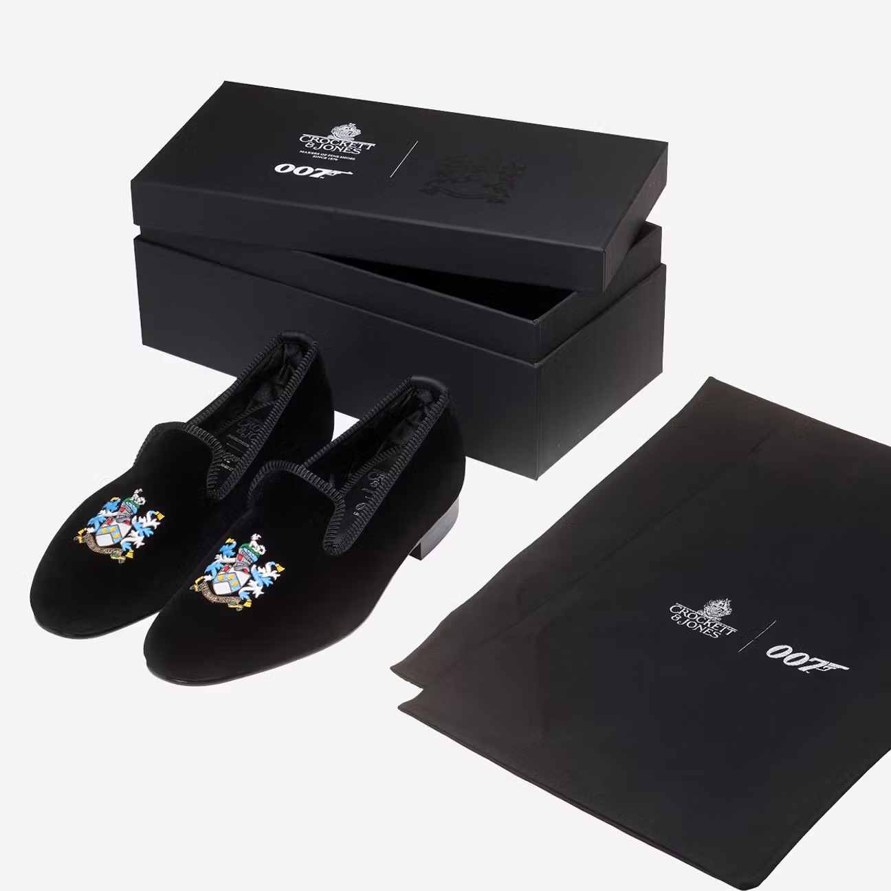 至于经奢华演绎的 Albert Slipper ,则是 Crockett & Jones 对传统的颂歌。这款鞋应用天鹅绒制成,配有奢华绗缝衬里,其中饰有邦德家族徽章,该徽章于 1969 年首次出现在《女王密使》中。为与 007 主题保持一致,还印有邦德家族座右铭 “Orbis non sufficit” 。