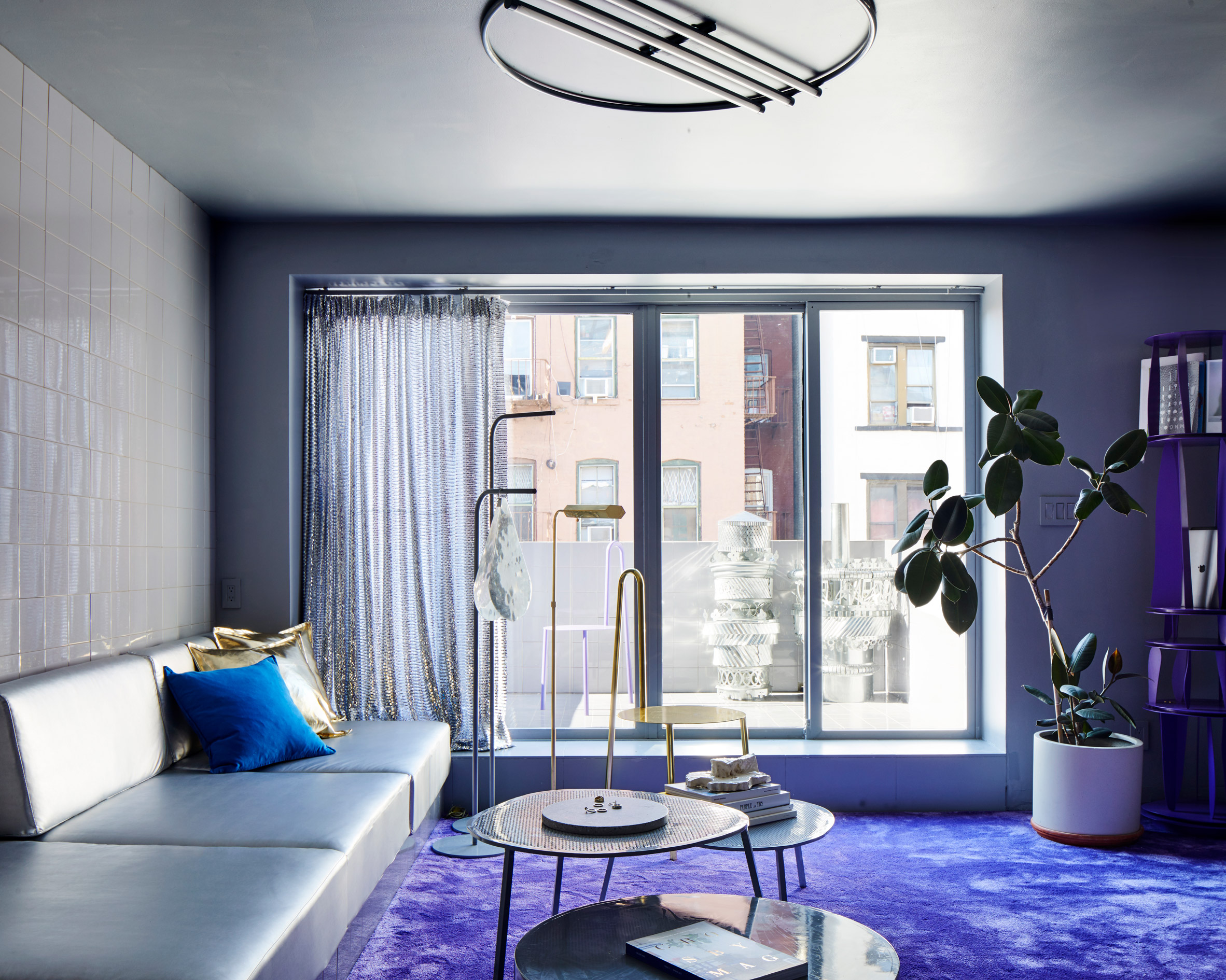 Crosby Studios创始人哈里·努里耶夫(Harry Nuriev)和合伙人泰勒·比林格(Tyler Billinger)曾在纽约公寓的翻新工程中包括瓷砖墙,紫色地毯和皮制橱柜。共同经营Crosby Studios的设计师使用大胆的色彩,几何形状和折衷的材料将其个人风格带入该市NoLita社区的住所。