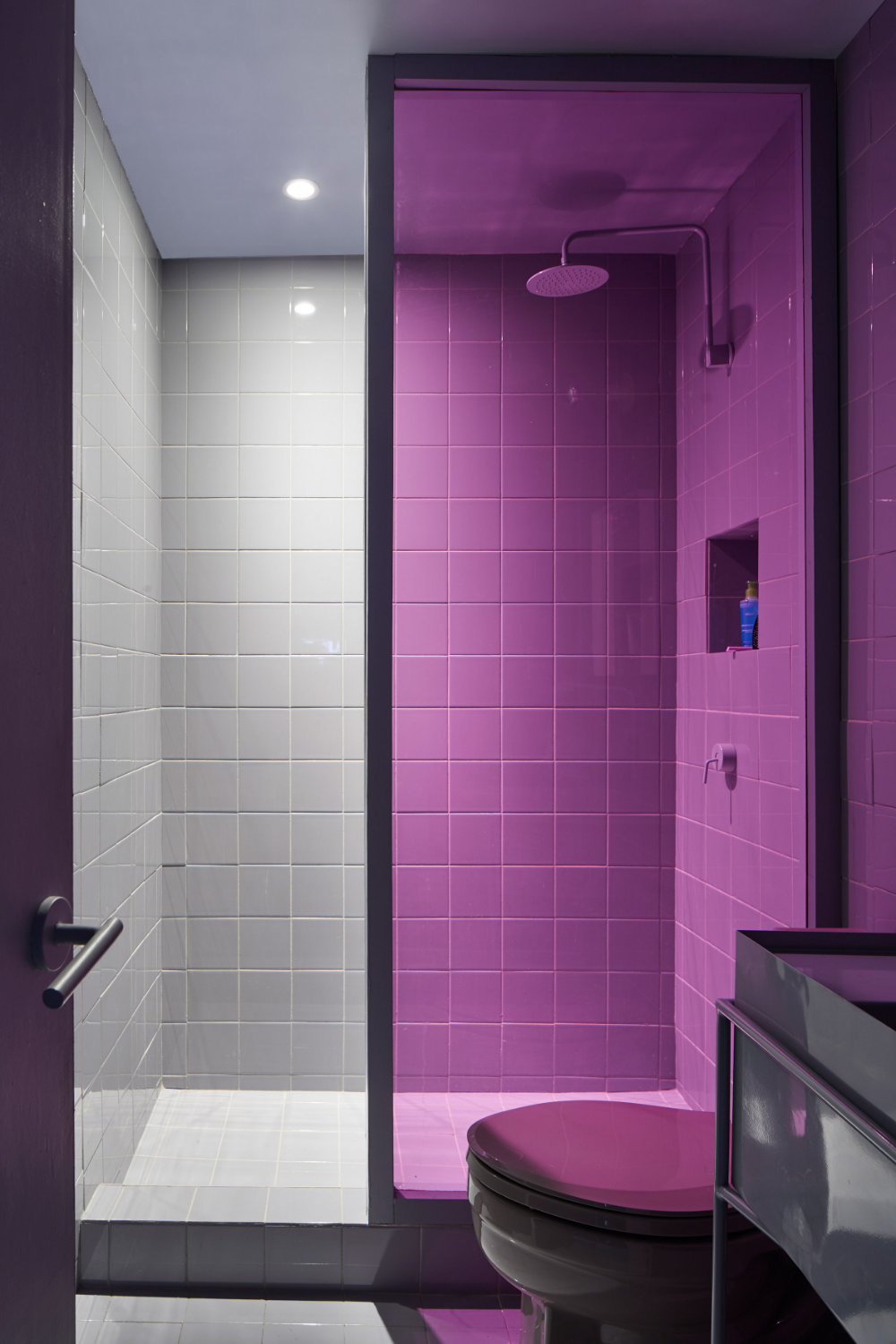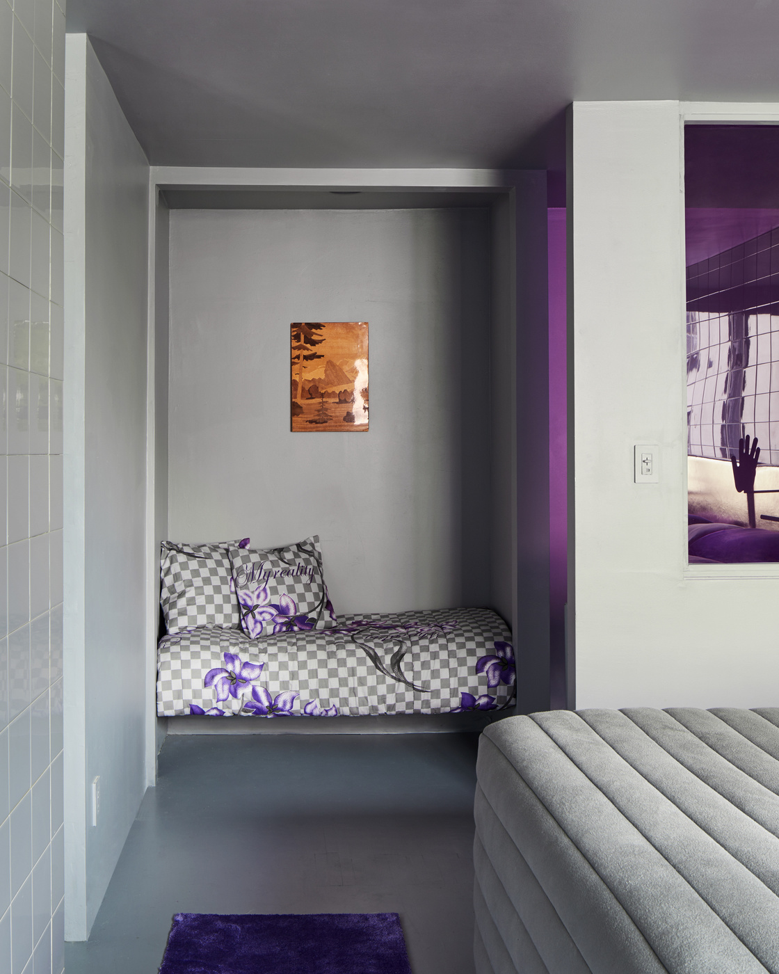白色瓷砖继续在卧室的墙上。紫色枕头和一组圆形边桌为原本鲜明的内部增添色彩。在房间一角设置了一个小壁creates,形成了一个额外的休息区。箱形盆安装在圆柱框架内,以在浴室中形成洗手盆。浴室和厨房的水龙头和水龙头是由Dorf Australia设计的。