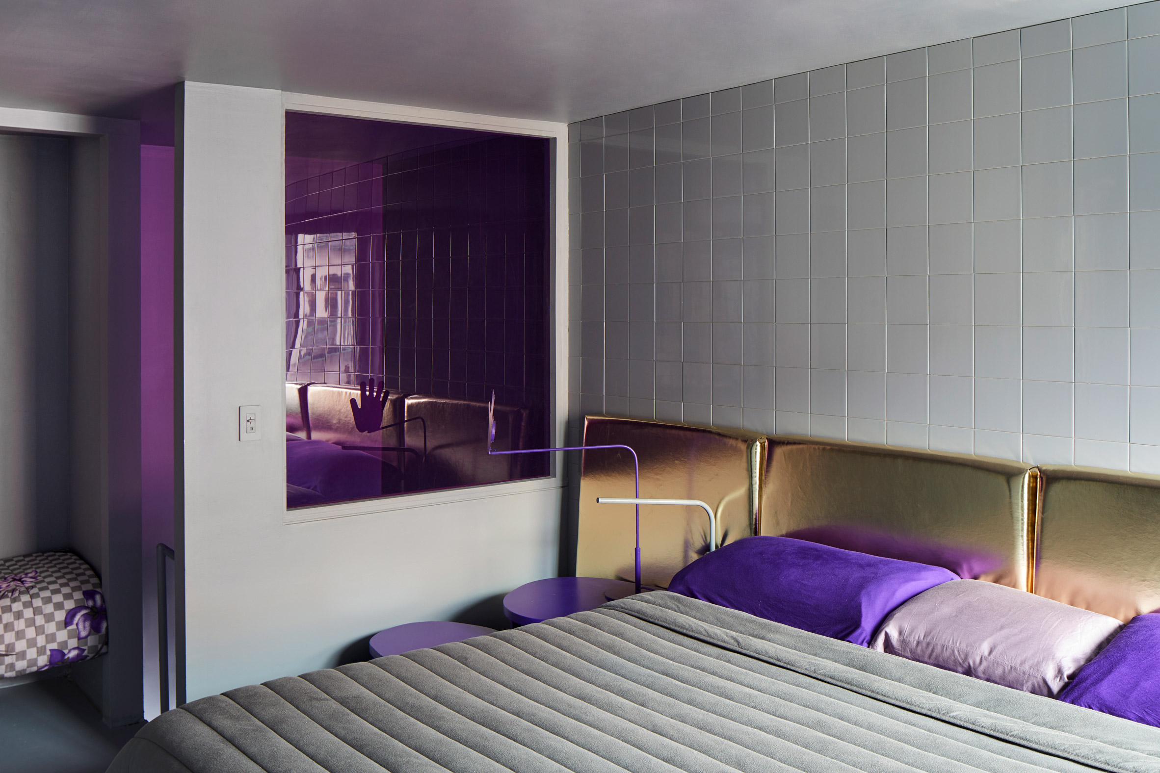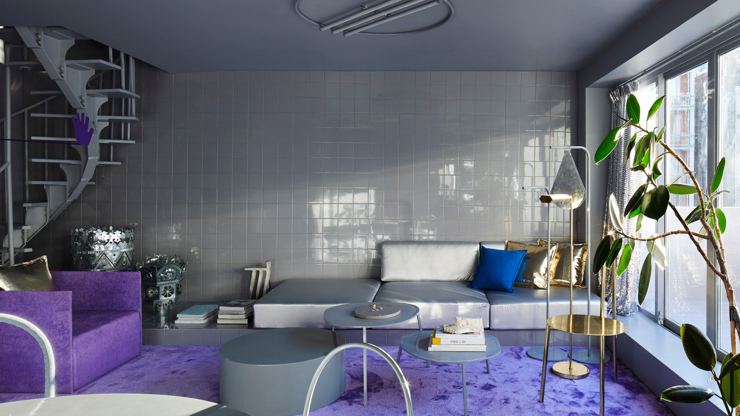 该住宅有两层,起居室位于较低楼层,卧室位于上方。该设计的其他功能还包括:螺旋形金属楼梯,一个开放式搁架,用于展示鞋子以及几个大的矩形切口,这些切口填充有透明的紫罗兰色玻璃,可在周围反映颜色。与孟买设计工作室Hatsu合作设计的陶瓷方砖覆盖了整个室内的地板和墙壁。Nuriev的许多以前的装置和收藏品都用于装饰空间。它们包括抽象形状的紫色书柜,搁架单元和用反复出现的手形装饰的桌子,这是他与时尚品牌Opening Ceremony合作的一部分。