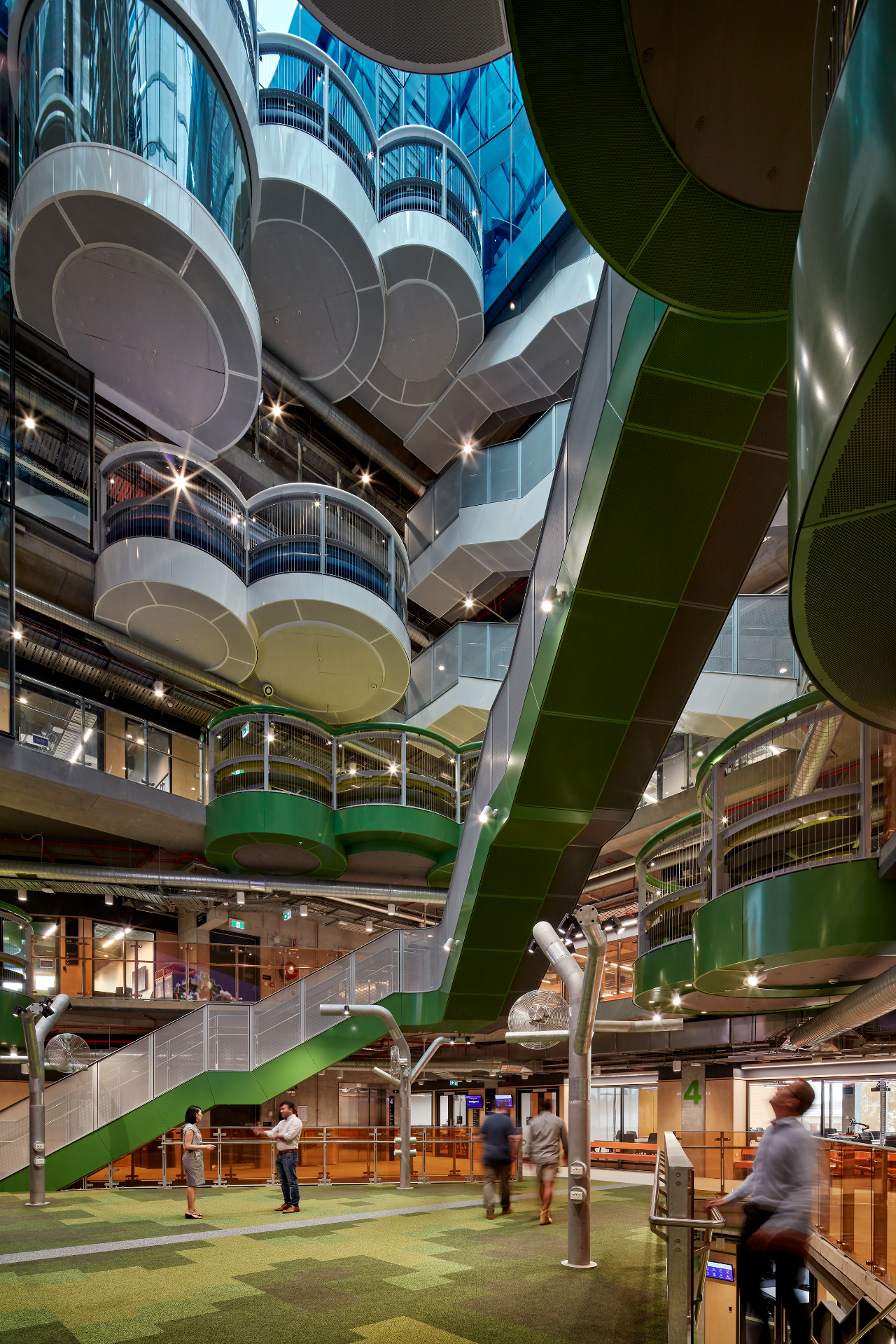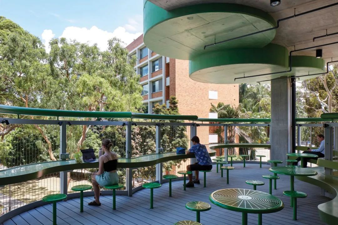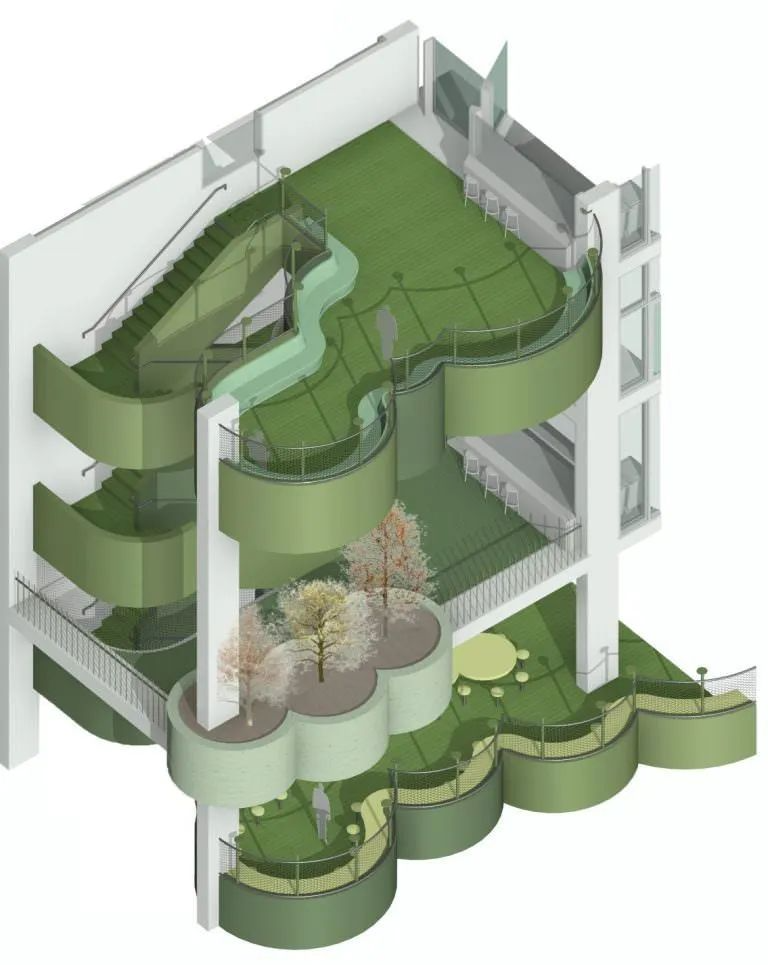 上方的绿色圆形阳台,是连通着楼梯的学习共享协作空间。