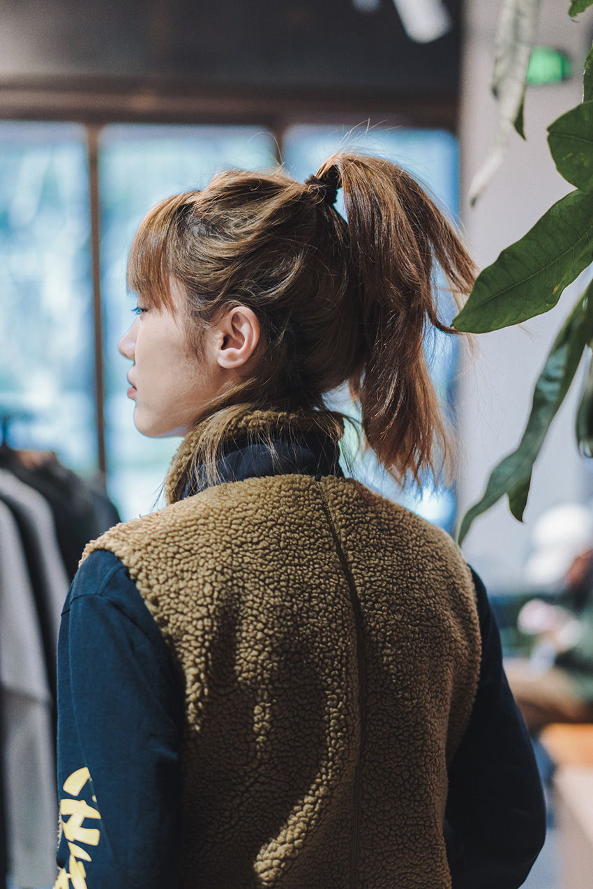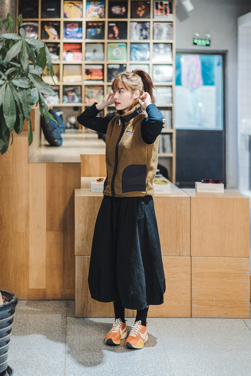 摇粒绒材质马甲内搭CHINAFORNIA字母印花长袖TEE,配合独特剪裁微蓬长裙,轻松拉长身材比例。橘色球鞋为整体暖色调搭配添加了亮眼的一笔。率性又甜美,慵懒又不失俏皮。
