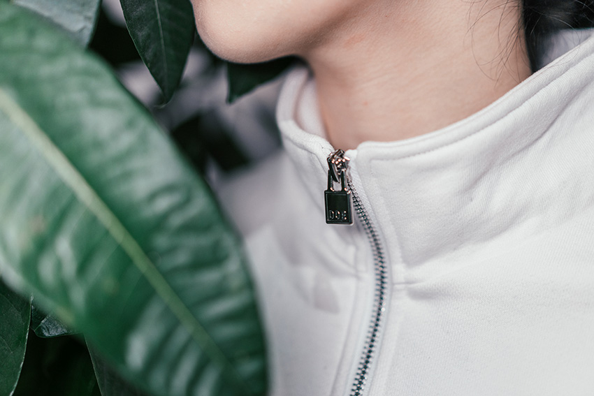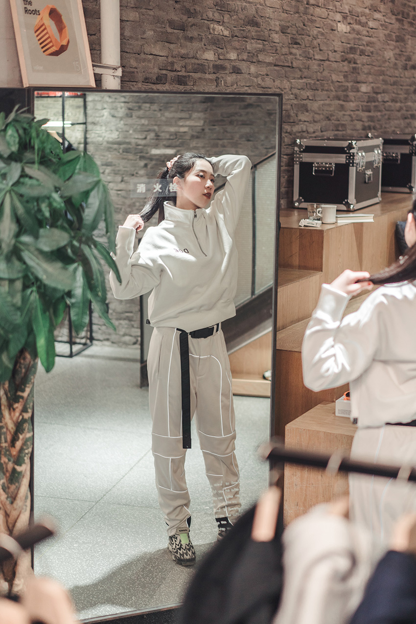 冷冽率性WHITE ON WHITE运动风组搭可以在灰色基调的连绵的阴雨天里达到让人不禁眼前一亮的提神效果。以黑色腰带分割出身材比例,利落的马尾也可在潮湿的天气里为干练气场再加一分。
