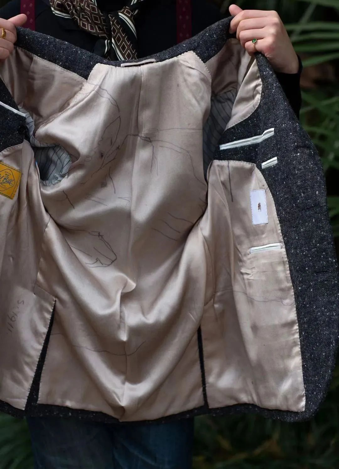 有趣的是,我现在所有衣服都用金色里布,但大海觉得纯粹金色未免有点无趣,她恰好有一副Econ Schiele的手稿印制的暗金色里布,就用在了这套衣服上。