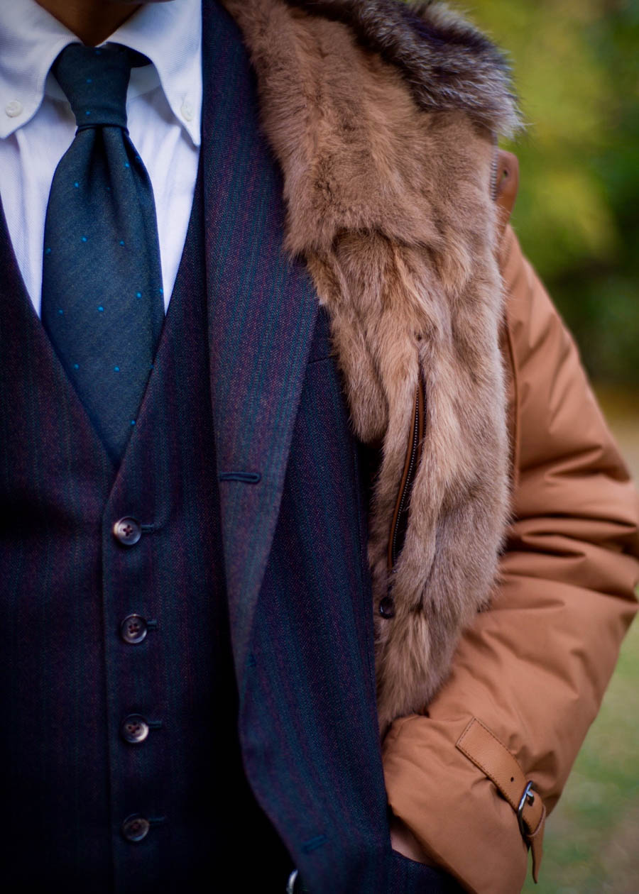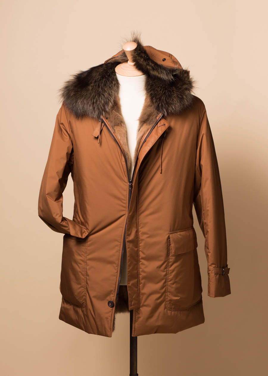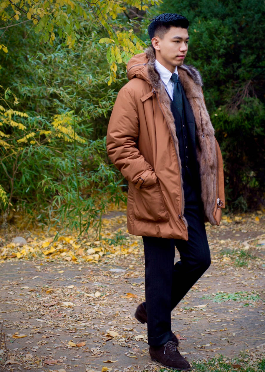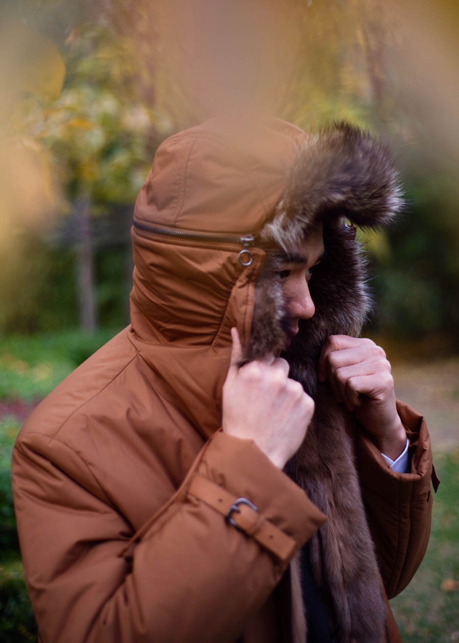 经典男装套装大多为蓝灰棕,整体色系相对较深,所以在配色上选择了这款浅棕,大色块提亮整体的视觉冲击,再加上内部皮草细腻的质感,与整个Look浑然一体。内部的幼貂毛和鹅绒填充可以给到足够的温暖,外部的尼龙也足够实用更好打理。