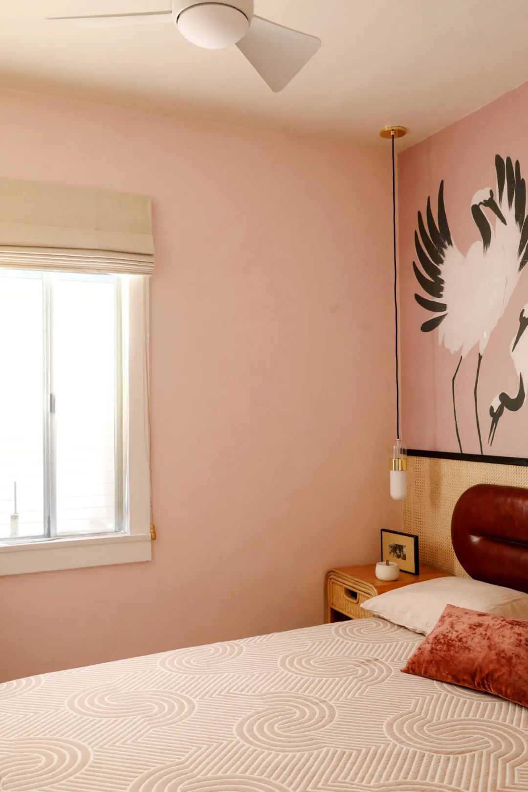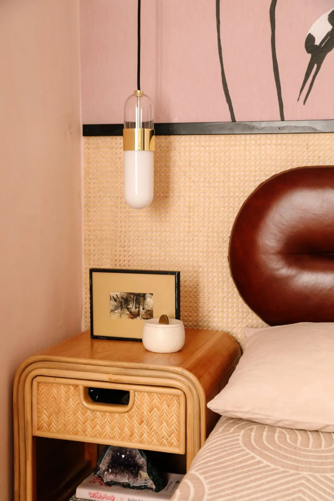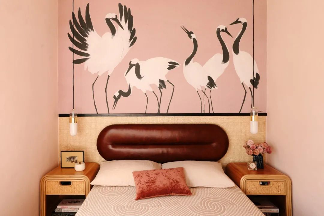 仙鹤图案壁纸给卧室定下了一个大的设计基调,它带出了灰粉色整体环境的高级感。药丸形状吊灯和皮质床头形状接近,它们增添了复古情怀中的趣味性。床头柜下放着紫水晶洞,它被用来改变卧室的磁场。或许,暗涌的质感会提高睡眠的满意程度。