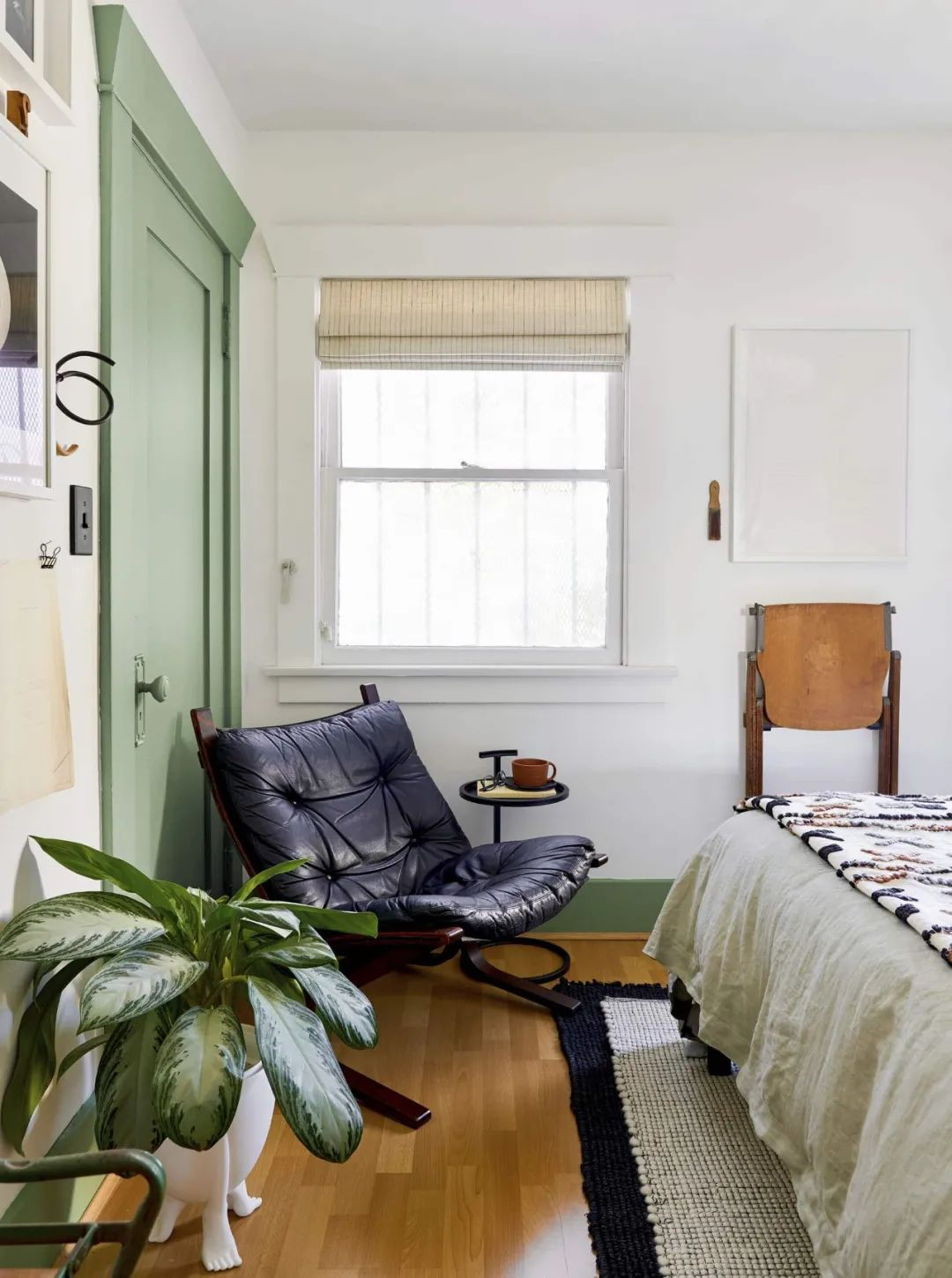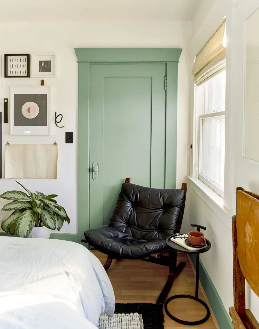 除了床头板紧靠的墙面,我们也可以把木门和卧室墙面的地脚线漆一下。虽然绿色是一种适合卧室的色彩,但我们不能让它布满整个休息区域,可以用白色和简单的木质家具来进行平衡。